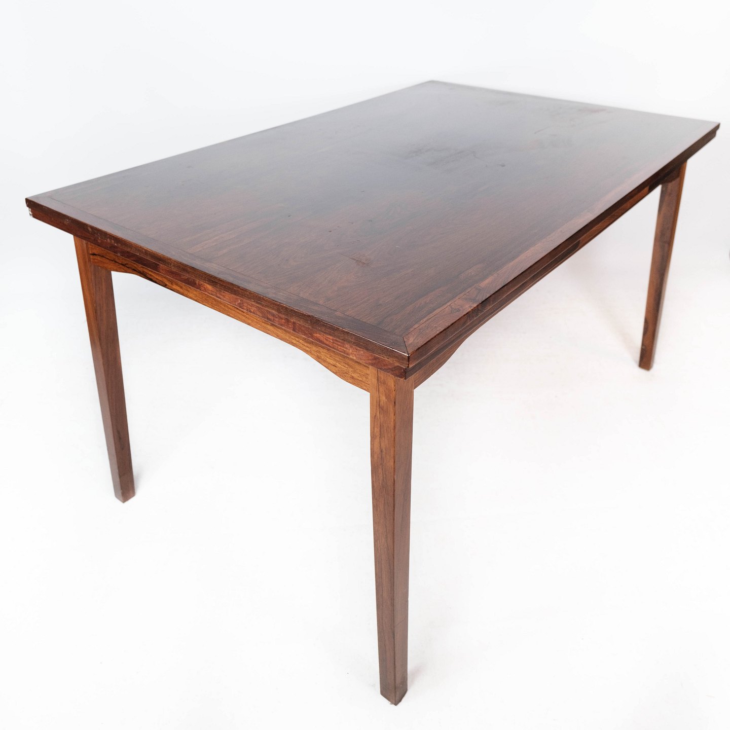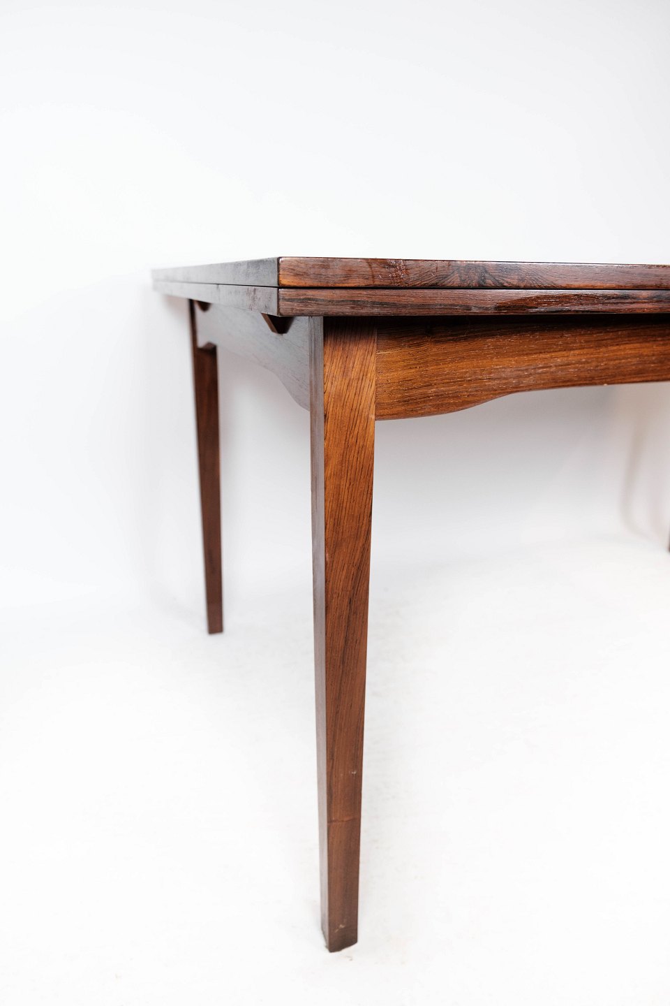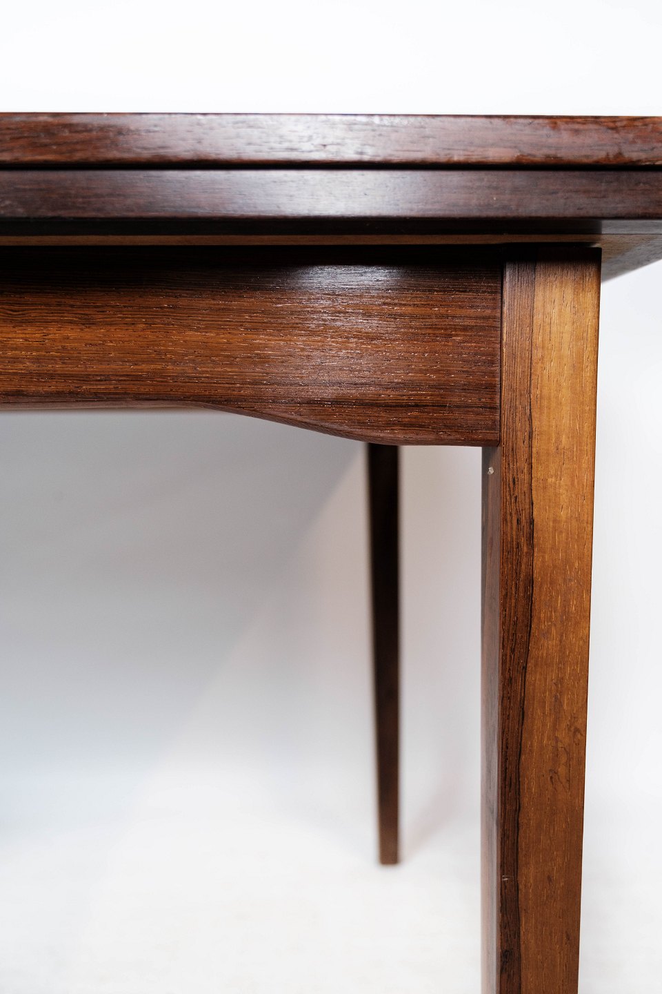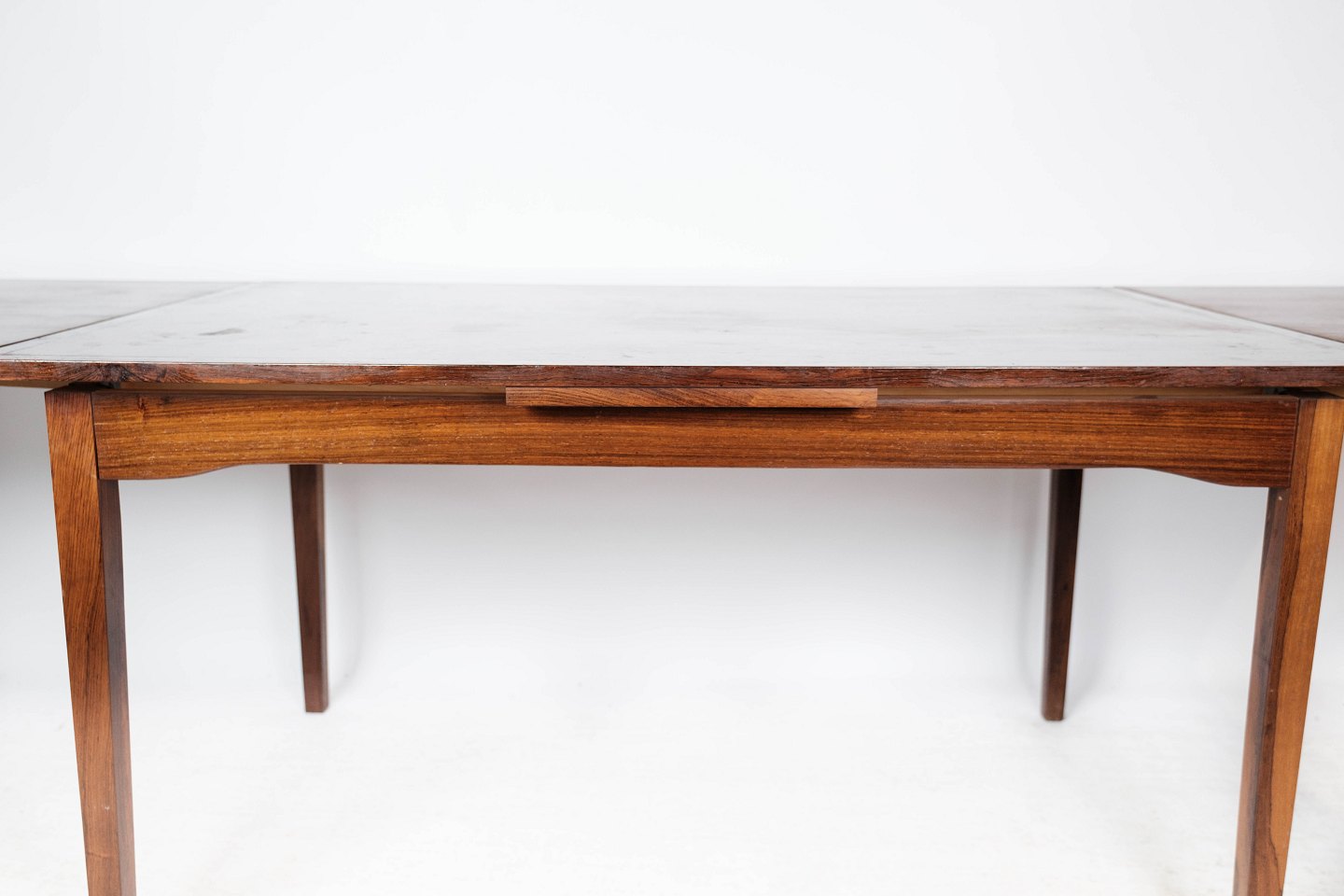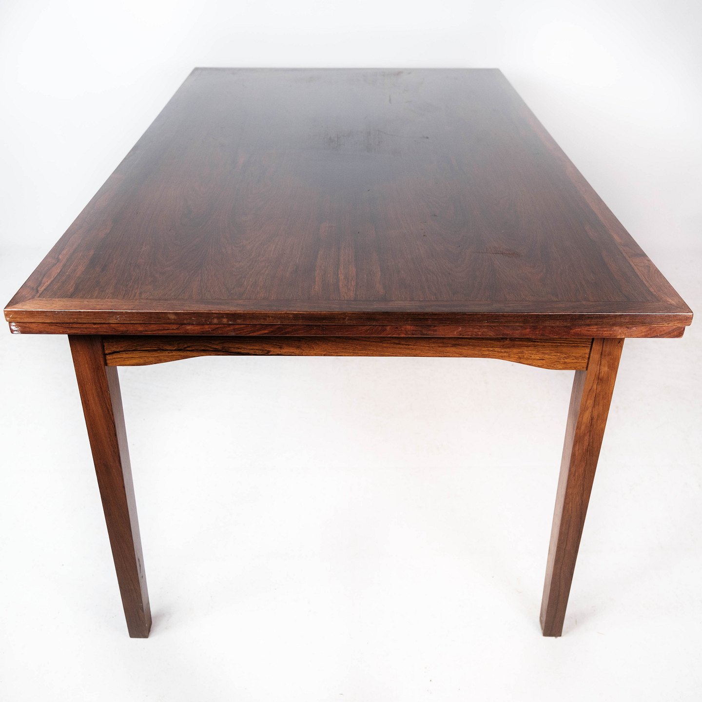 This 1960s rosewood dining table is a beautiful and functional addition to any dining room. With its simple design and pull-out function, it offers extra space for your guests when needed.