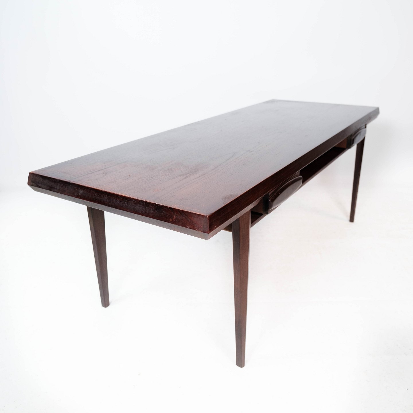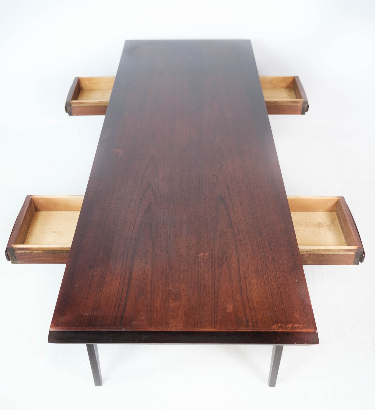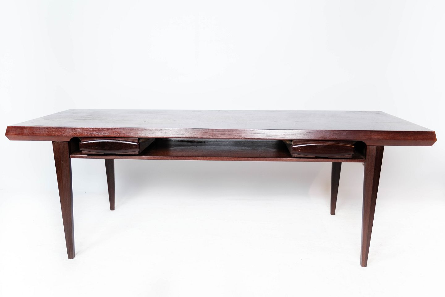Sofabord i teak med skuffer, af dansk design fra 1960erne. Bordet er i flot brugt stand.