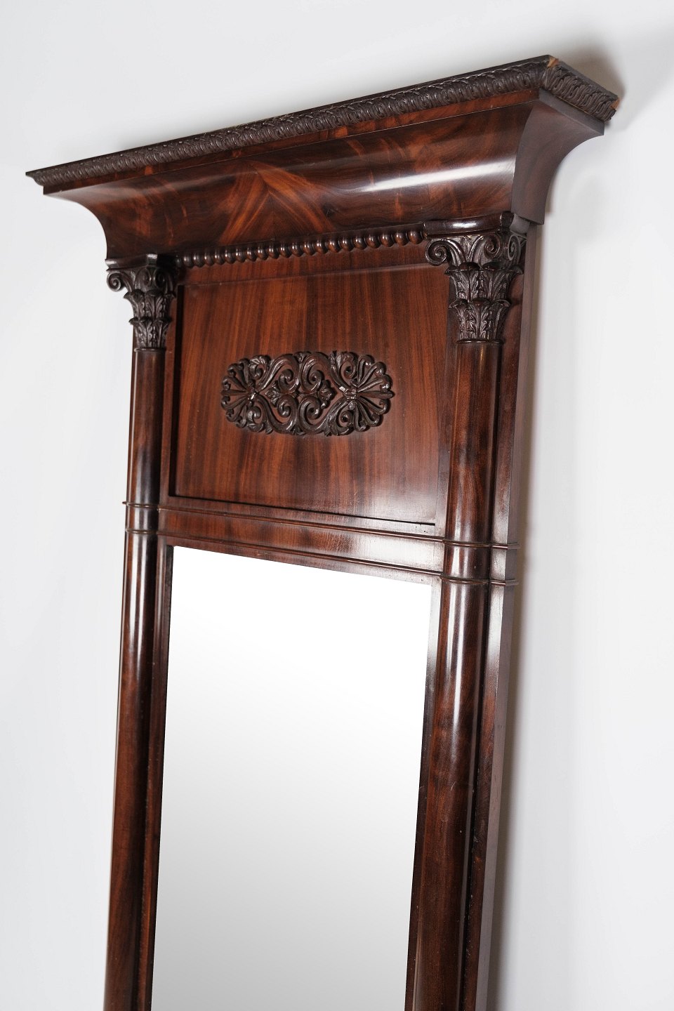Tall mirror of mahogany with carvings, in great antique condition from around 1840.