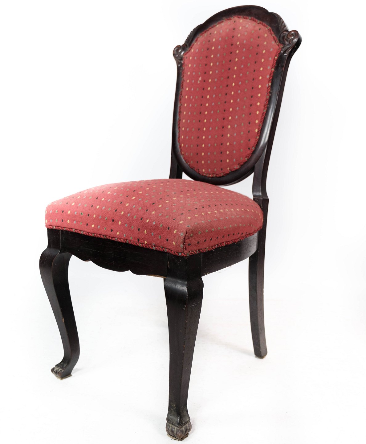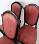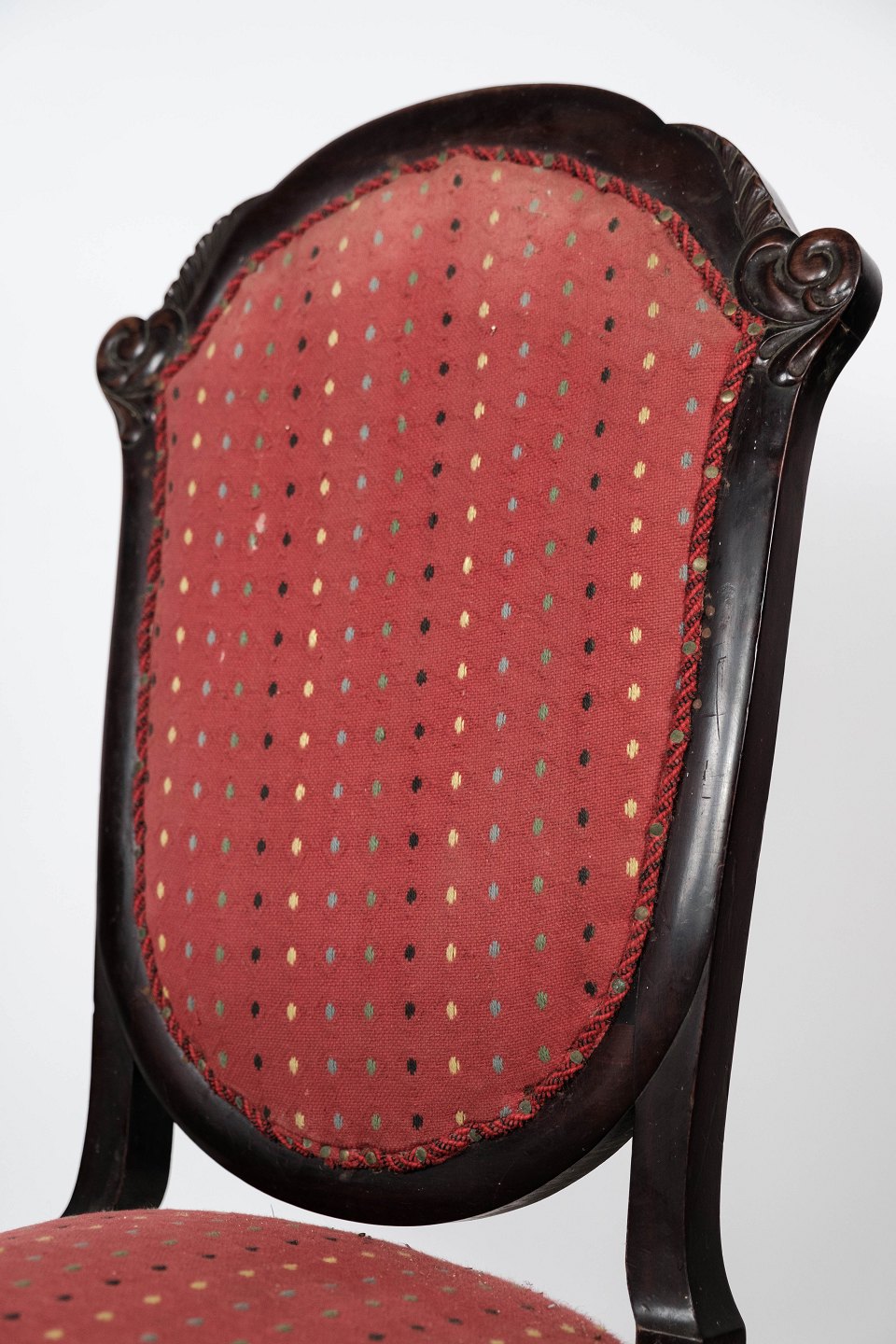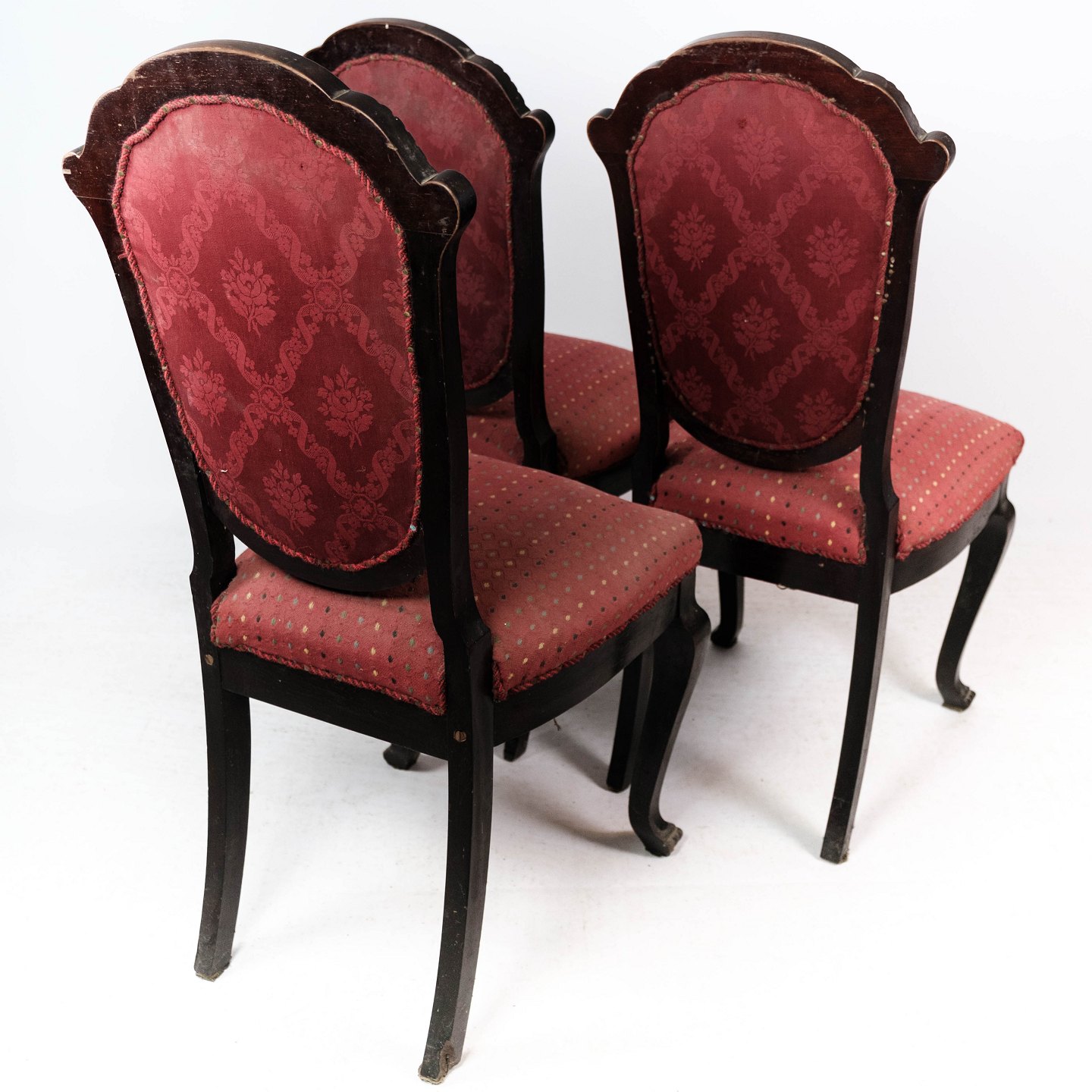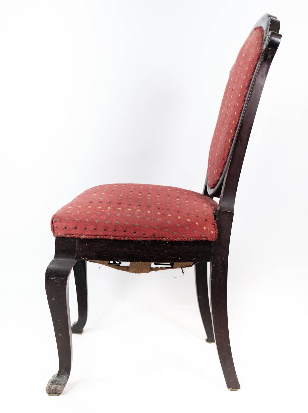 Set of three dining room chairs of mahogany and upholstered with red fabric from around 1920. The chairs are in great vintage condition.
