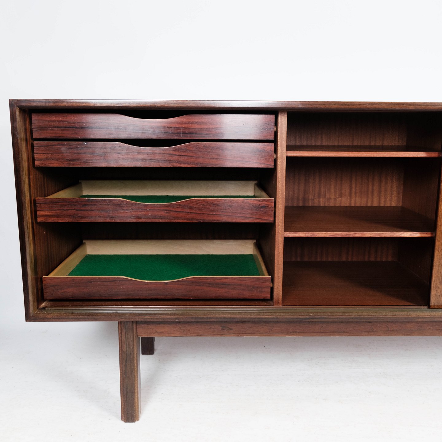 Skænk designet af Gunni Omann, model 21, fra 1960’erne. Udført i palisander og produceret af Omann Jun’s Møbelfabrik. Et eftertragtet dansk designmøbel med stor opbevaringsplads og elegant finish.