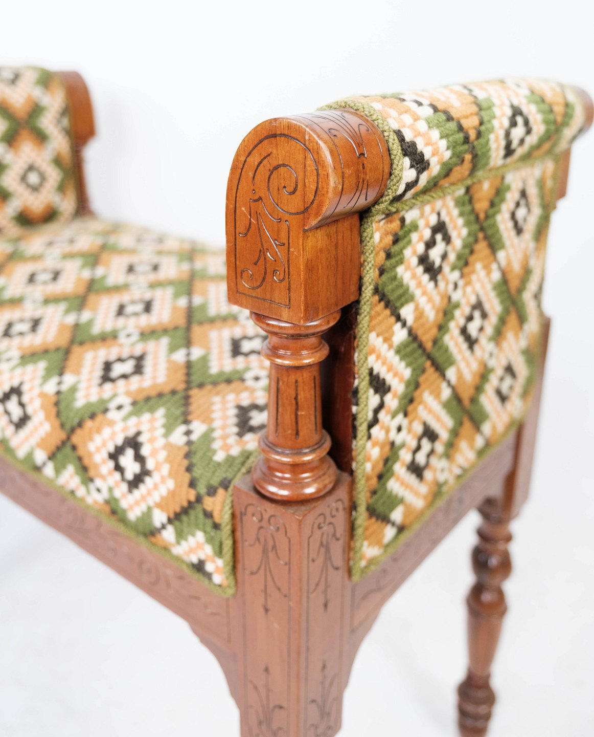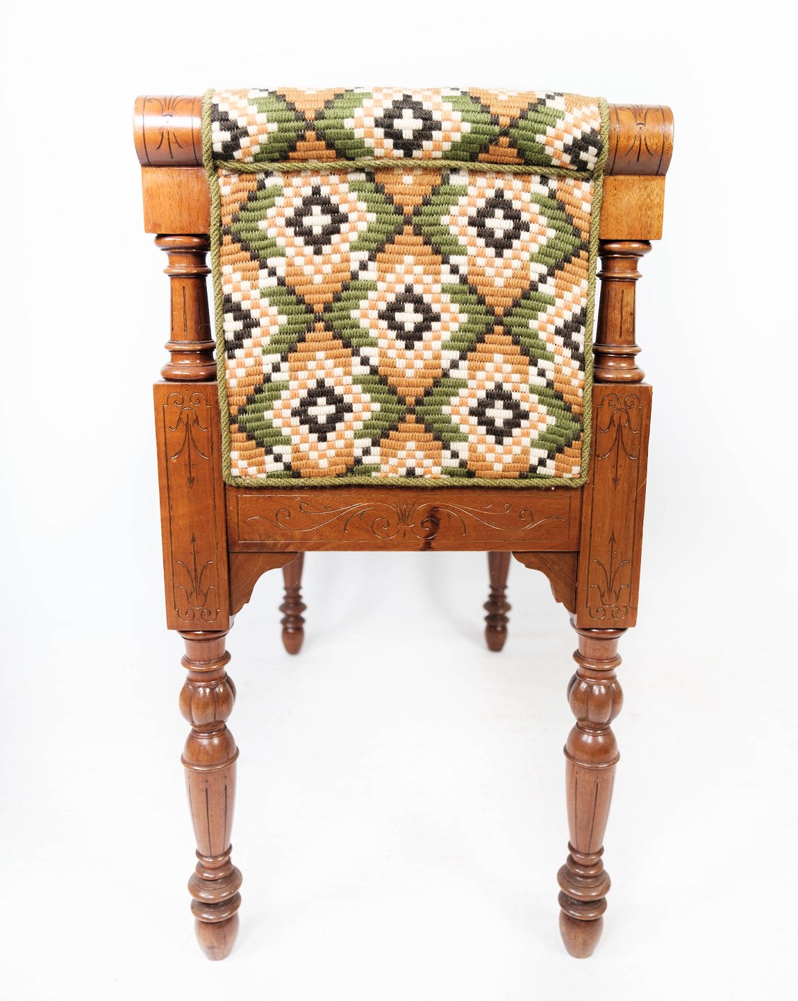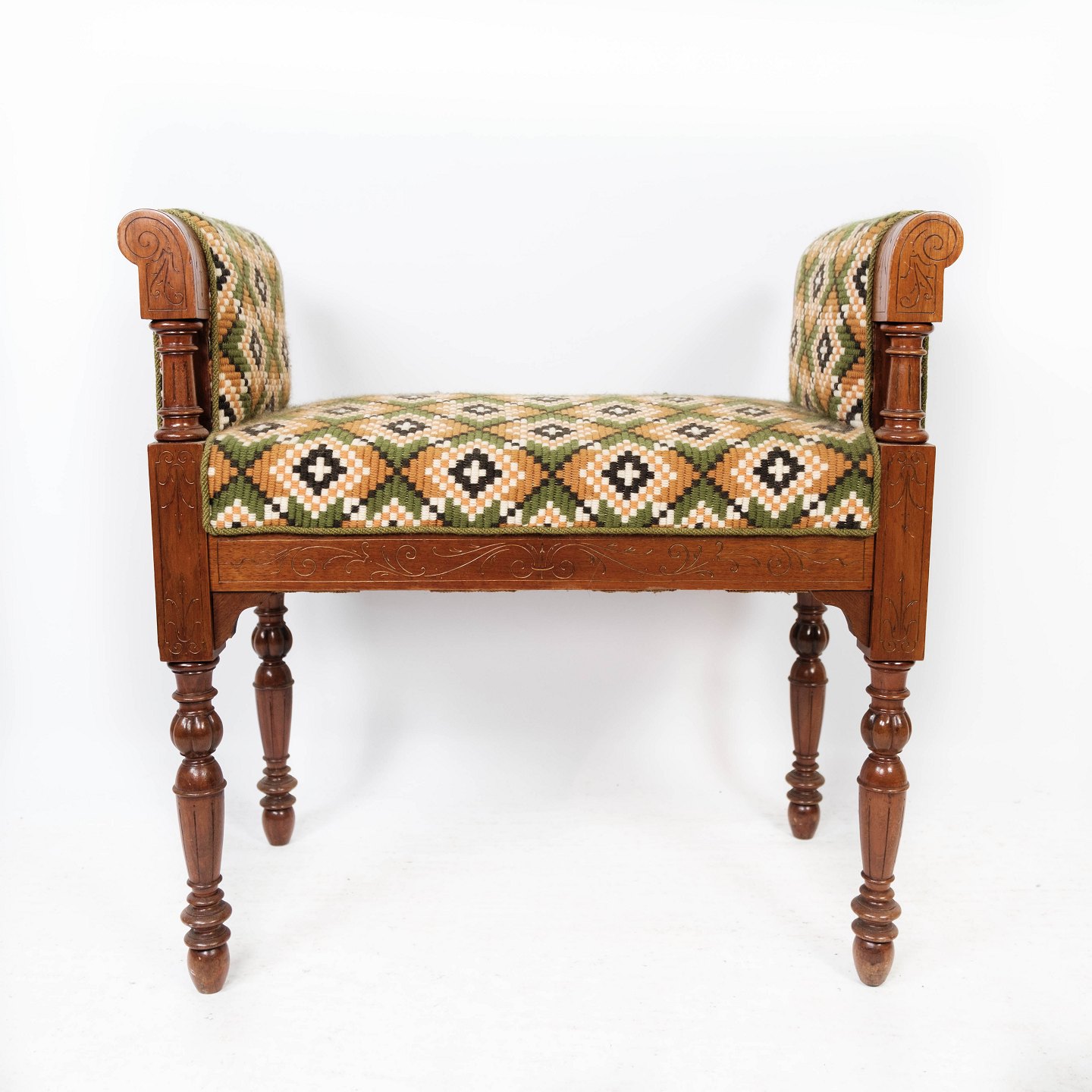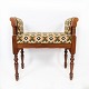 Piano bench of walnut and upholstered with patterned fabric, from the 1910s. The bench is in great antique condition.