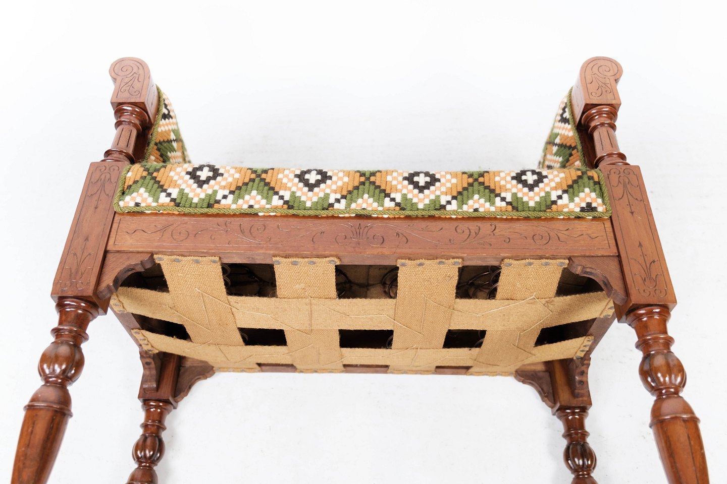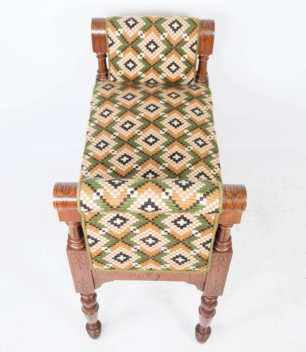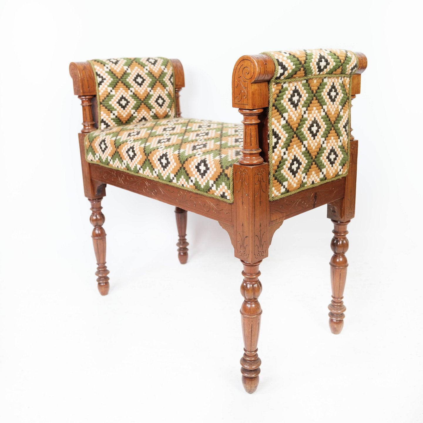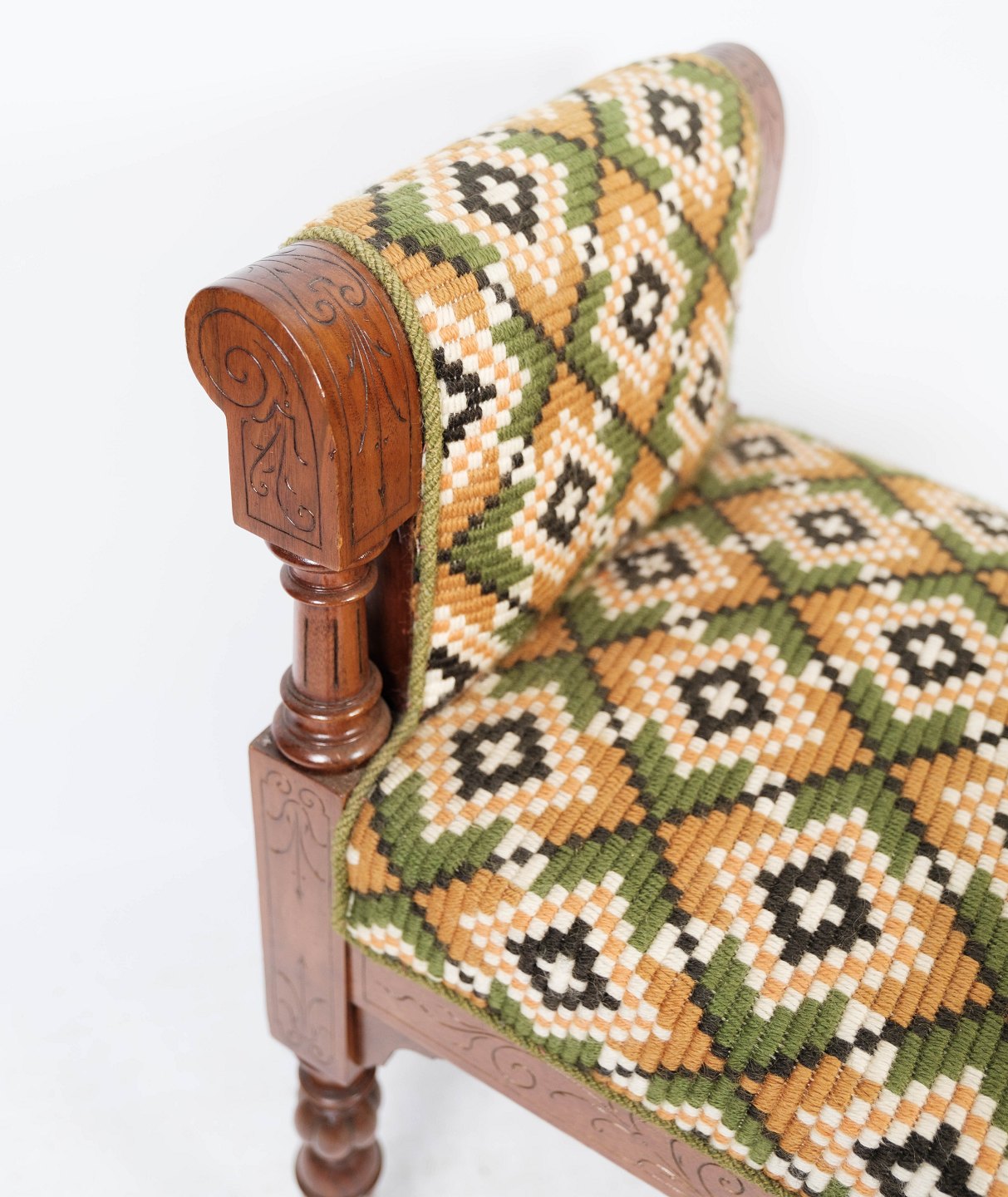 Piano bench of walnut and upholstered with patterned fabric, from the 1910s. The bench is in great antique condition.