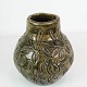 Keramikvasen med mørk glasur og et blomstret mønster repræsenterer det tidløse og karakteristiske design af dansk keramik fra 1960'erne.