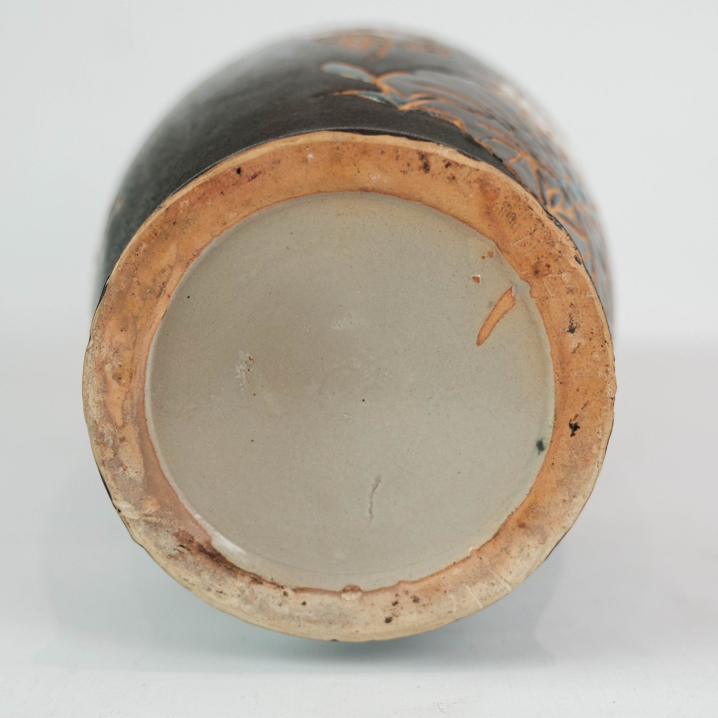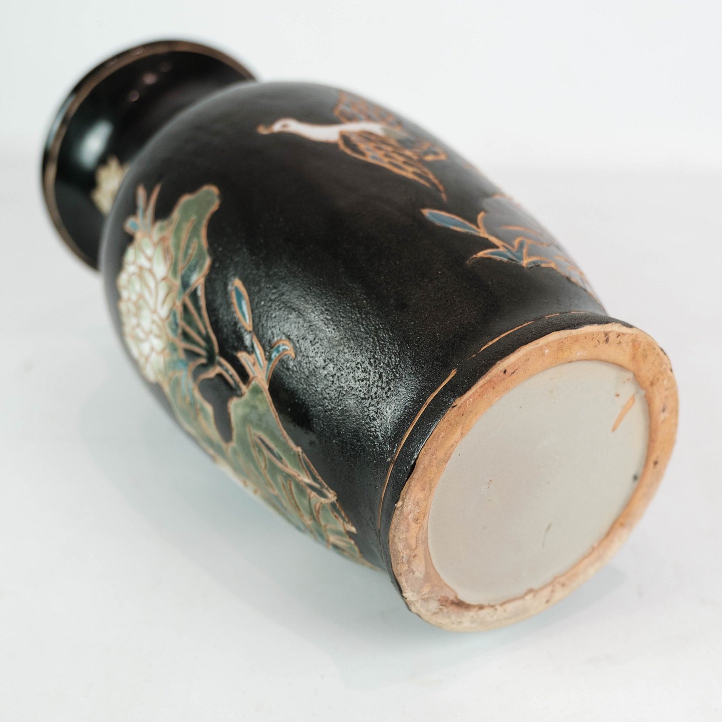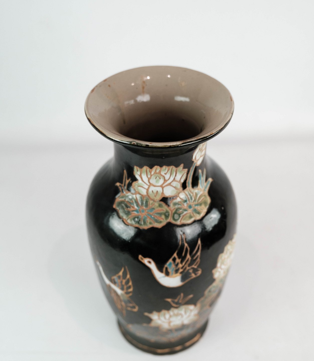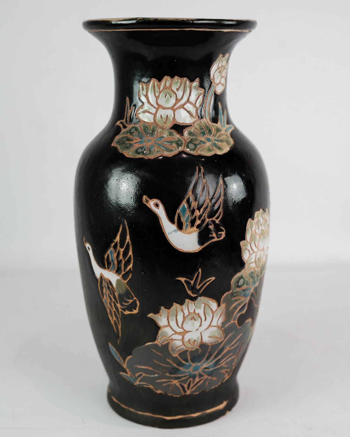 Keramik vase med sort glasur og dekoreret med blomster og fugle. Vasen er i flot brugt stand.