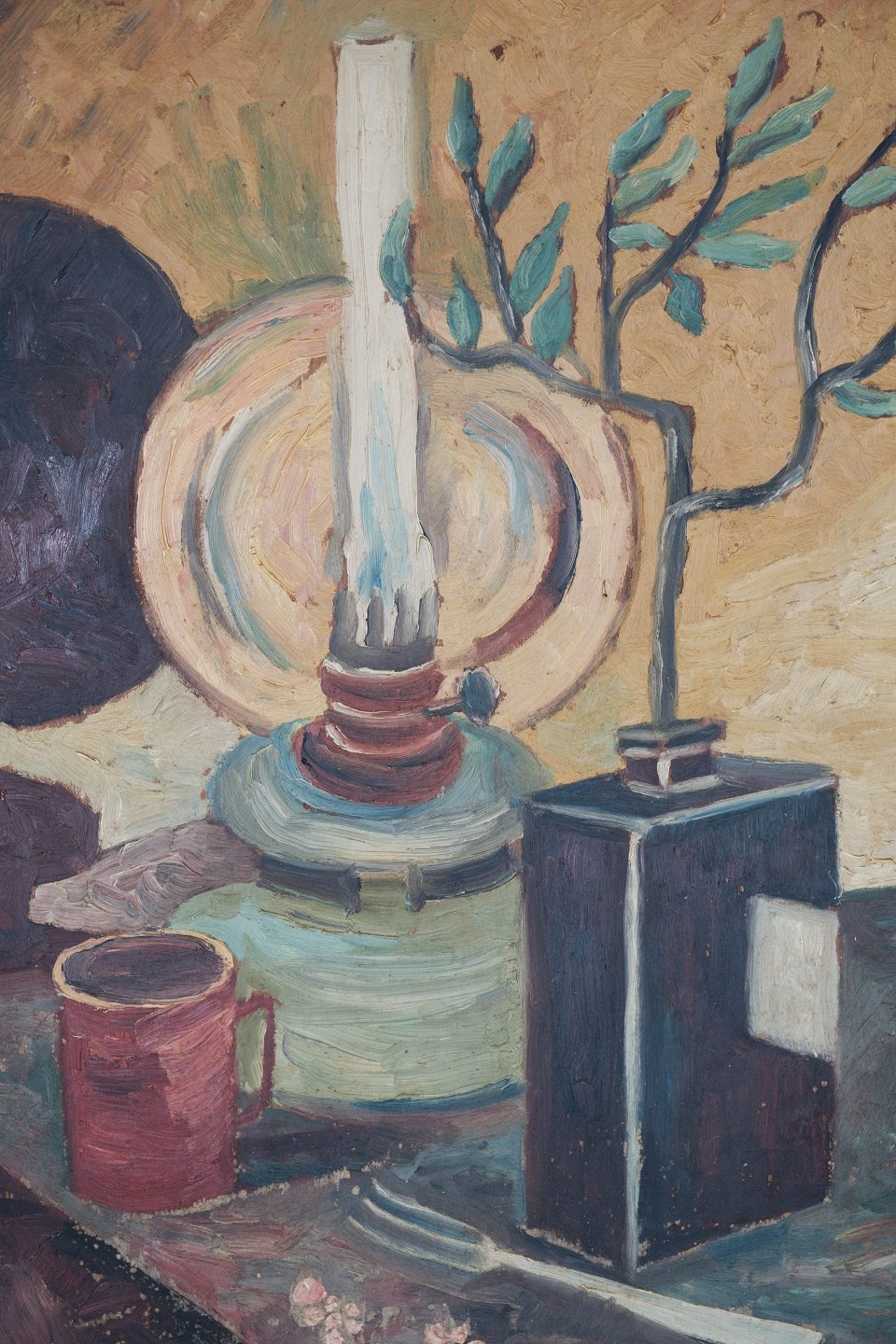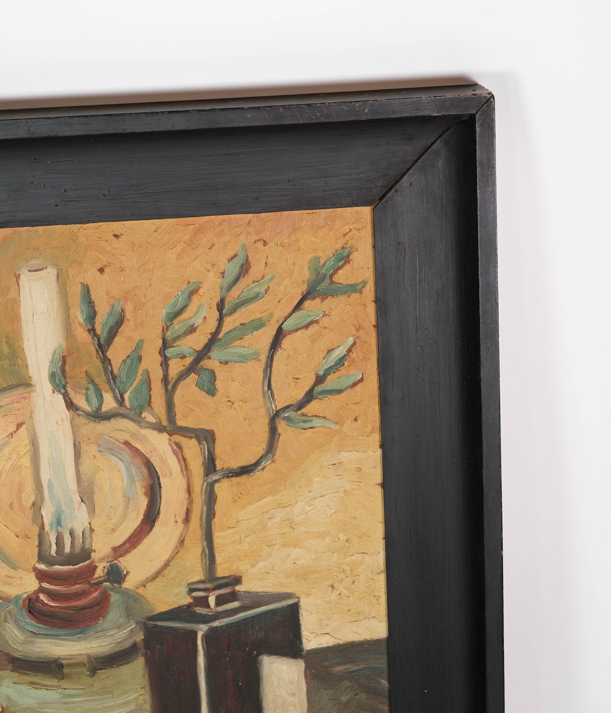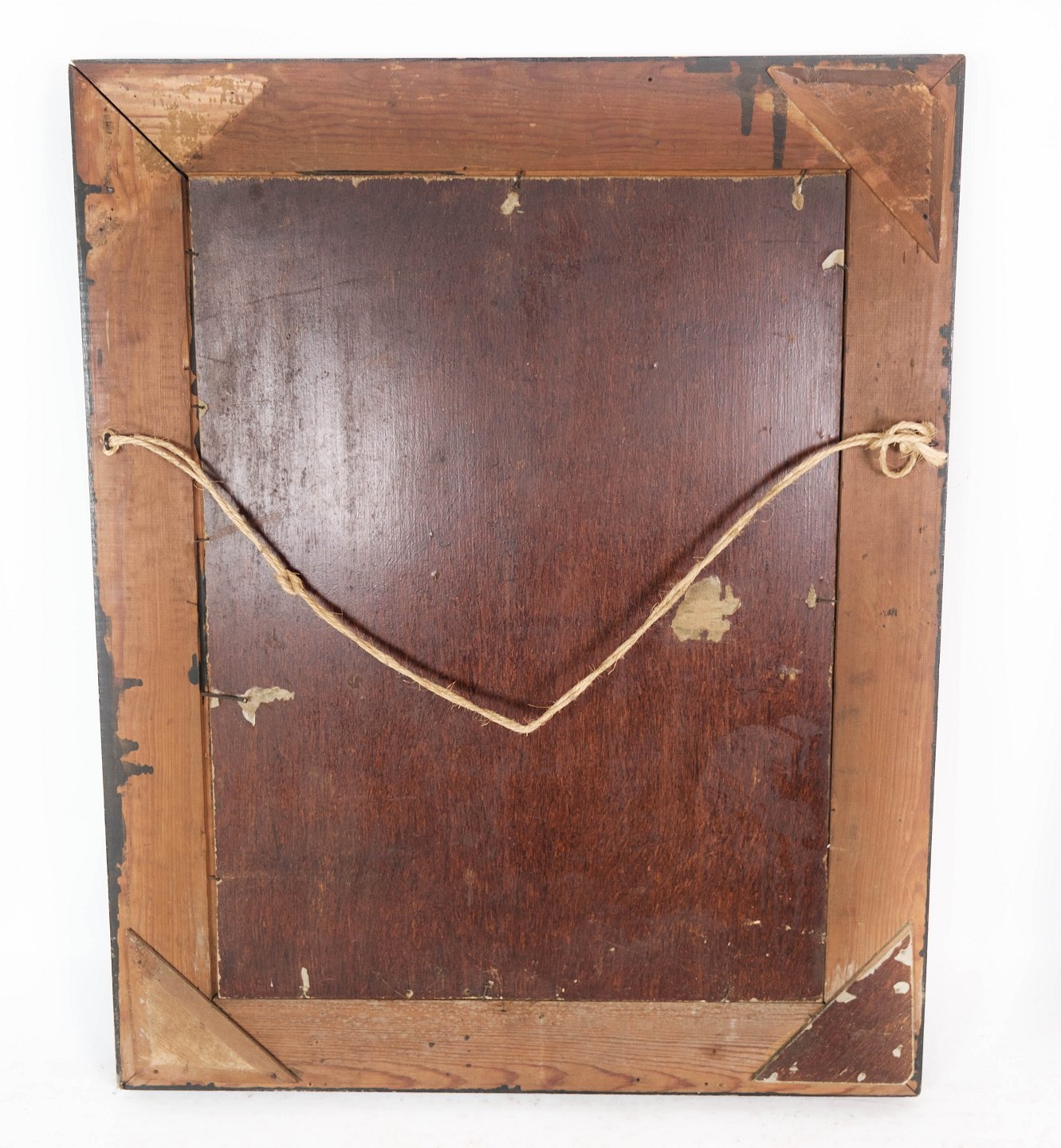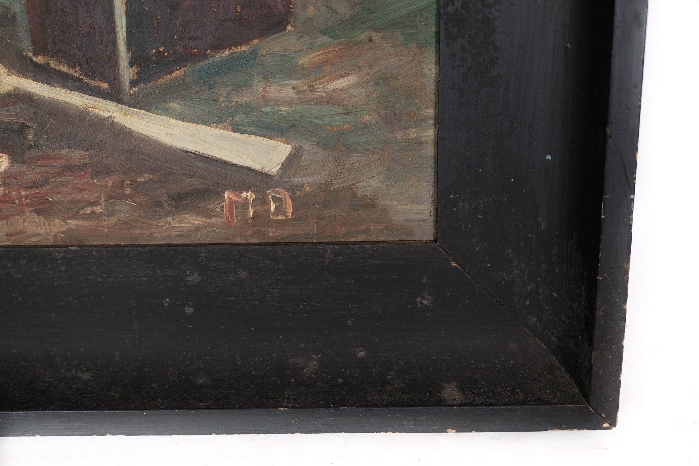 Painting on wood in dark colors with black frame, signed MD from the 1940s.