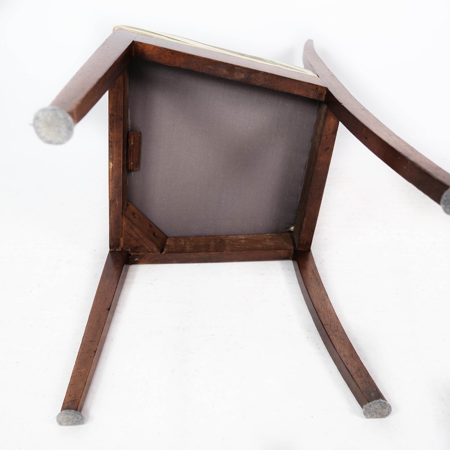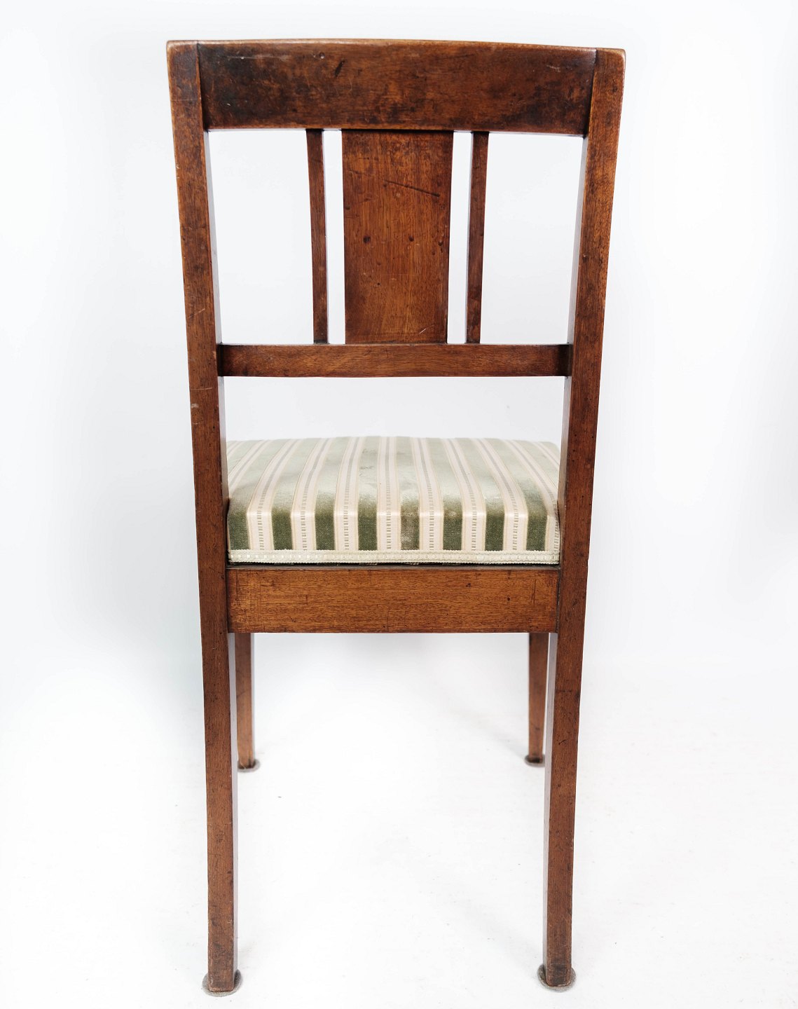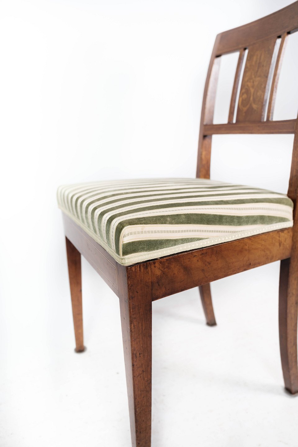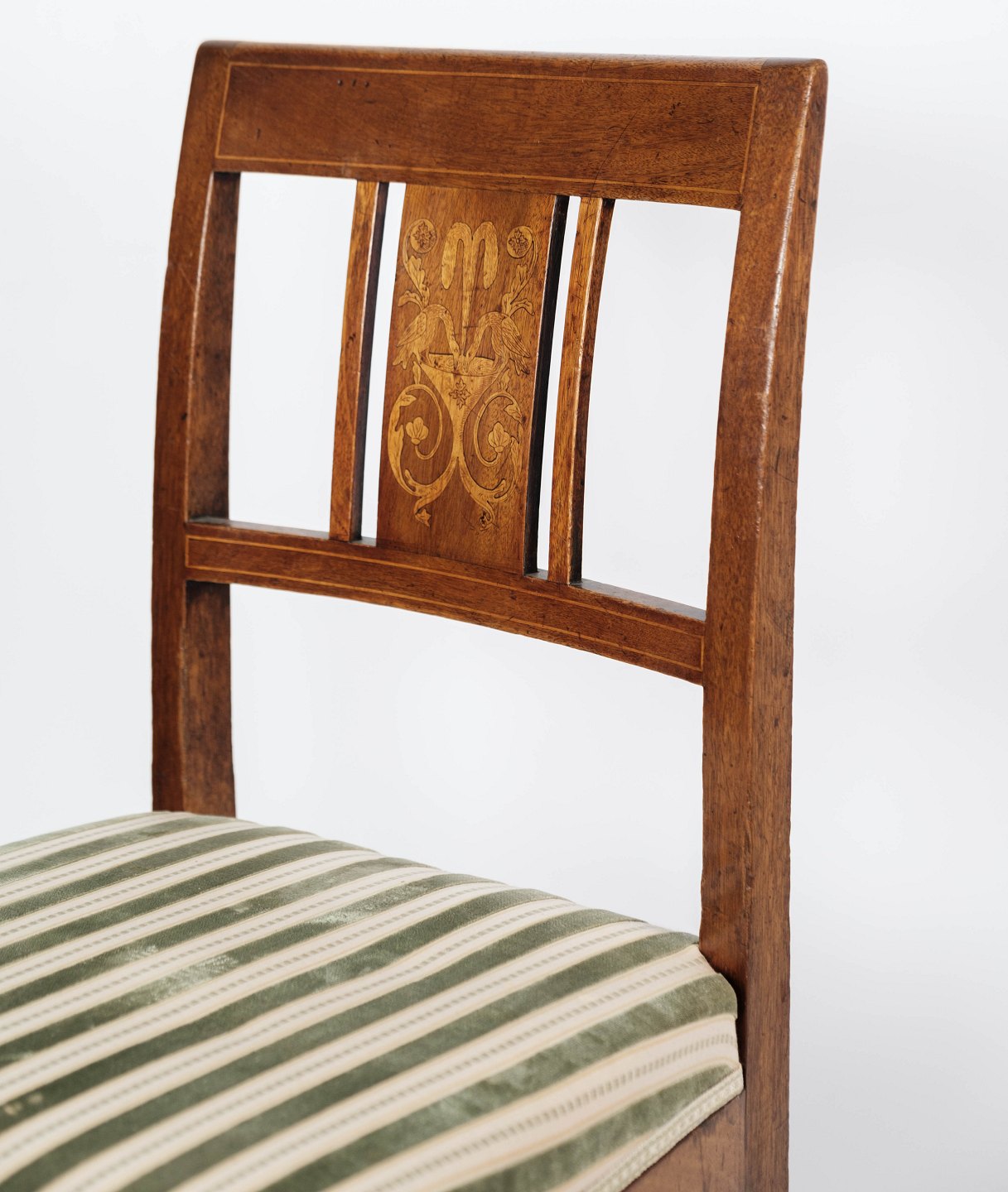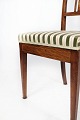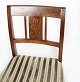 Spisestuestol af mahogni med intarsia og polstret med stribet stof fra 1920erne.