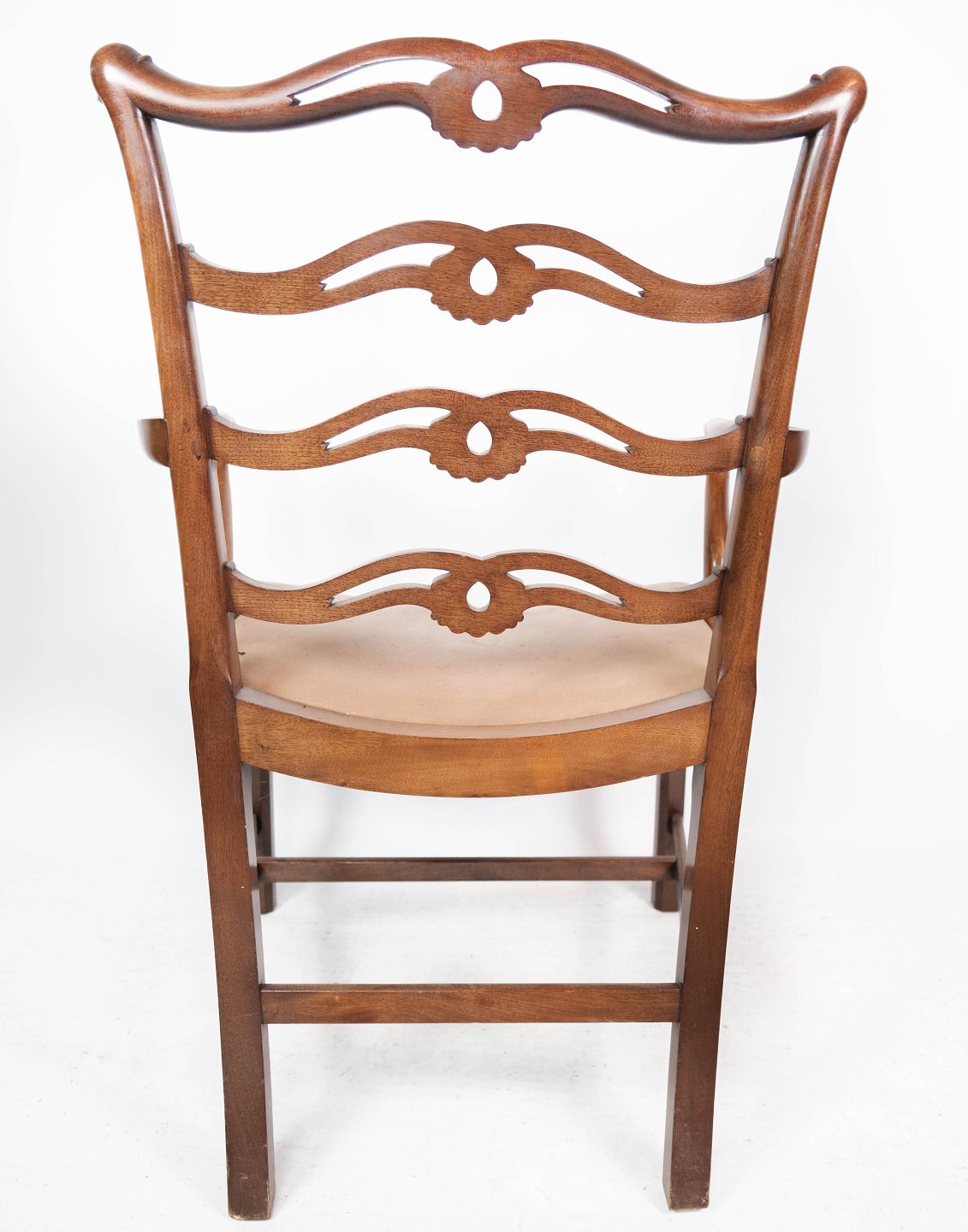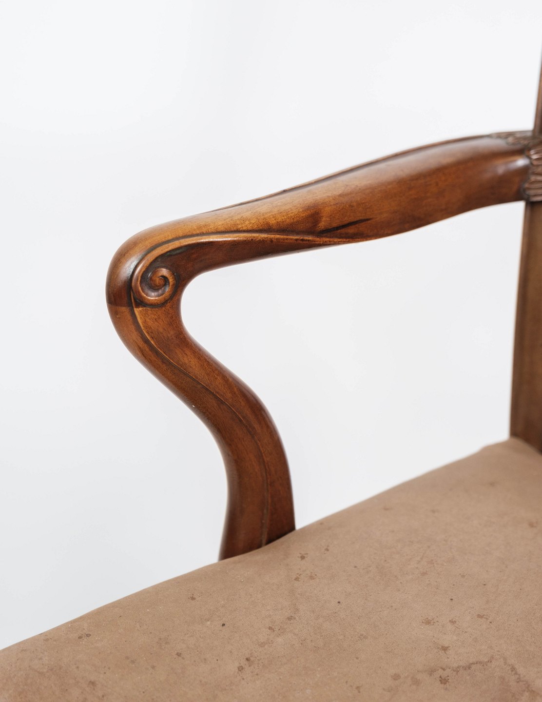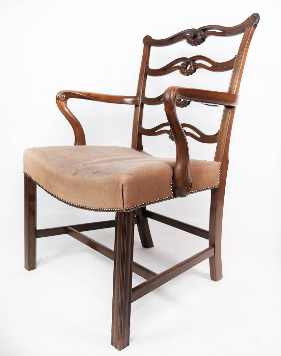 Antique armchair of mahogany and with original upholstery of light fabric from the 1880s.