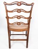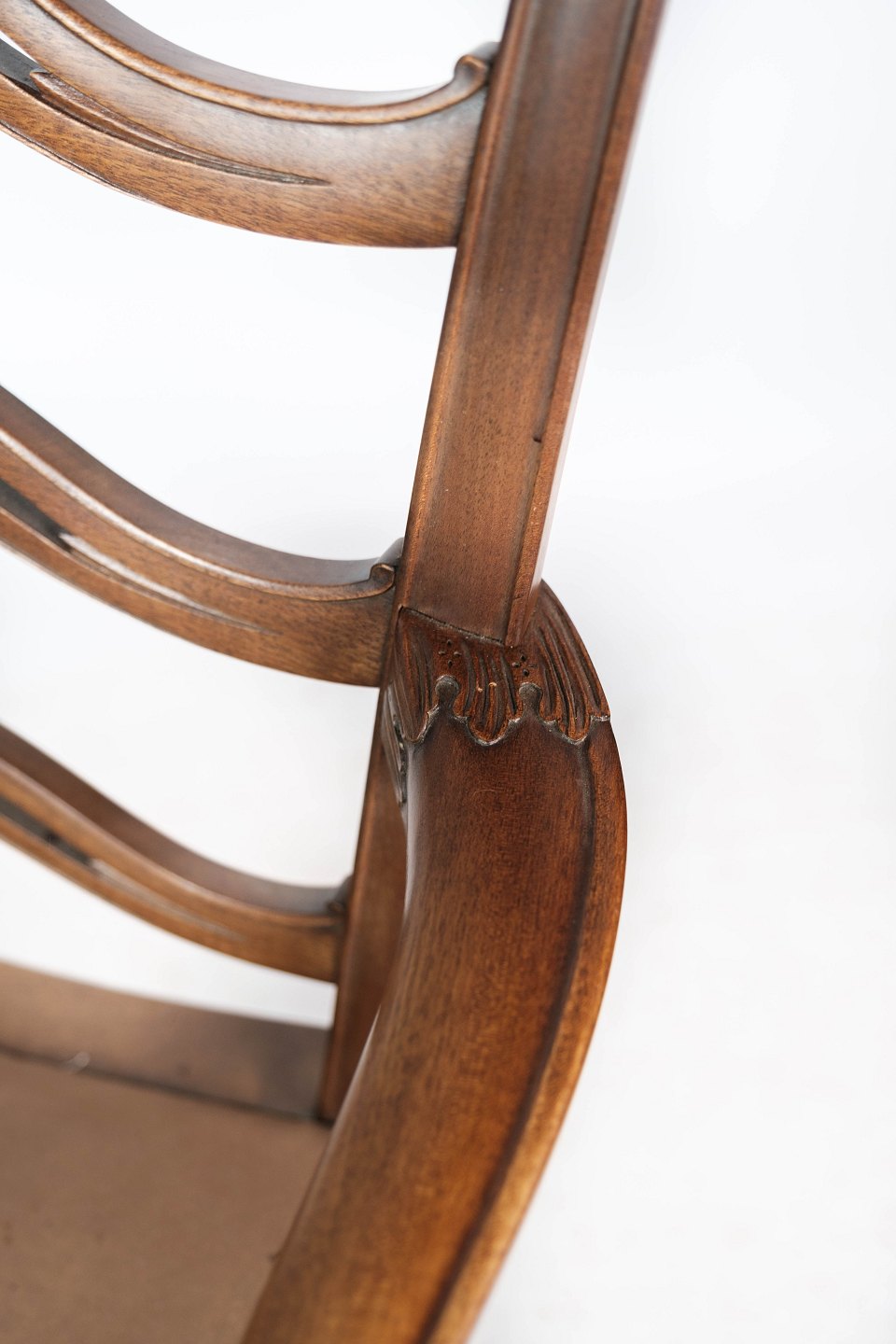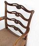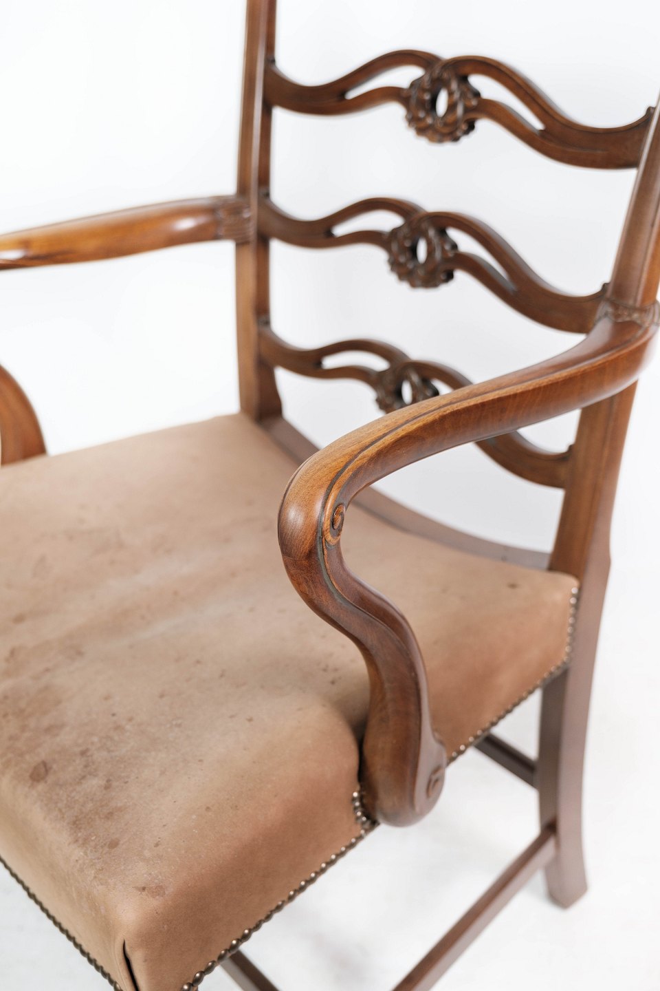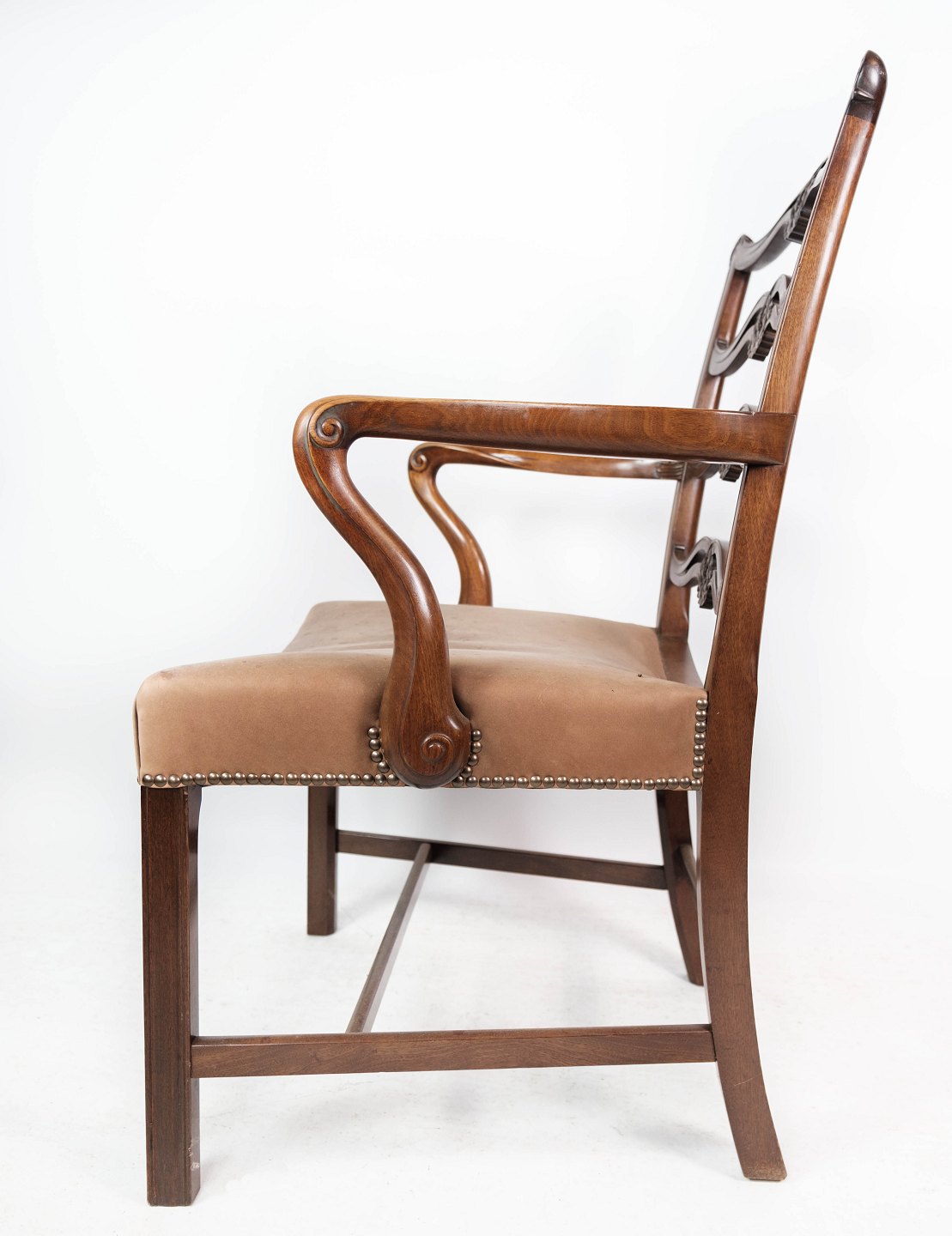 Antique armchair of mahogany and with original upholstery of light fabric from the 1880s.