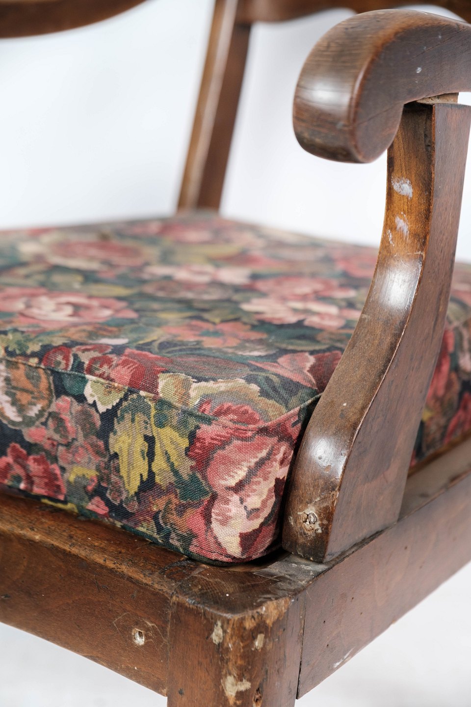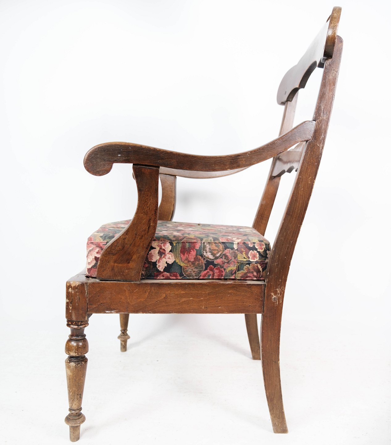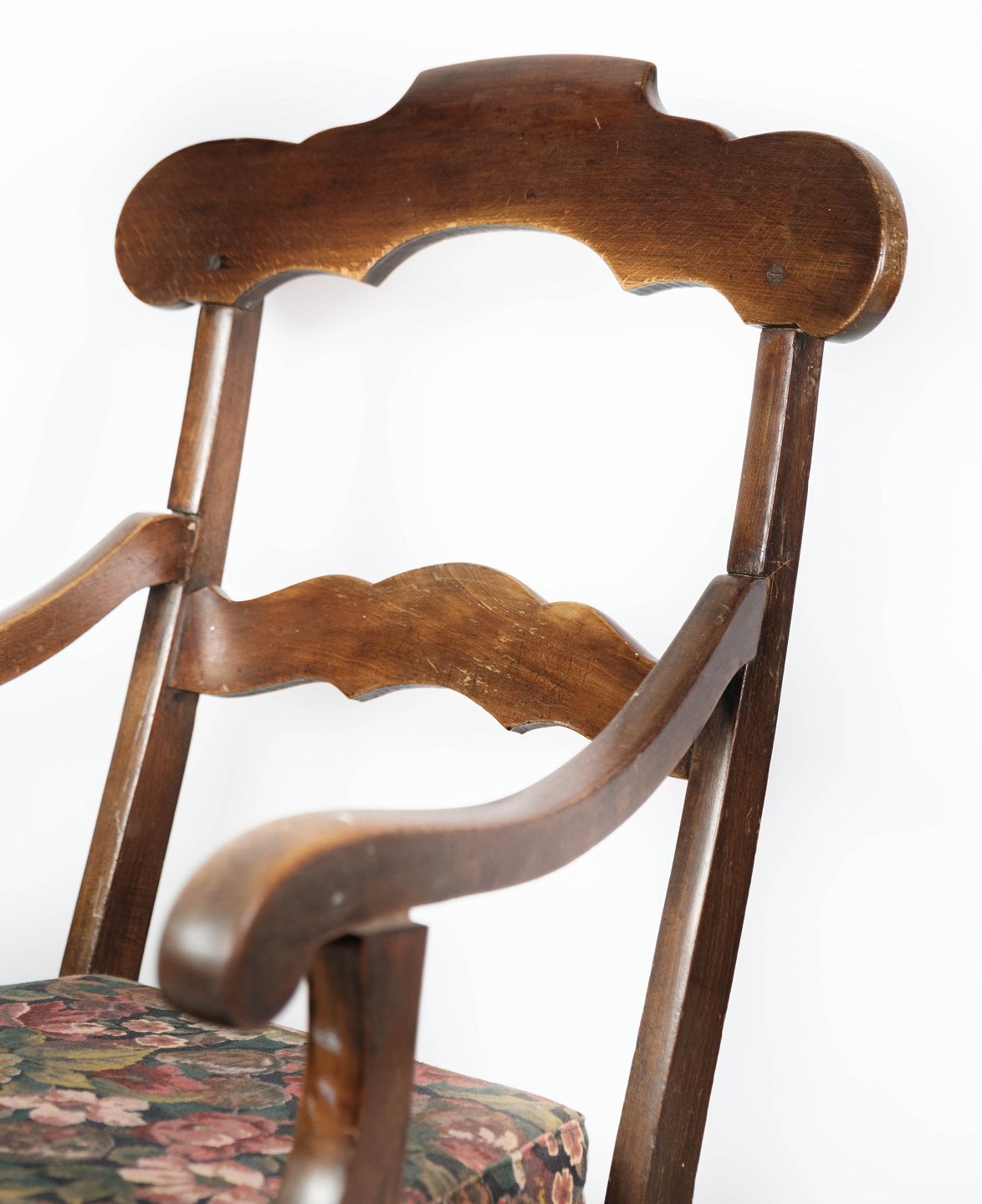 Antique armchair of mahogany and upholstered with floral fabric from the 1880s.
