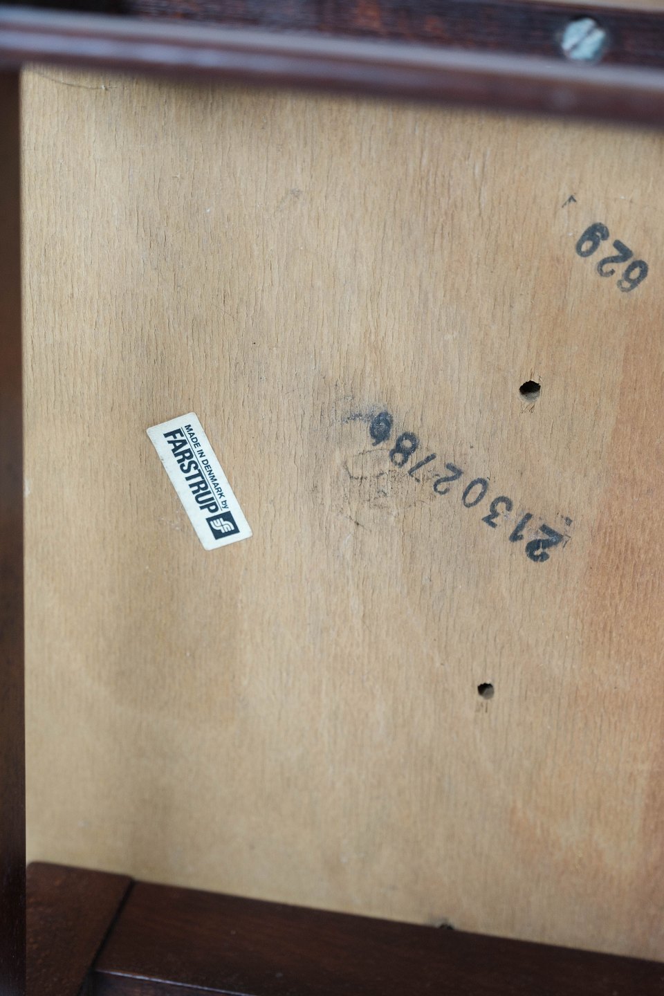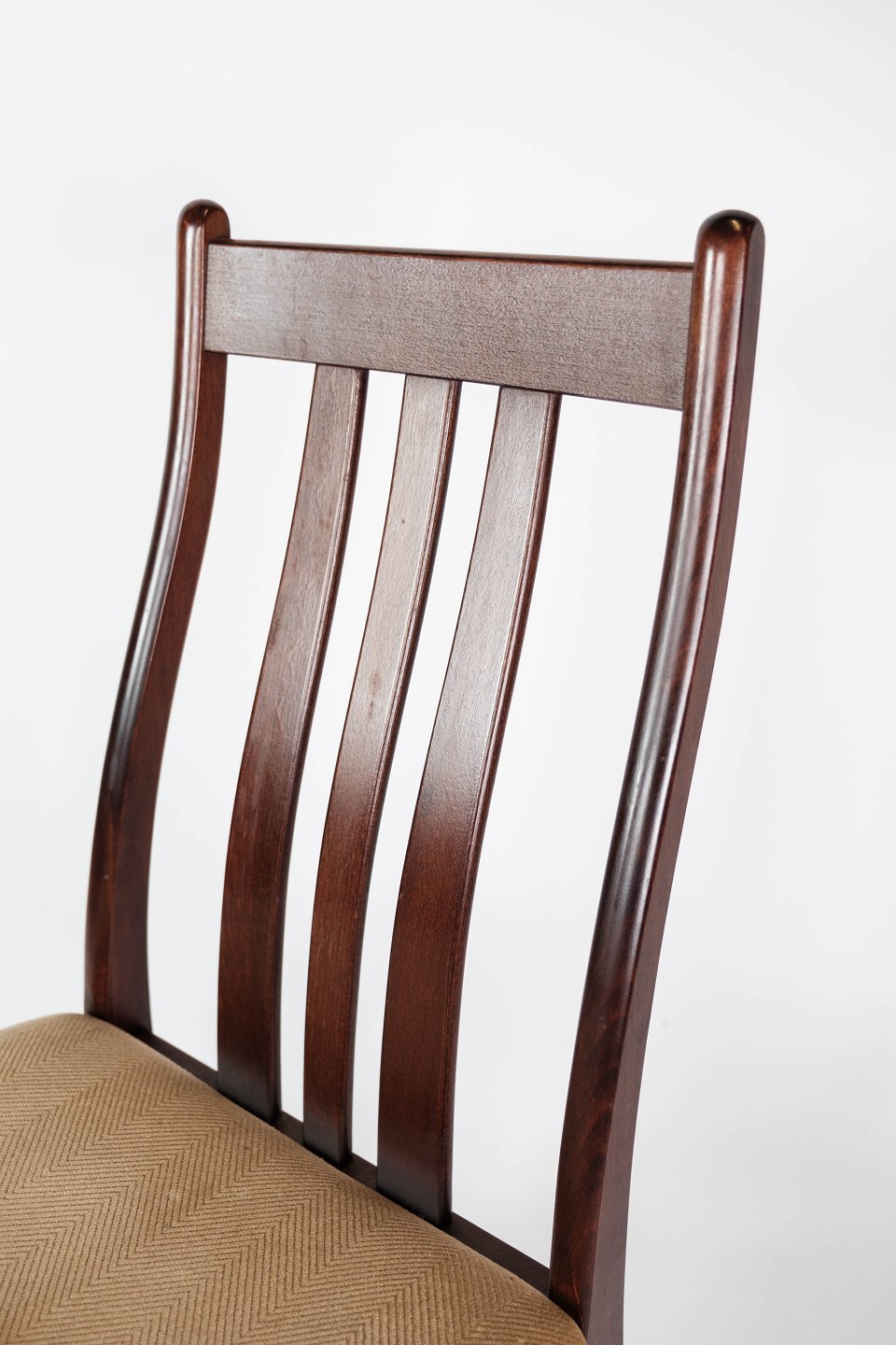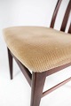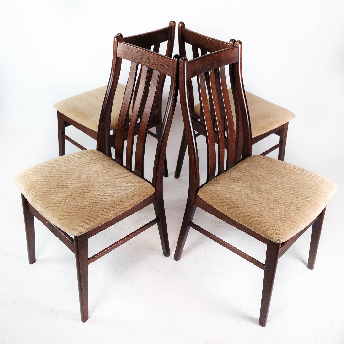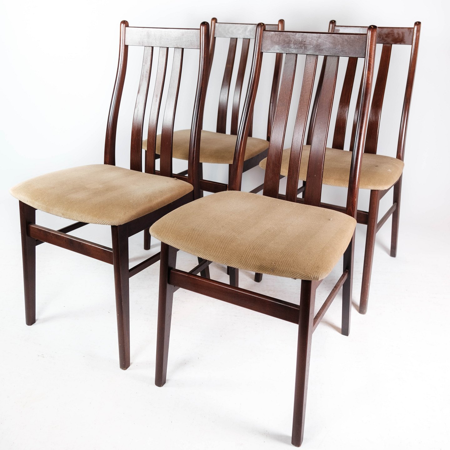 Sæt af fire spisestuestole i mahogni og polstret med lyst stof, af dansk design fremstillet af Farstrup møbler i 1960erne. Stolene er i flot brugt stand.