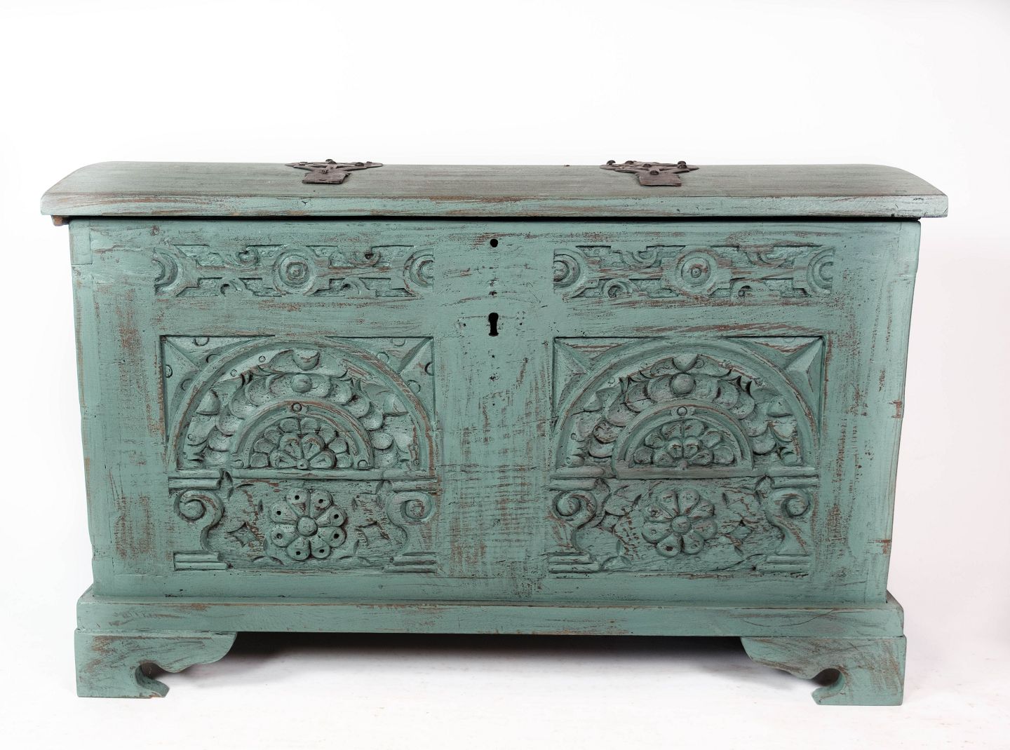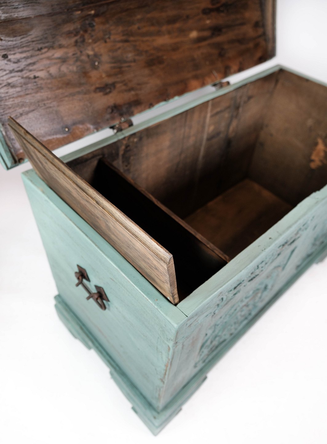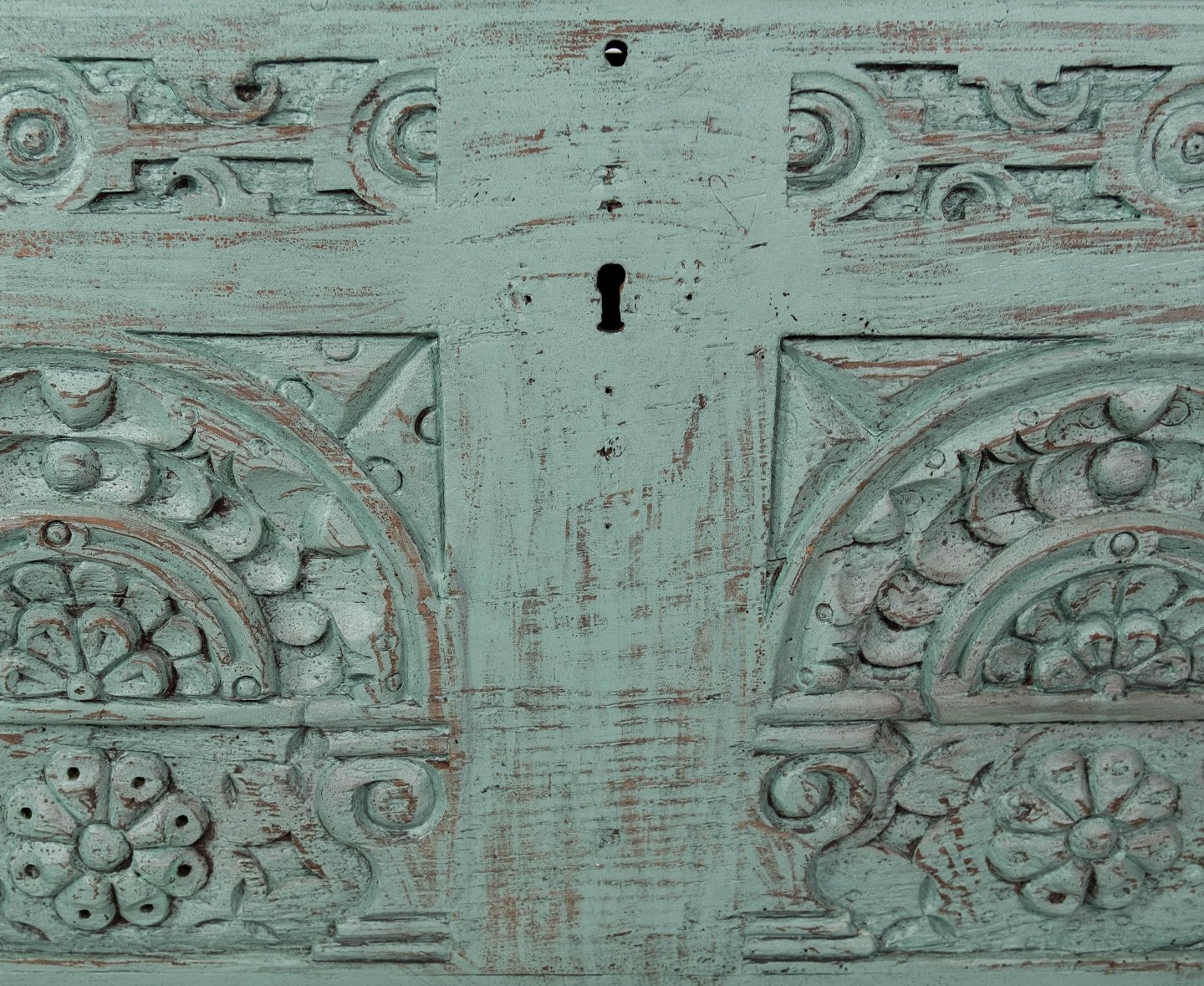 Antique chest with carvings and original paint.