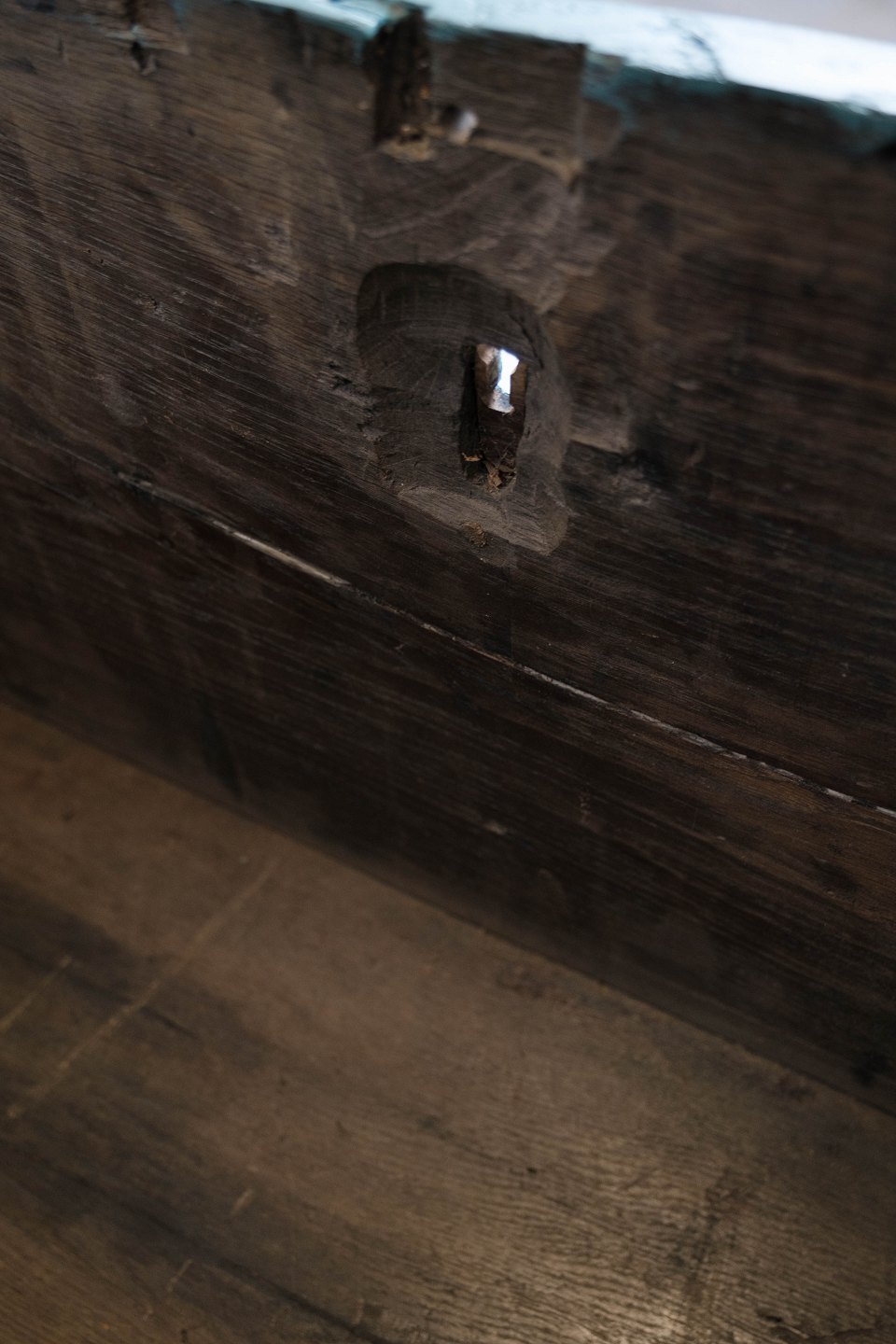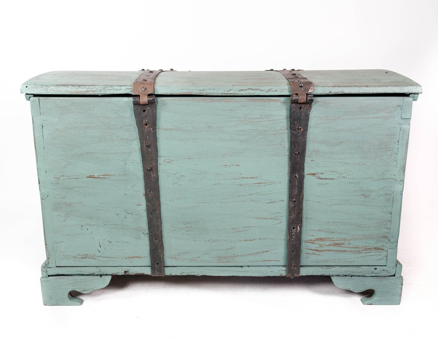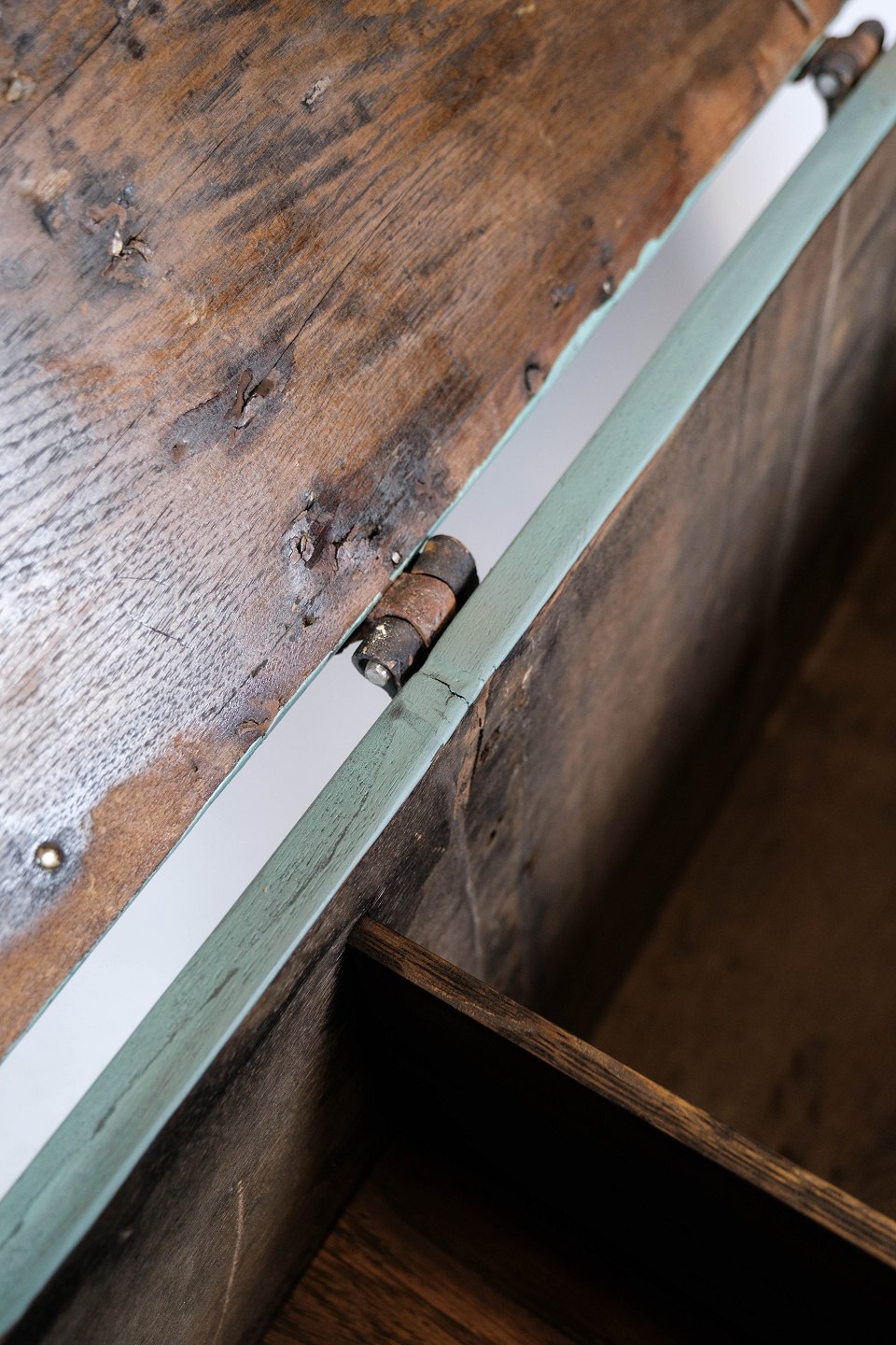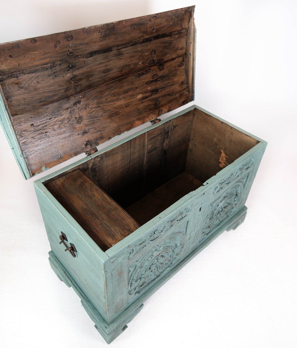 Antique chest with carvings and original paint.