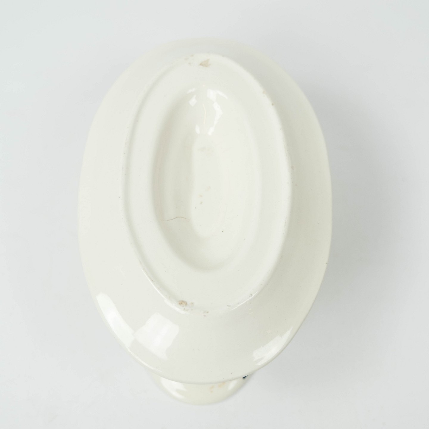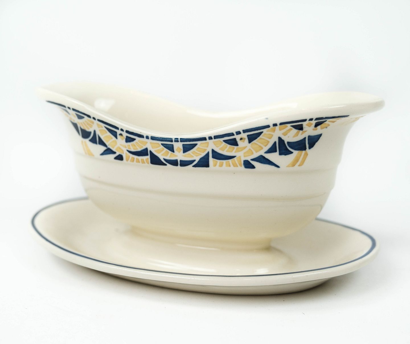 Sauce boat decorated with blue and yellow colours from the 1960s. We have 2 in stock.