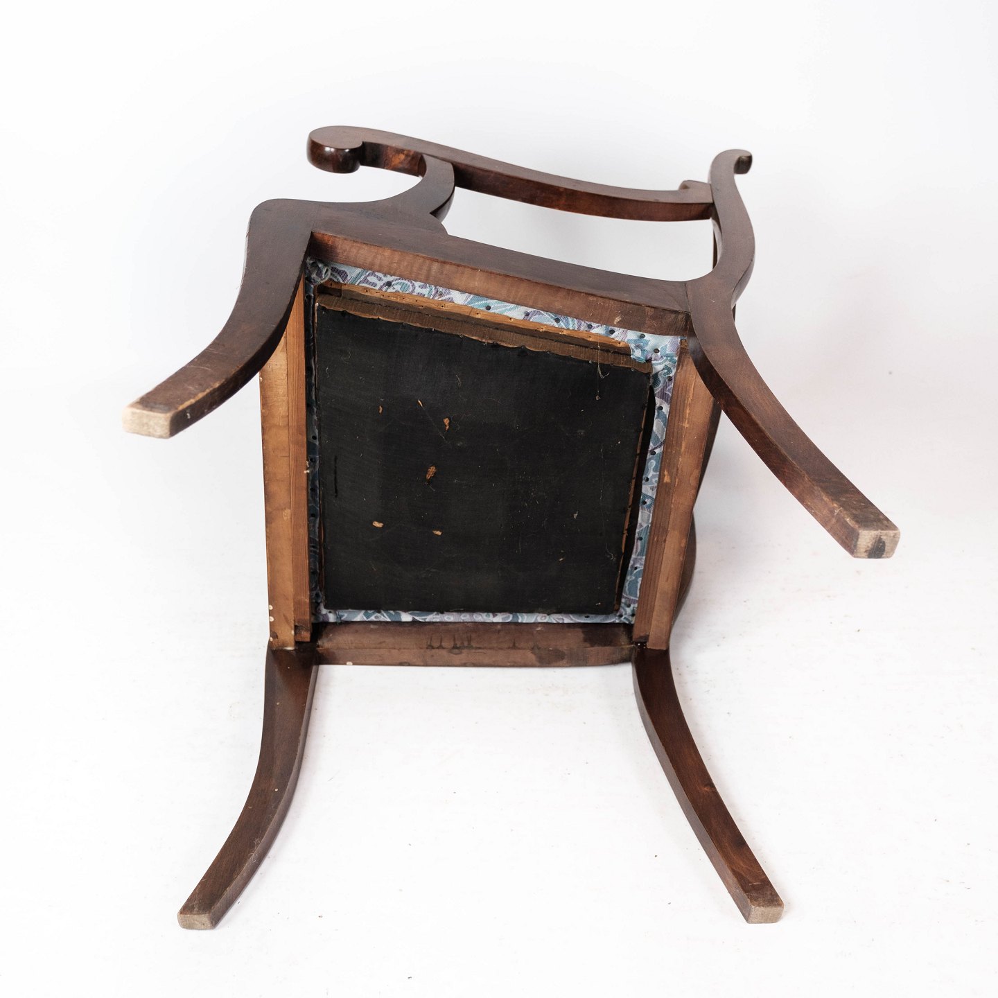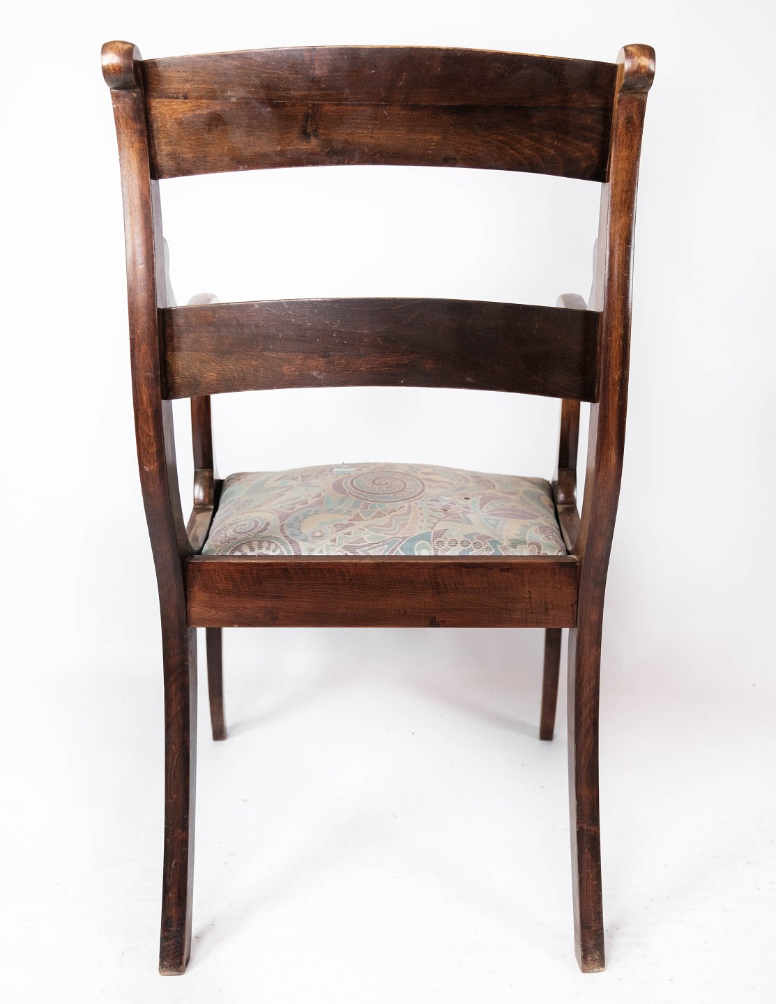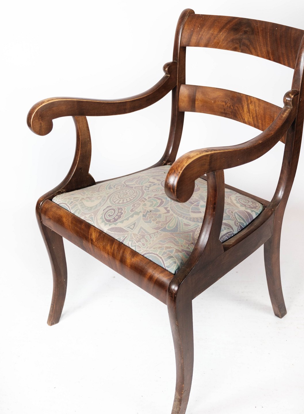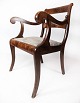 Empire antique armchair of mahogany and upholstered with light fabric from the 1840s.