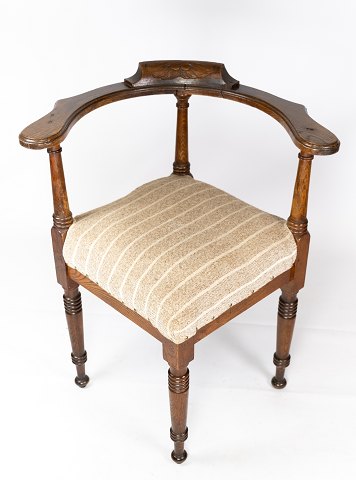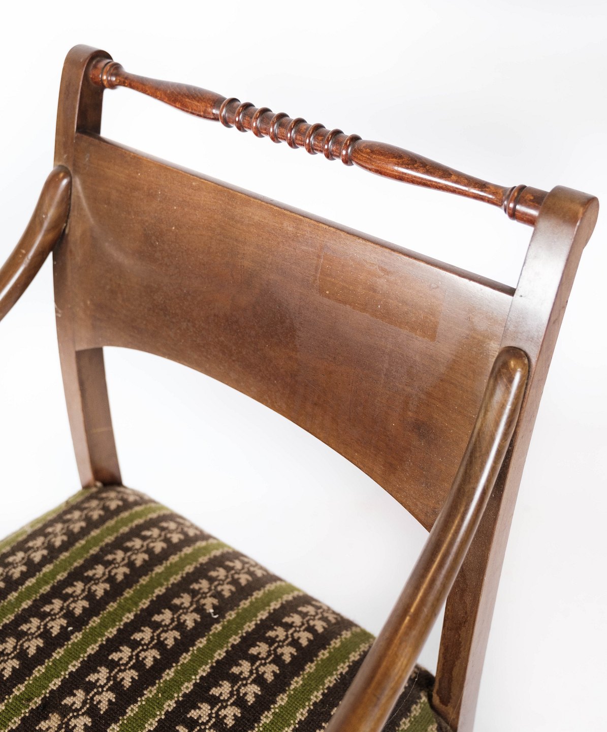 Armstol af poleret mahogni og polstret med grønt stribet stof, fra 1860erne.