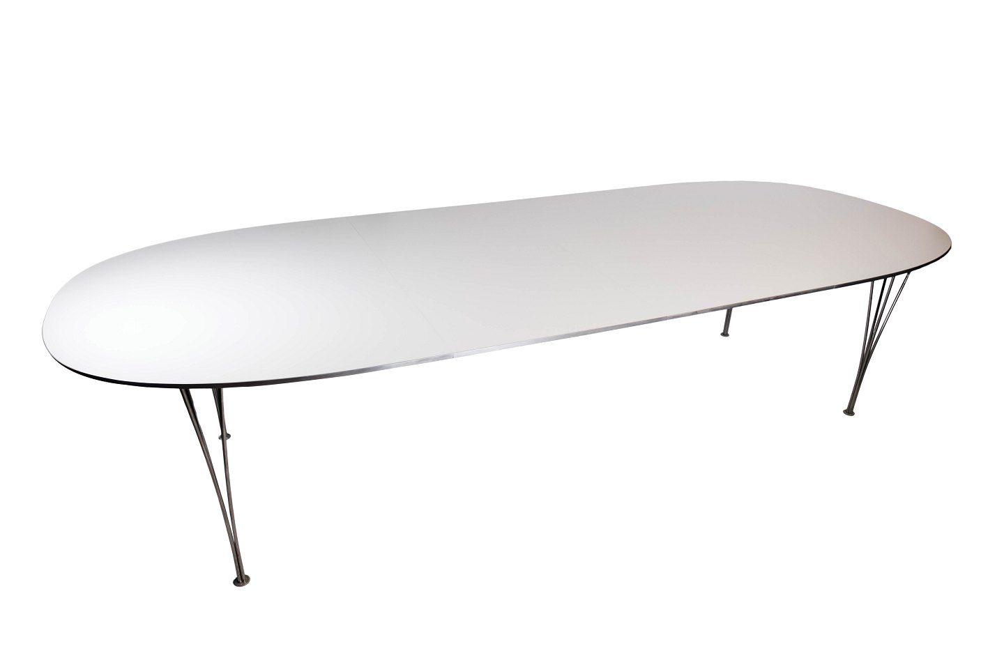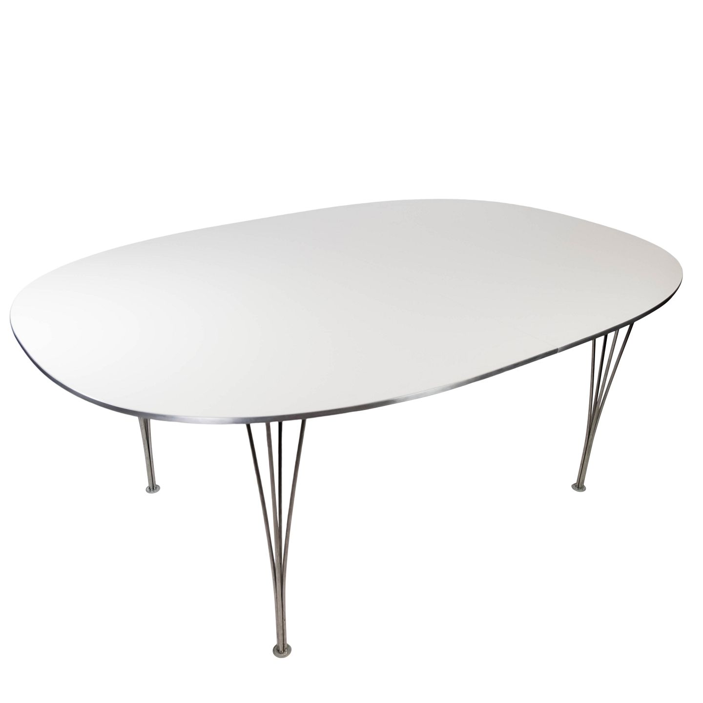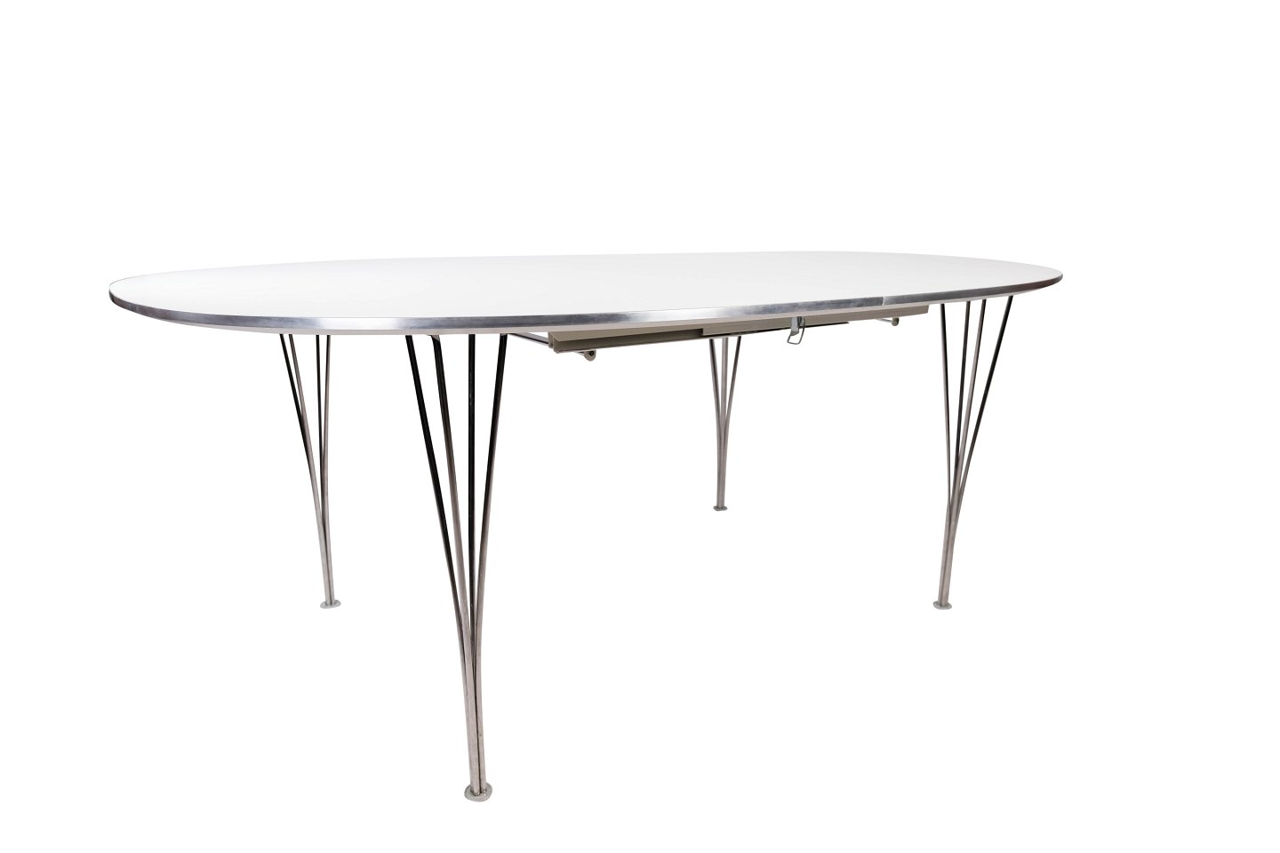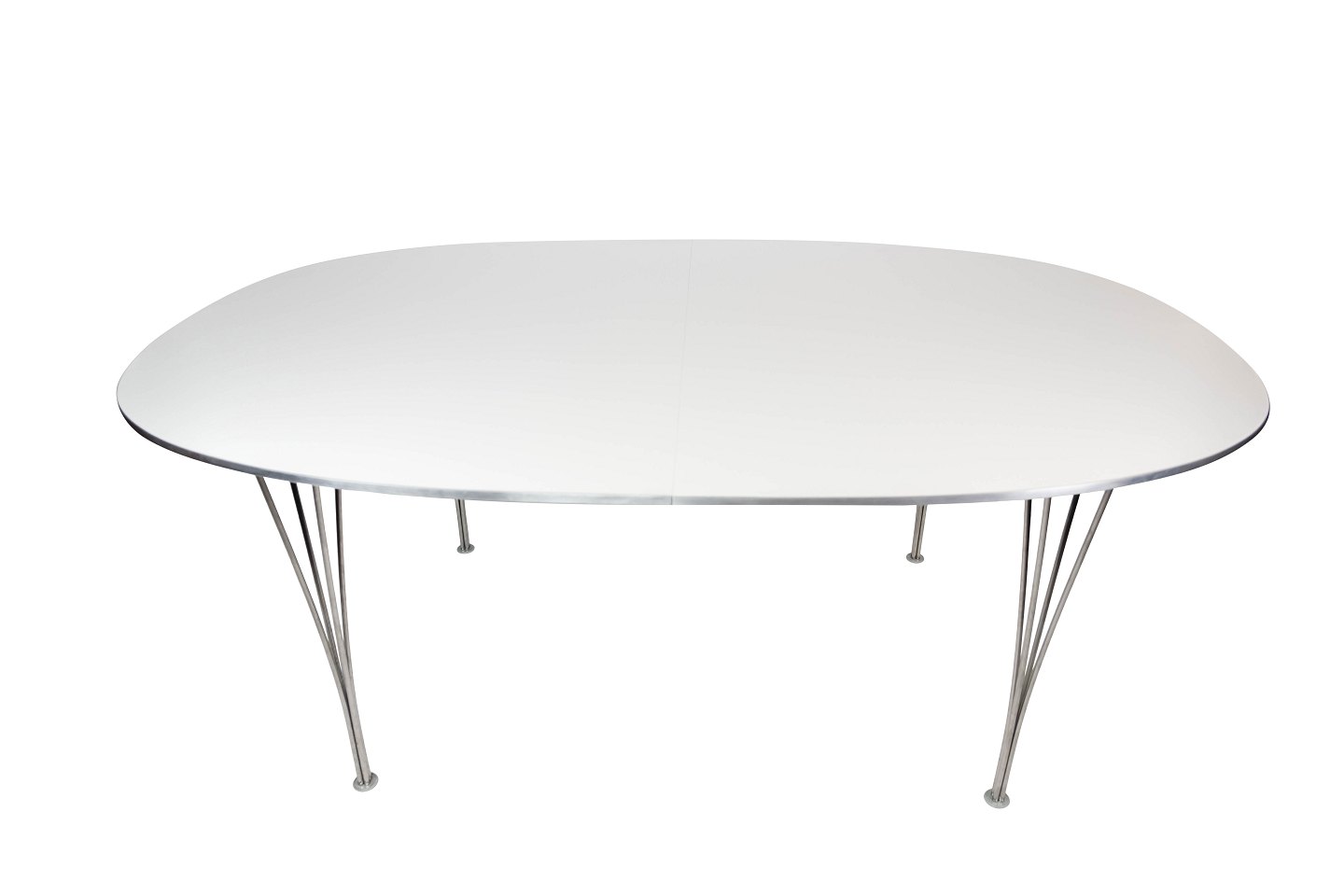 Super Ellipse spisebord med hvid laminat designet af Piet Hein og Arne Jacobsen, samt fremstillet af Fritz Hansen i 1998. Bordet er i flot brugt stand og med to udtræksplader.