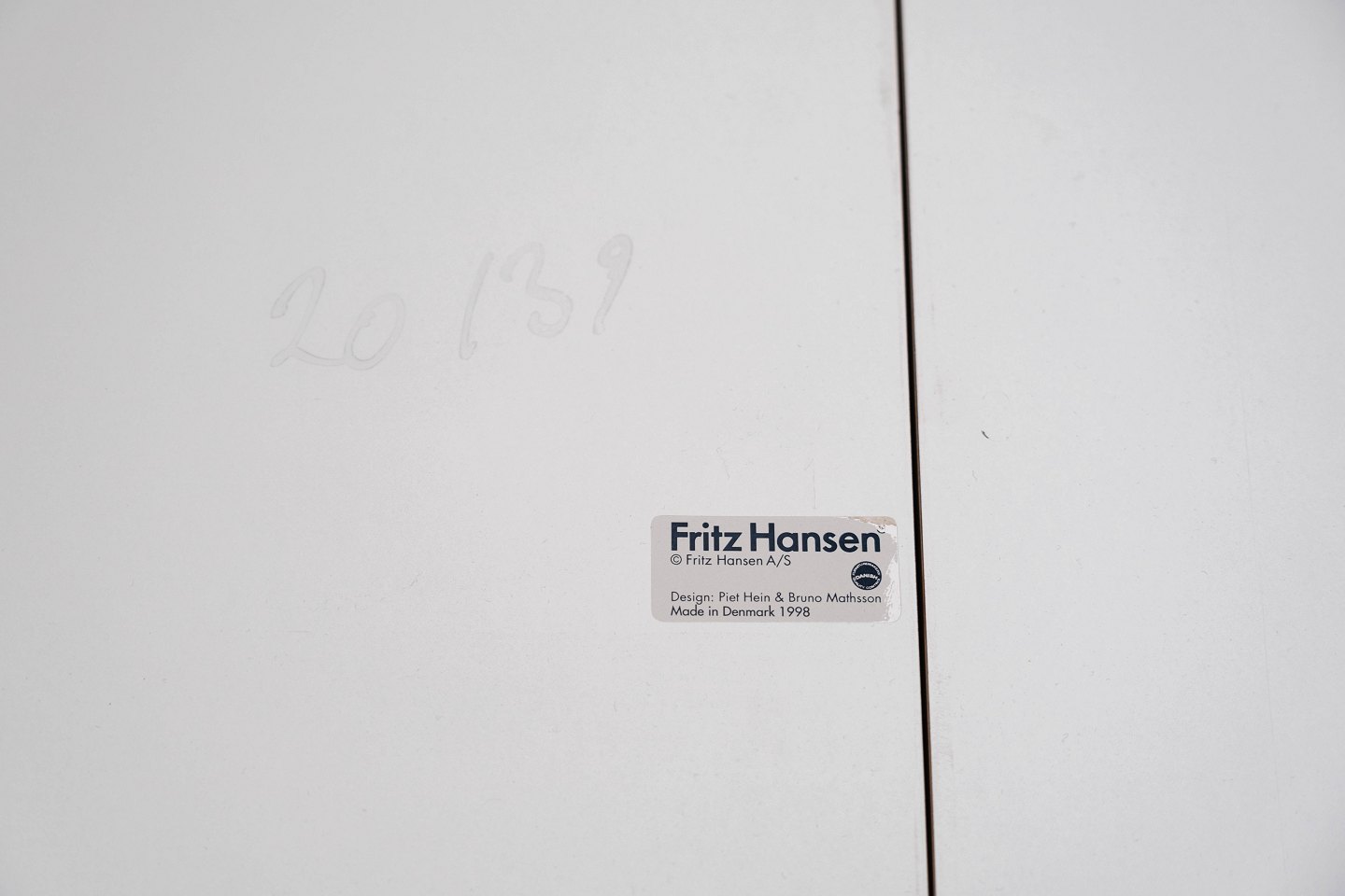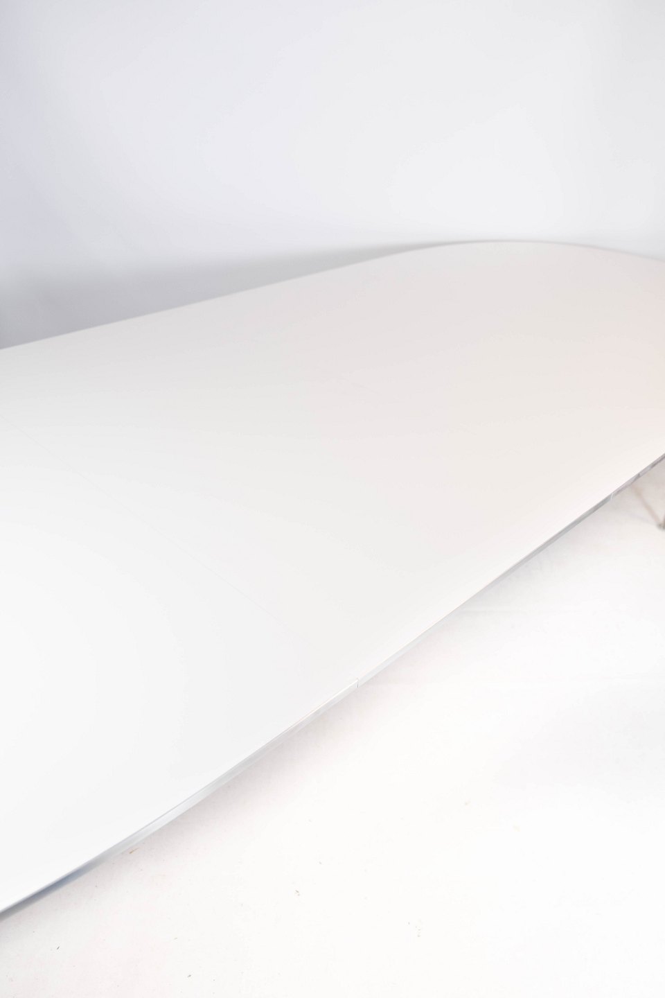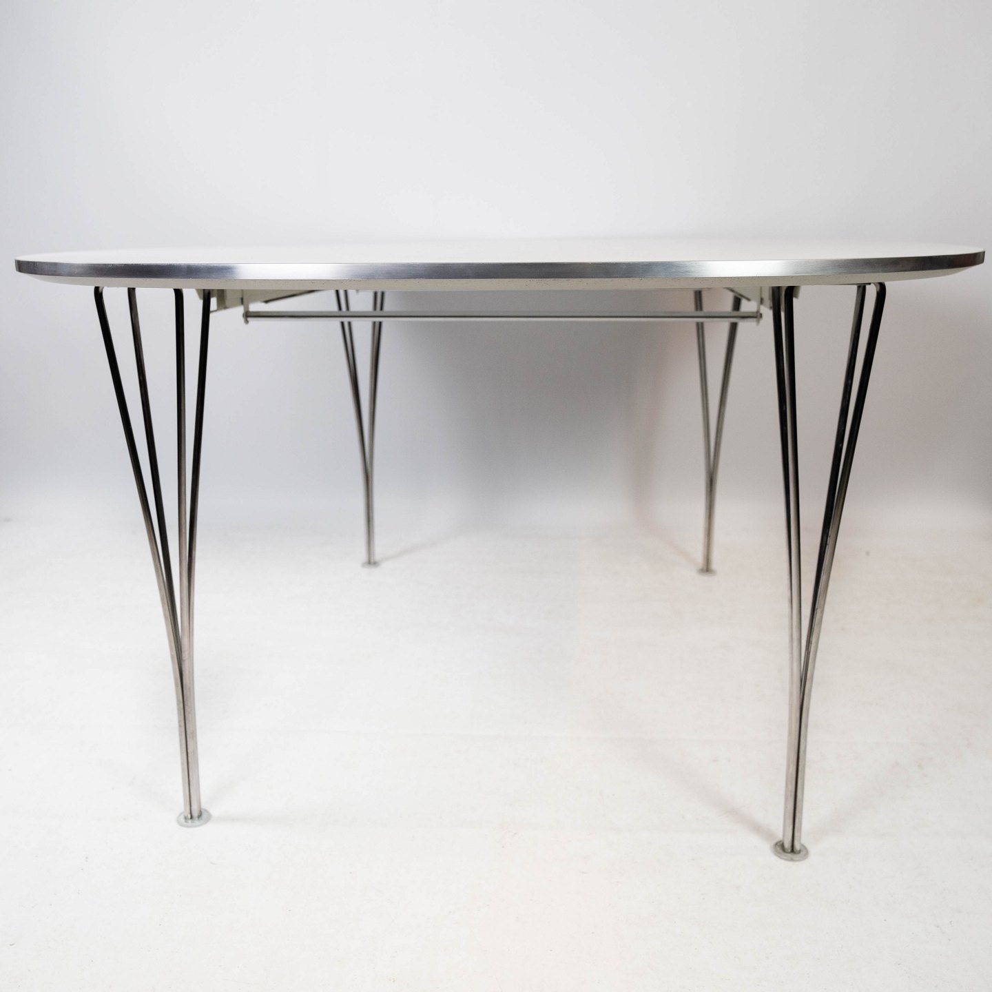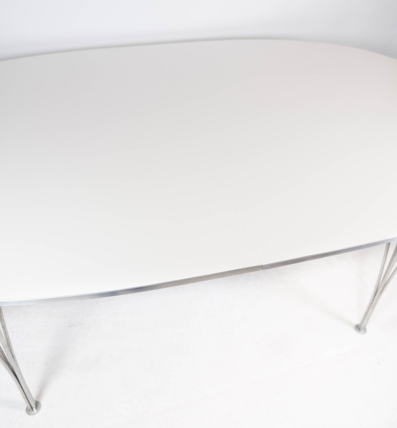Super Ellipse spisebord med hvid laminat designet af Piet Hein og Arne Jacobsen, samt fremstillet af Fritz Hansen i 1998. Bordet er i flot brugt stand og med to udtræksplader.