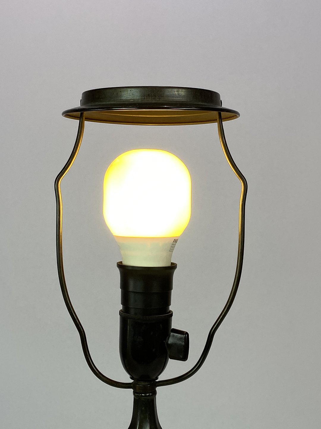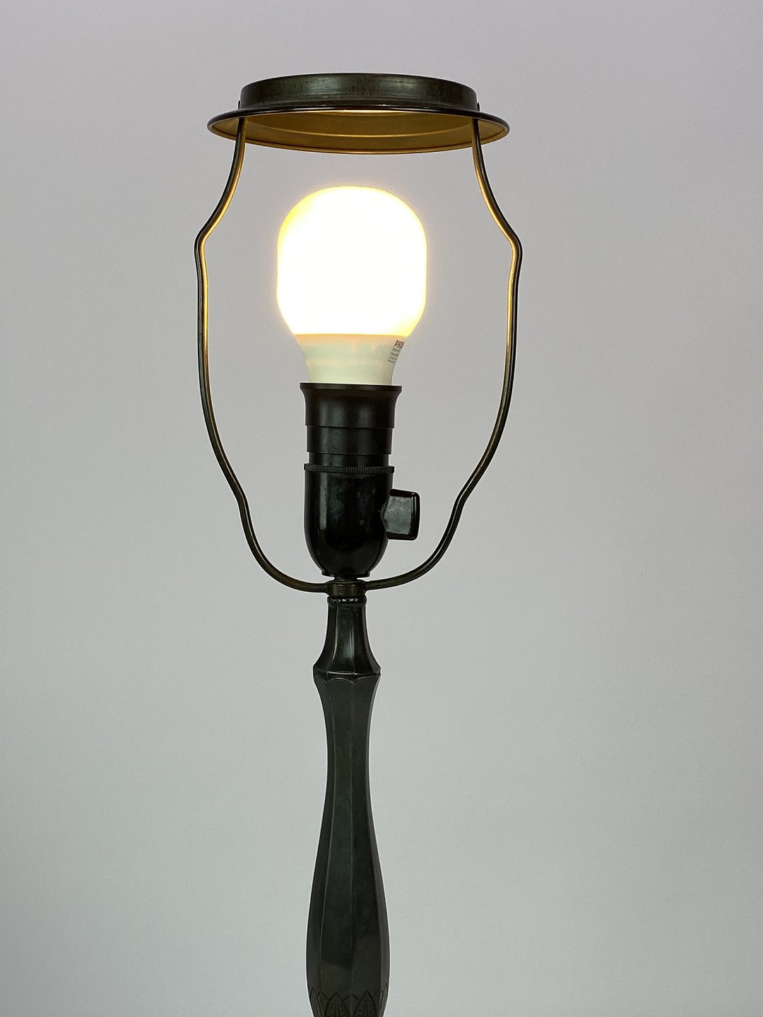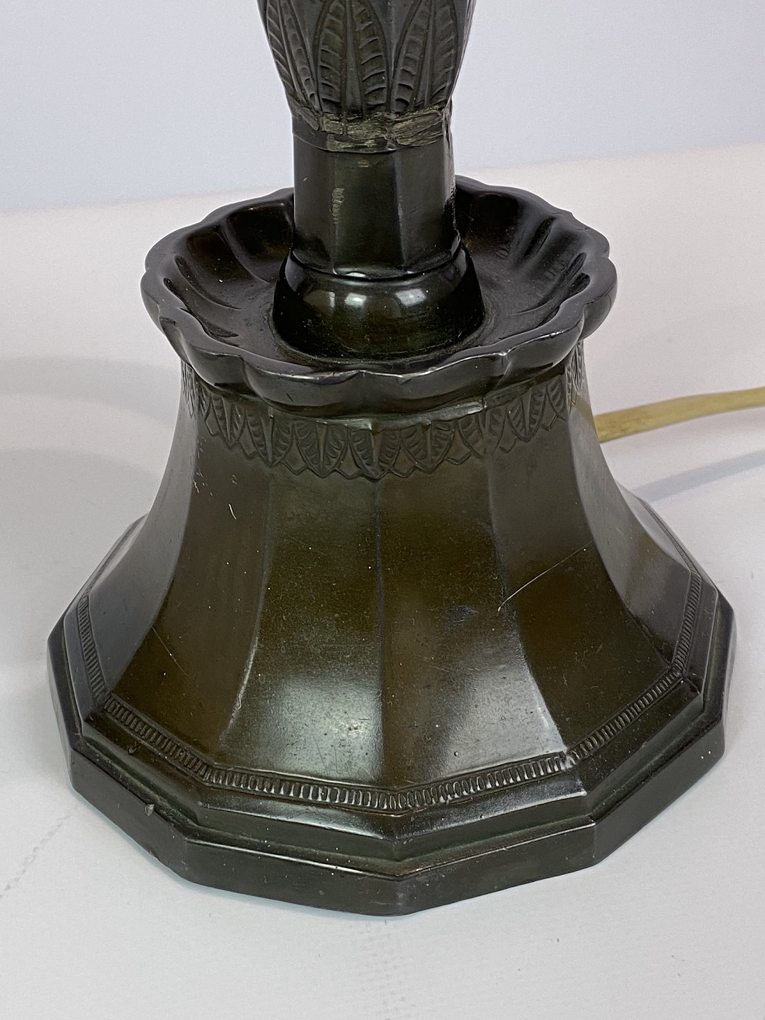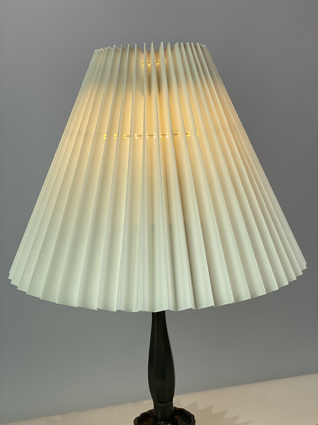 SoldTable lamp in disco-metal by Just Andersen with paper shade, from the 1930s. The lamp is in great vintage condition.