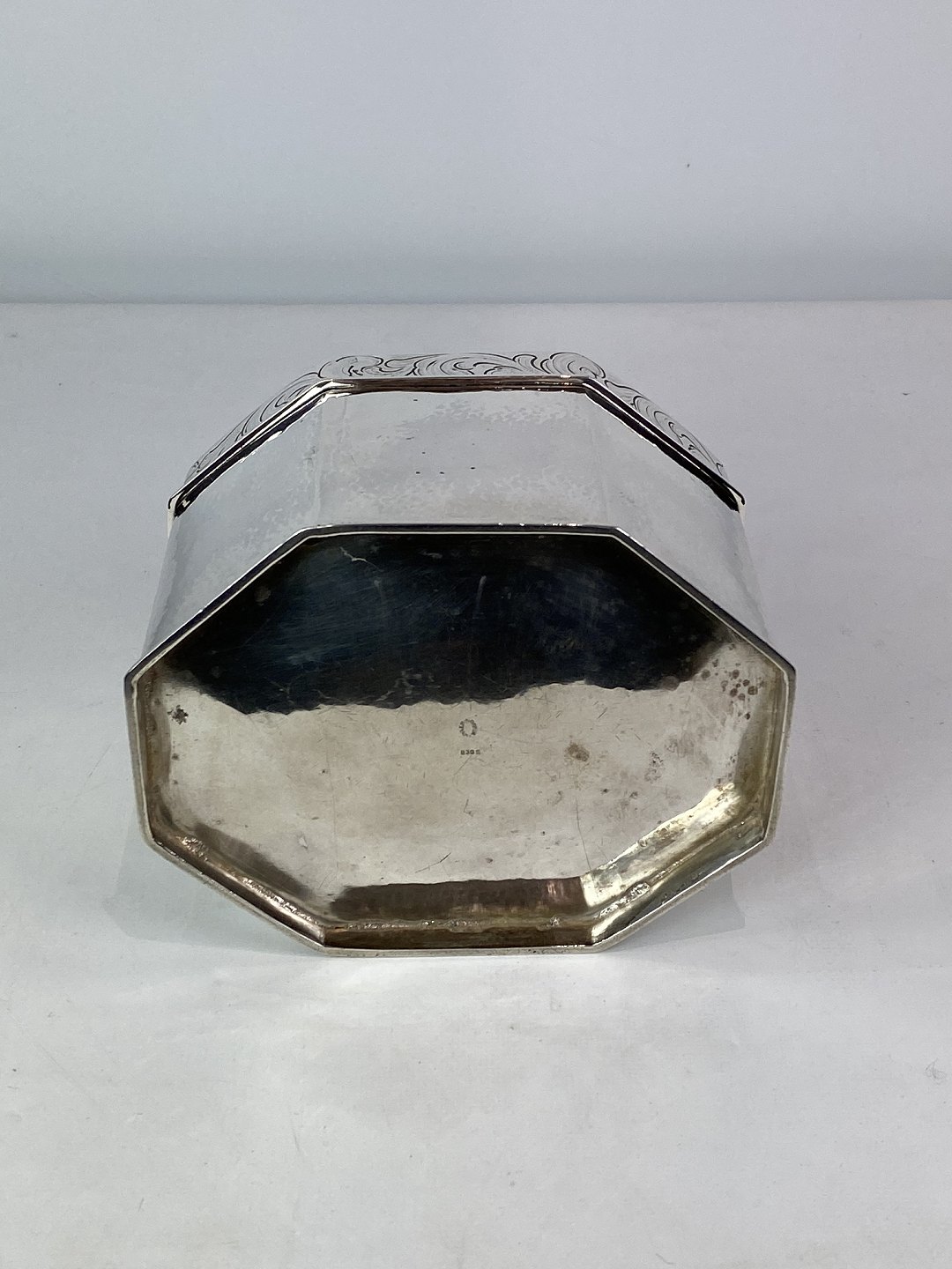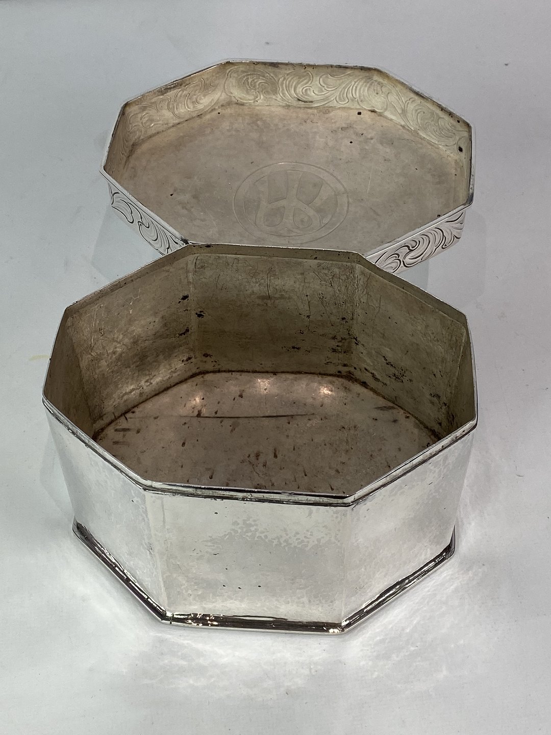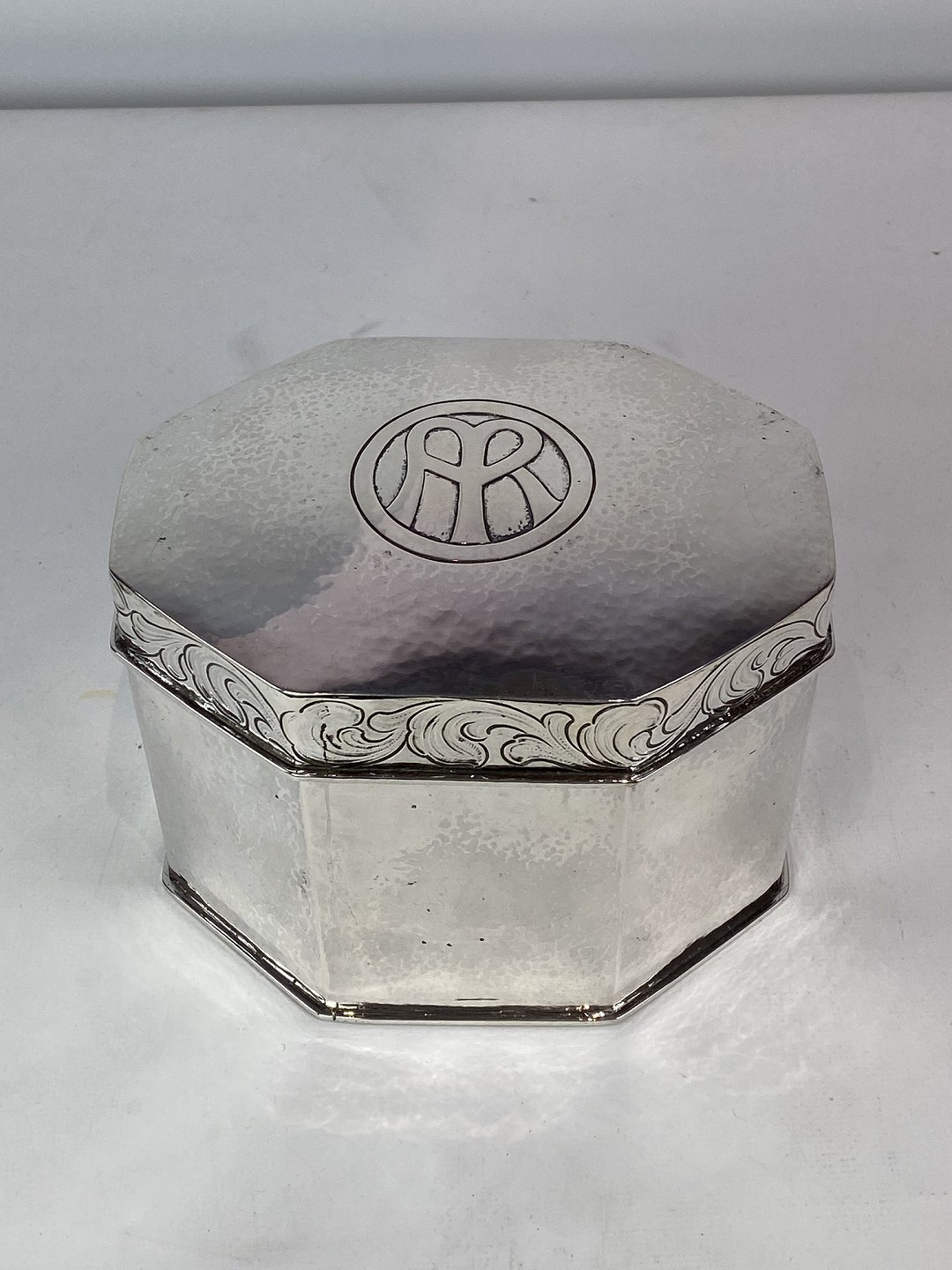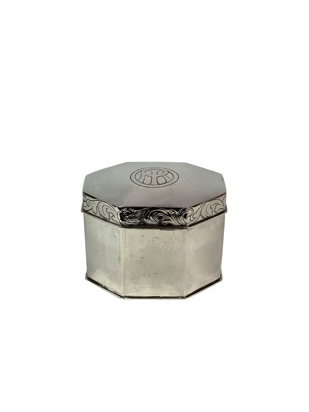 Skrin af 830 sølv, dekoreret med indgraveringer. Skrinet er ottekantet og fra 1940erne.