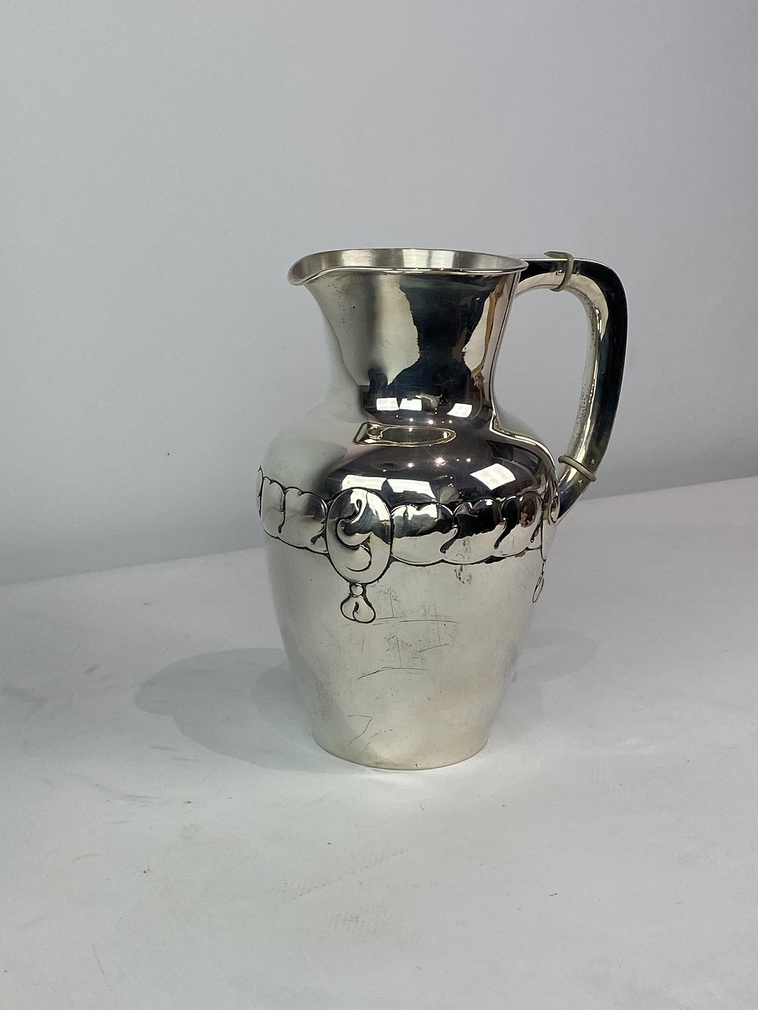 Vandkande i jugendstil af tretårnet sølv stemplet Augusta H., fra 1930erne. Kanden er i flot antik stand.