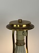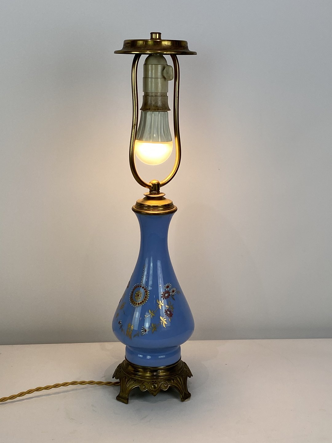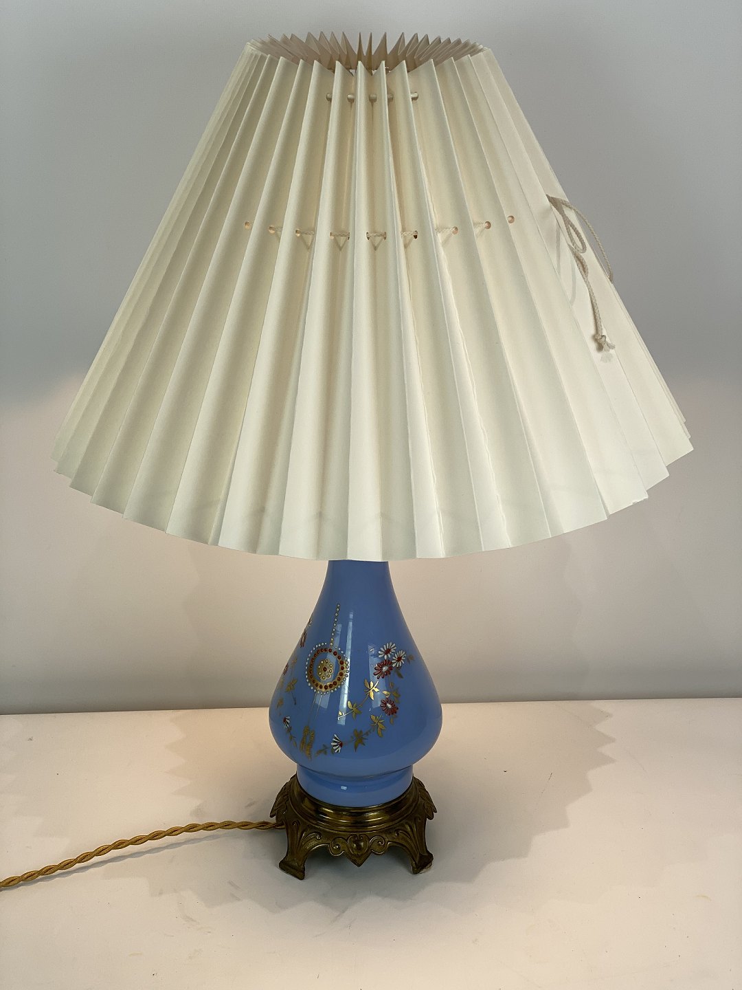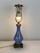 Bordlampe med blåt opal glas dekoreret med guld og af bronze, med papir skærm, fra 1890erne. Lampen er i flot antik stand.