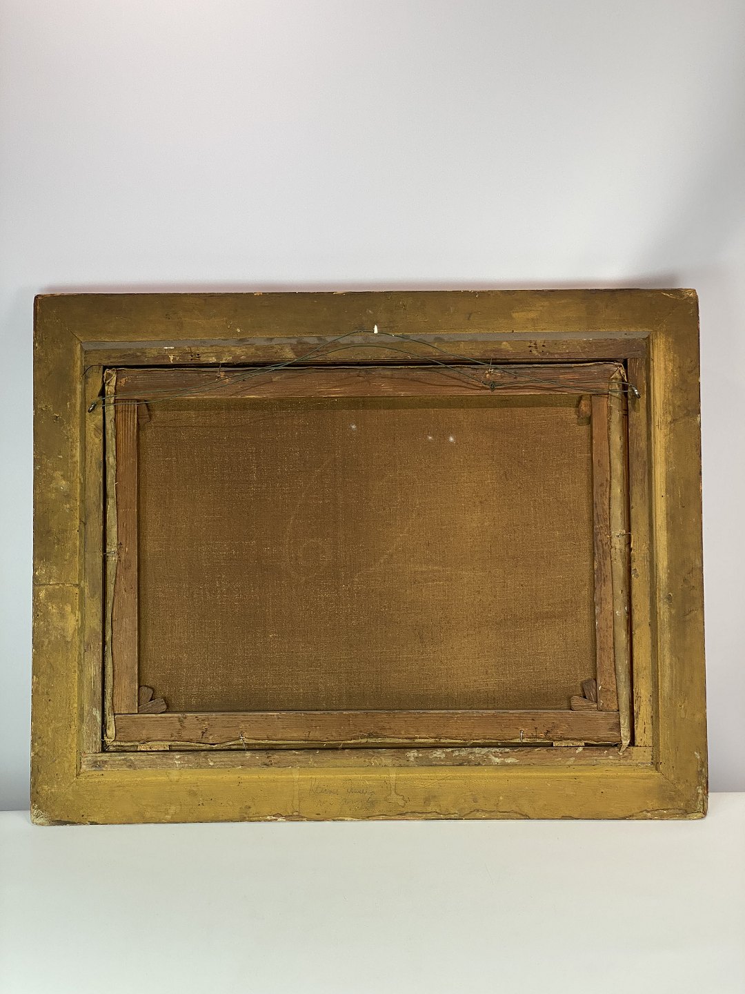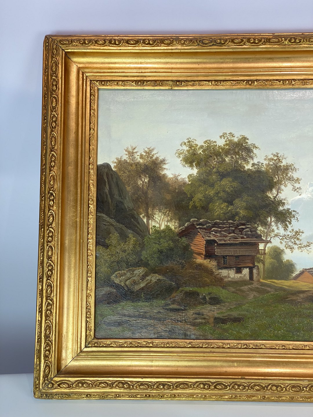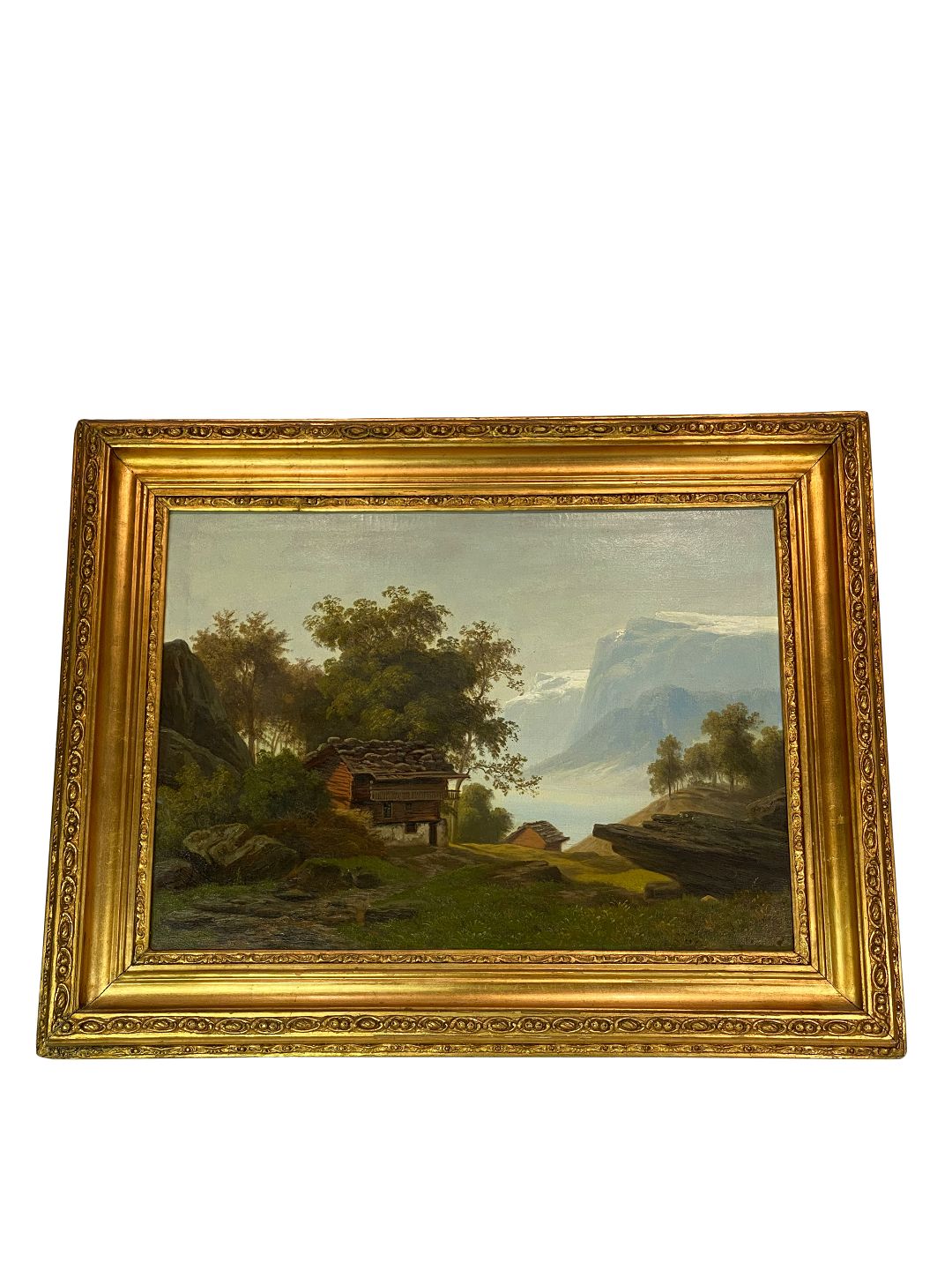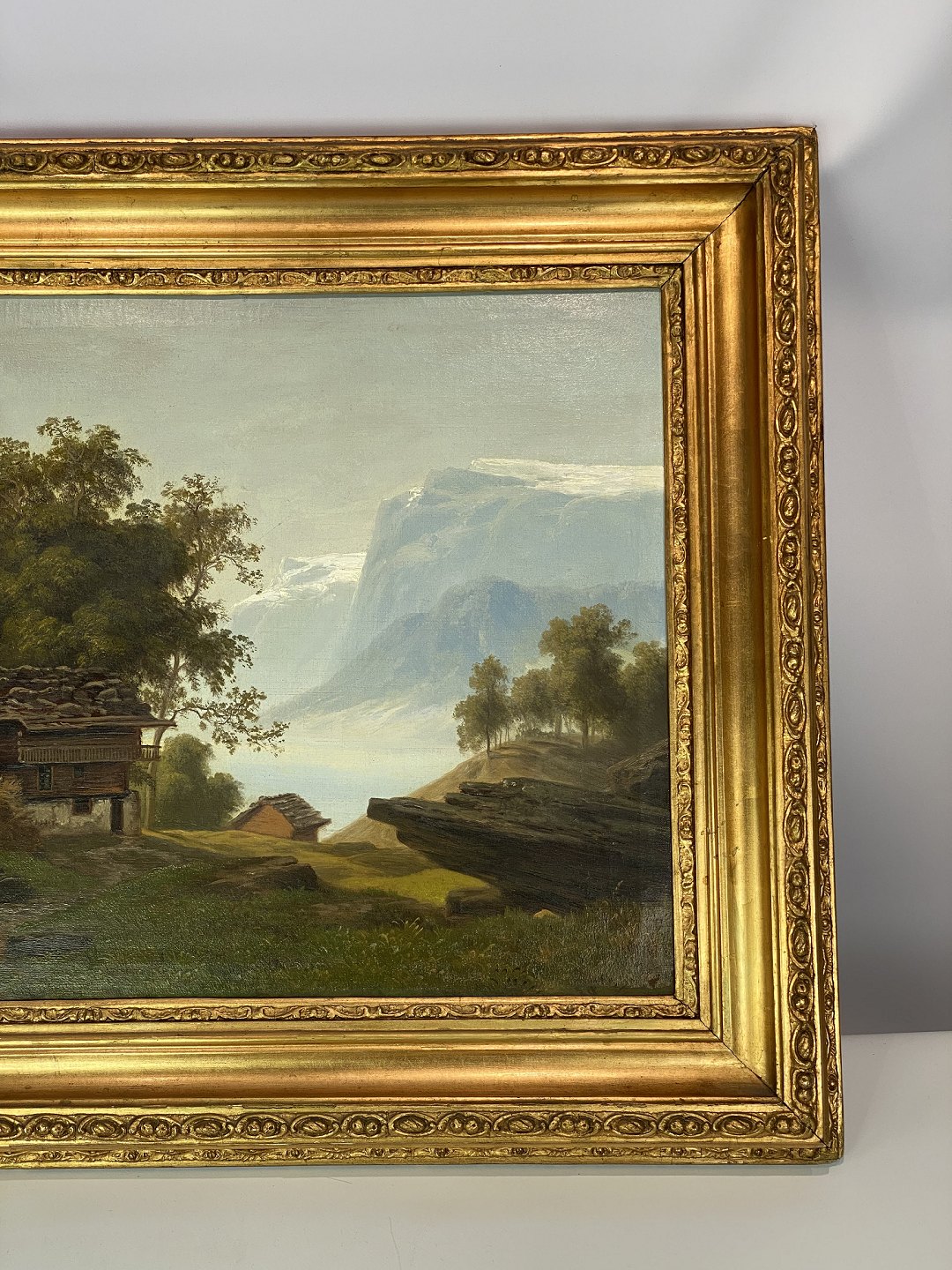 Painting on canvas with motif of the Swiss alps and with wide gilded frame, from around 1680.