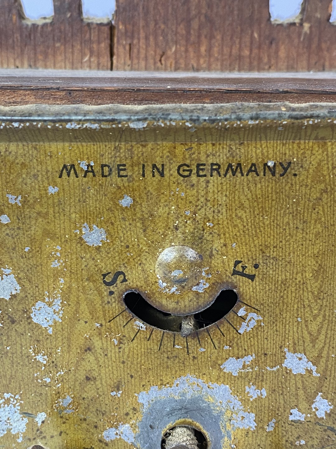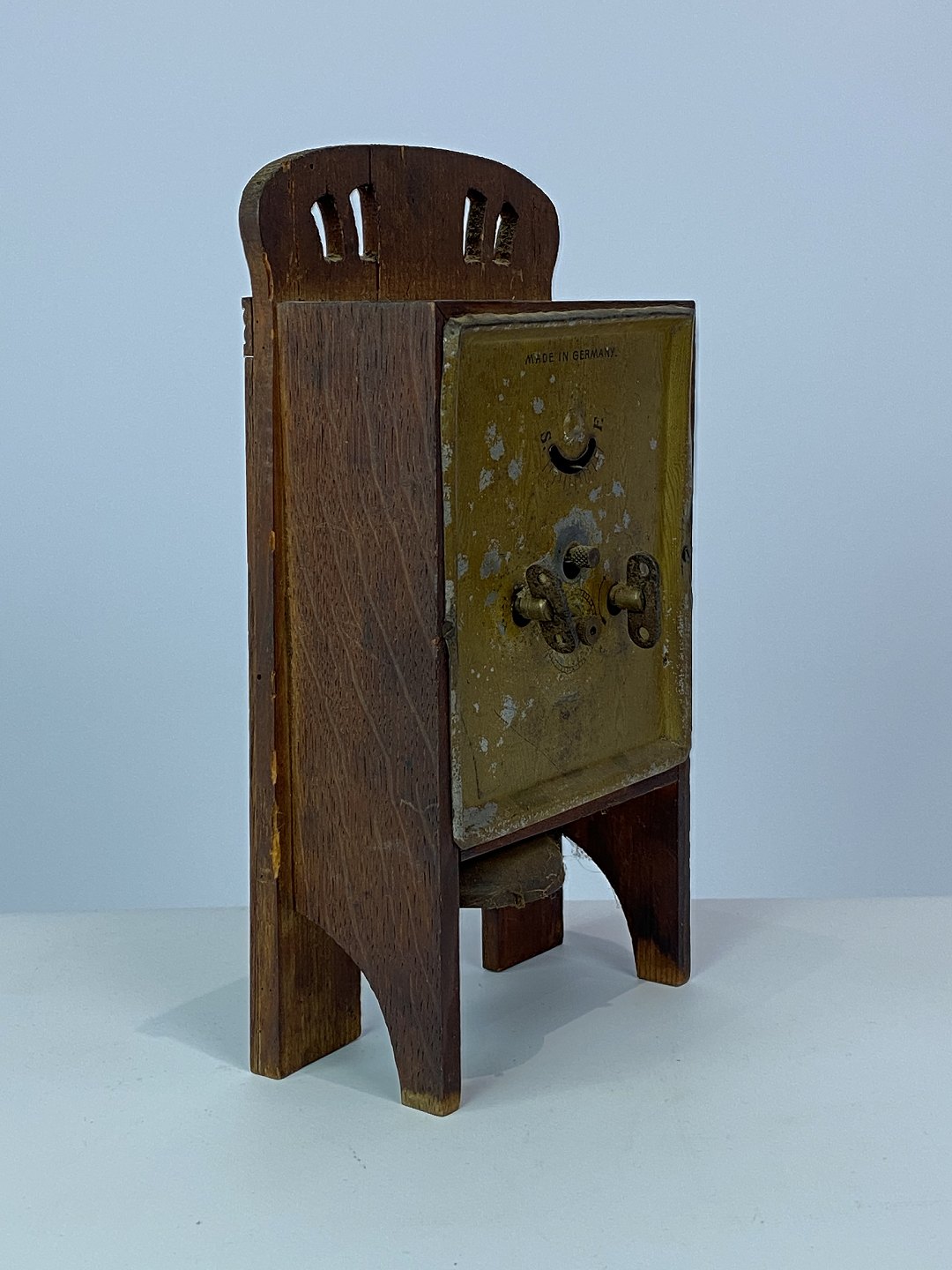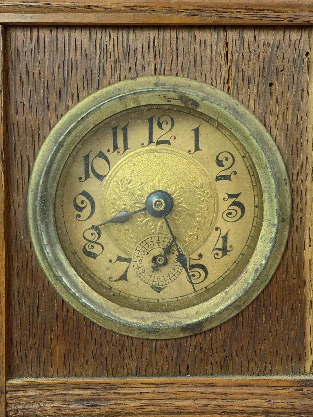 Kaminur af eg og skiven er af messing, fra omkring 1920erne. Uret er i pæn antik stand.