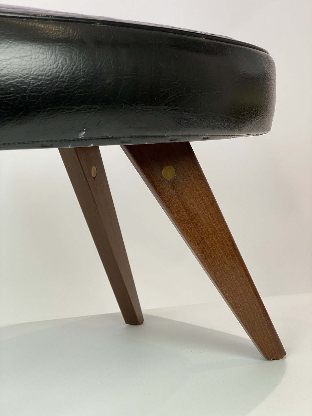 This stool, with its black artificial leather and teak legs, represents a classic piece of Danish design from the 1960s. The black faux leather adds a timeless elegance to the stool, while providing comfort and durability. The teak legs add a warm and natural contrast to the dark leather and contribute to the stool's charm.