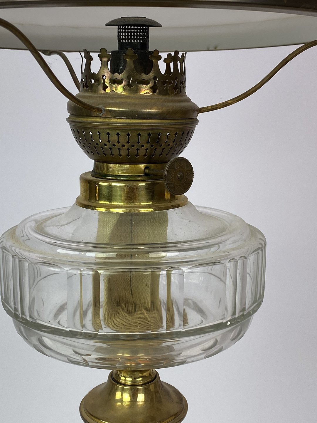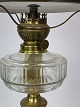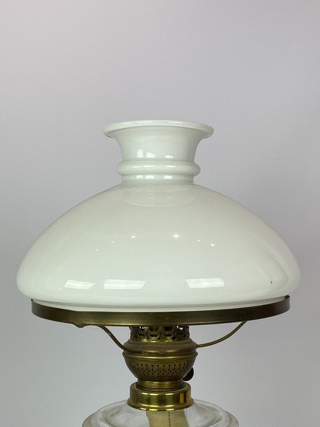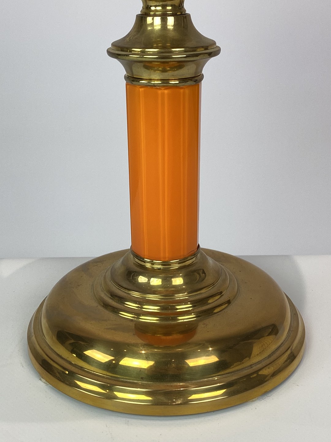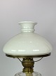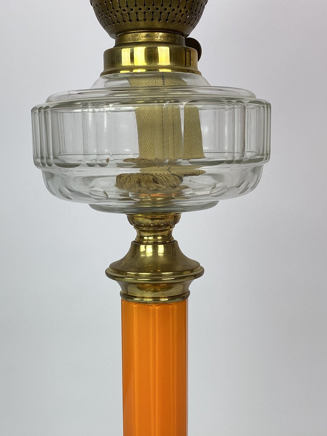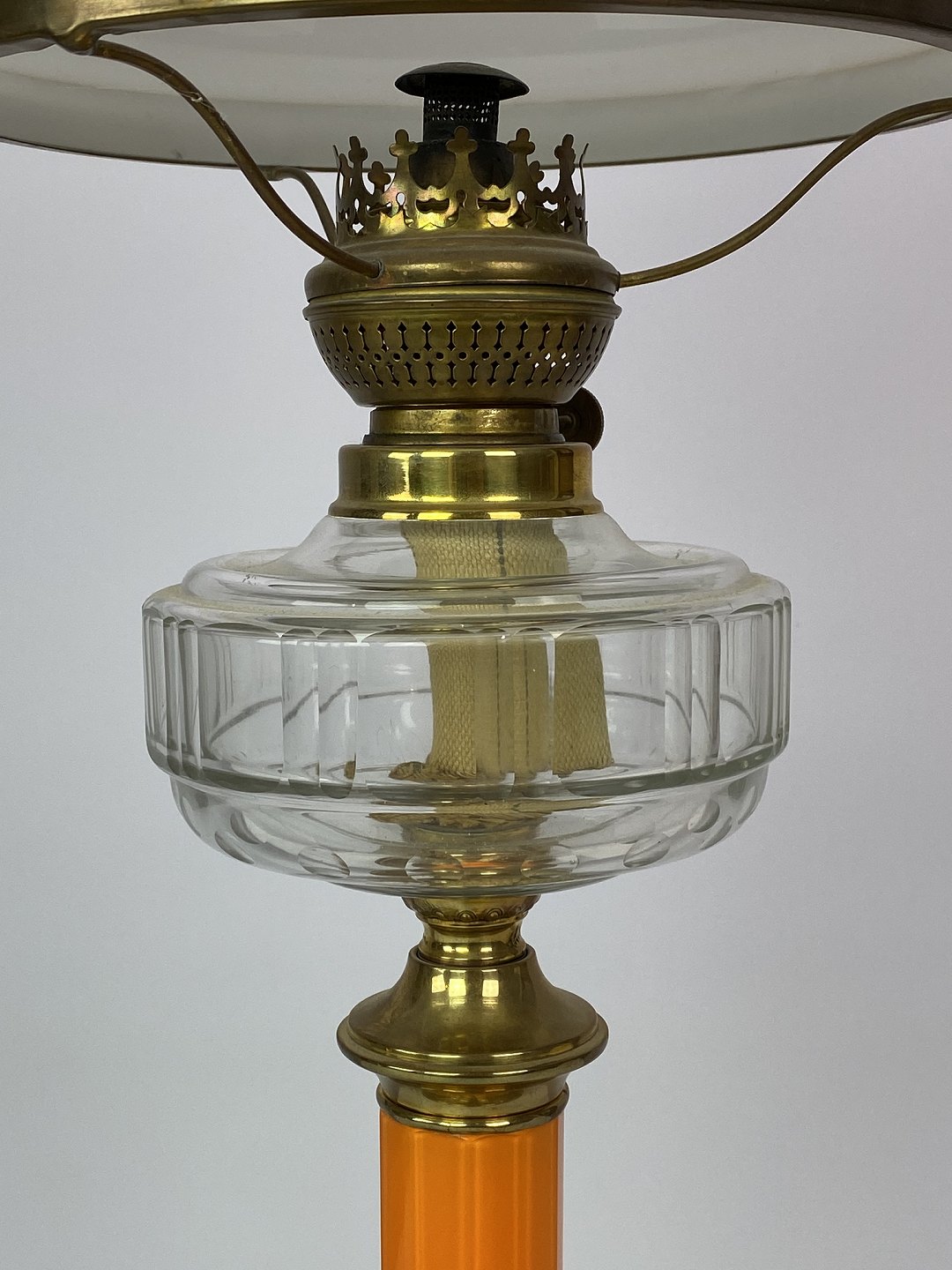 Petroleumslampe af messing med hvid opal glas skærm, samt med orange glas stamme, fra omkring 1860.
