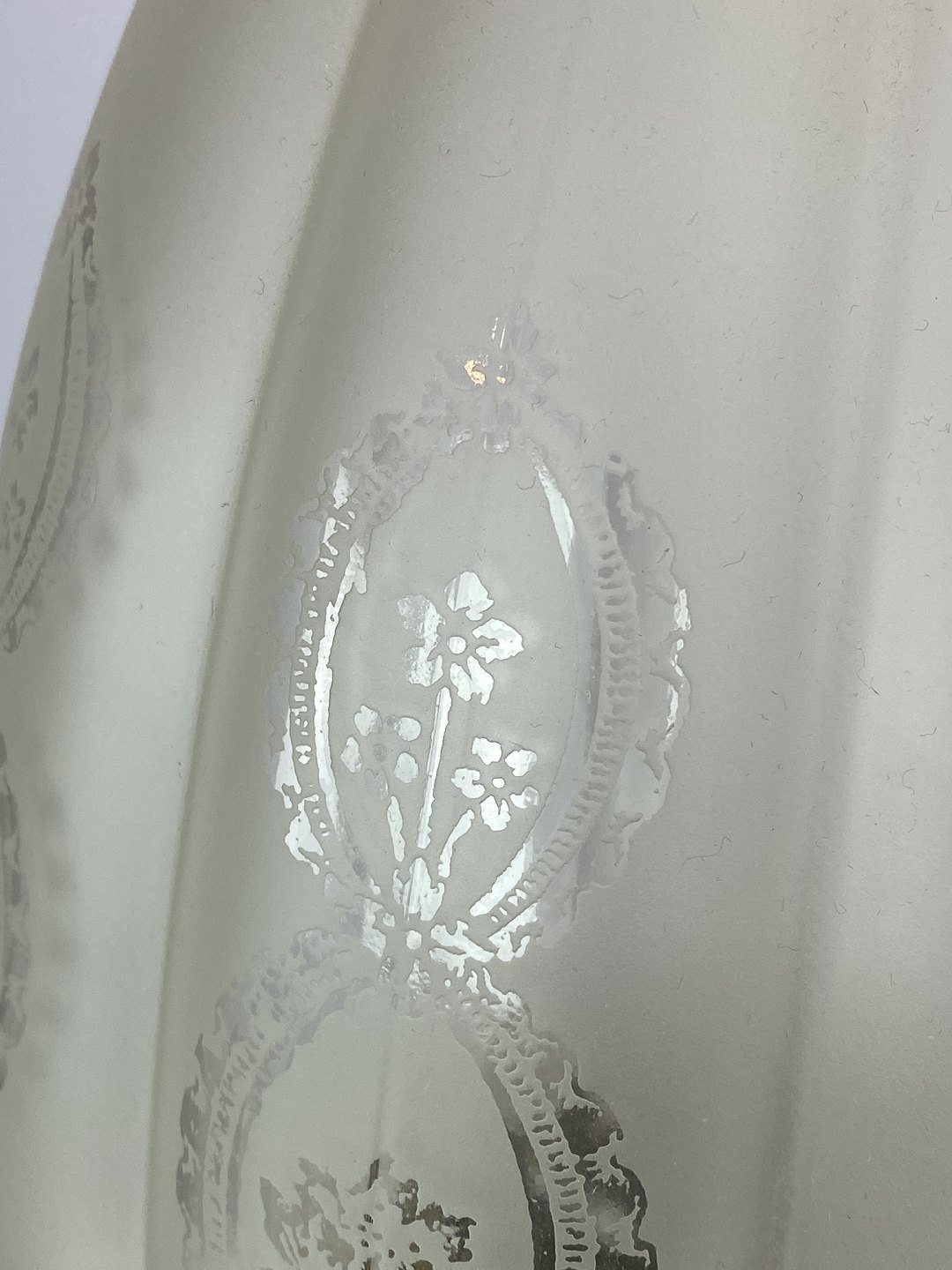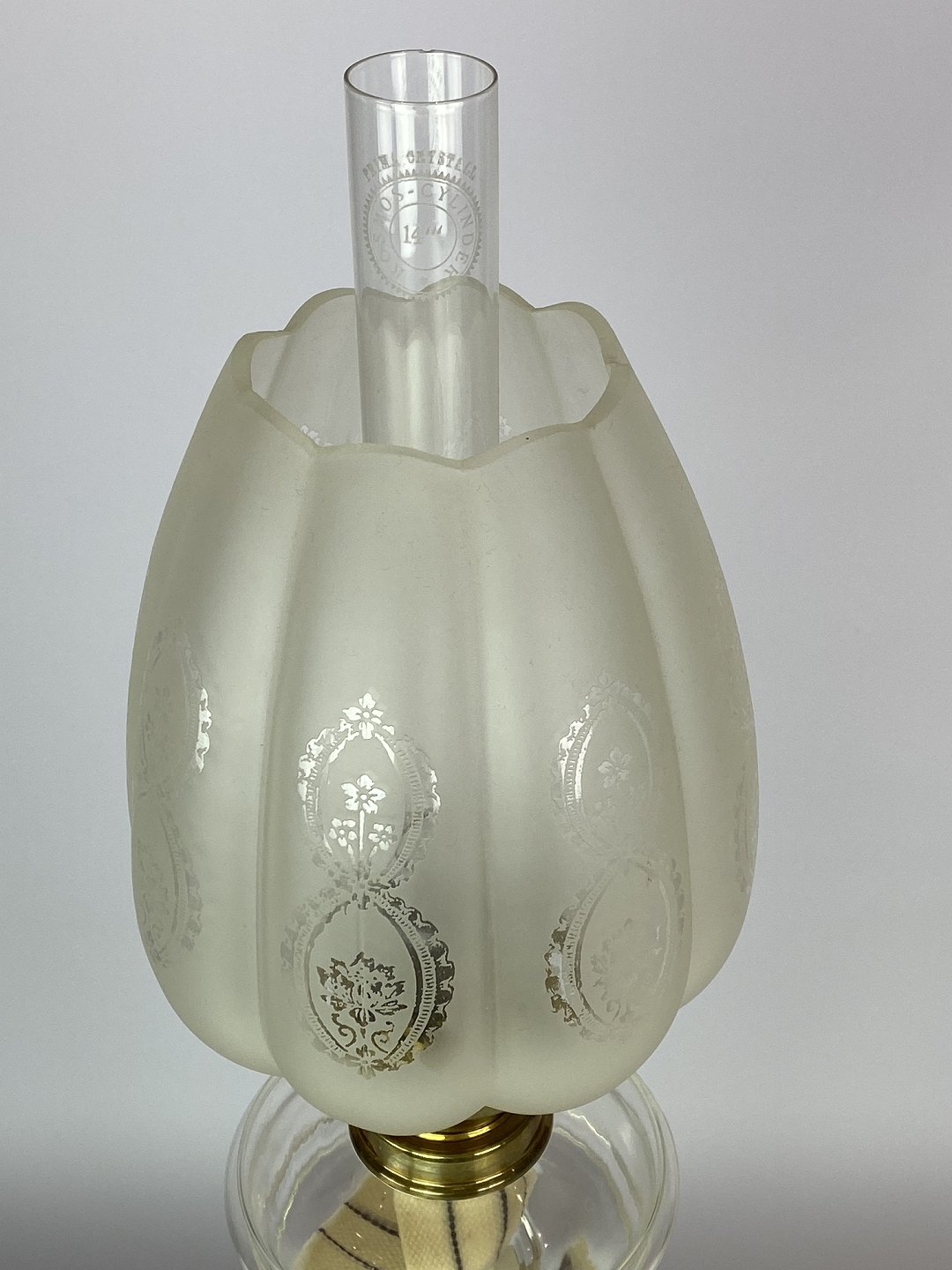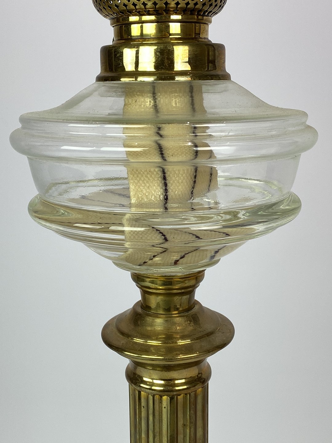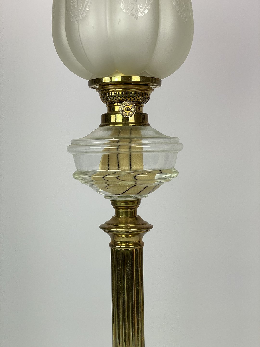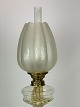 Petroleumslampe af messing med glasskærm fra omkring 1860. Lampen er i flot antik stand.