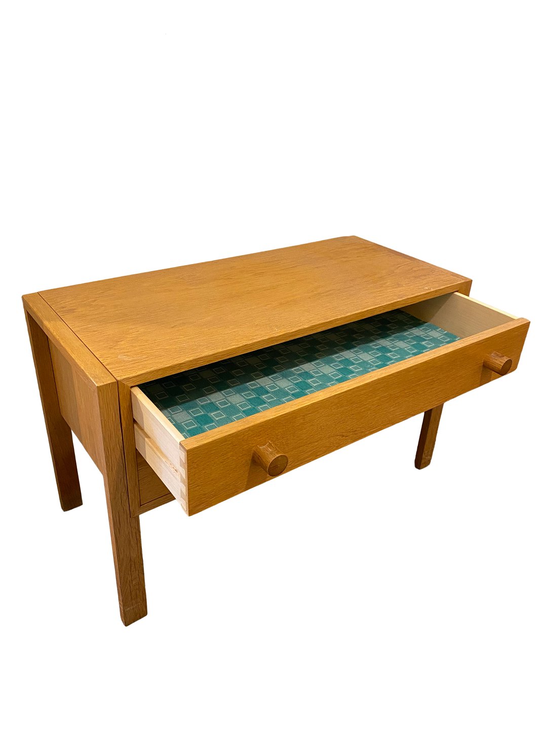 Få et stykke dansk designhistorie med dette smukke entre-sæt bestående af et spejl og en lav kommode, begge i lys eg og fra 1960'erne. Dette sæt repræsenterer den karakteristiske stil og æstetik, der var typisk for dansk møbeldesign på det tidspunkt.