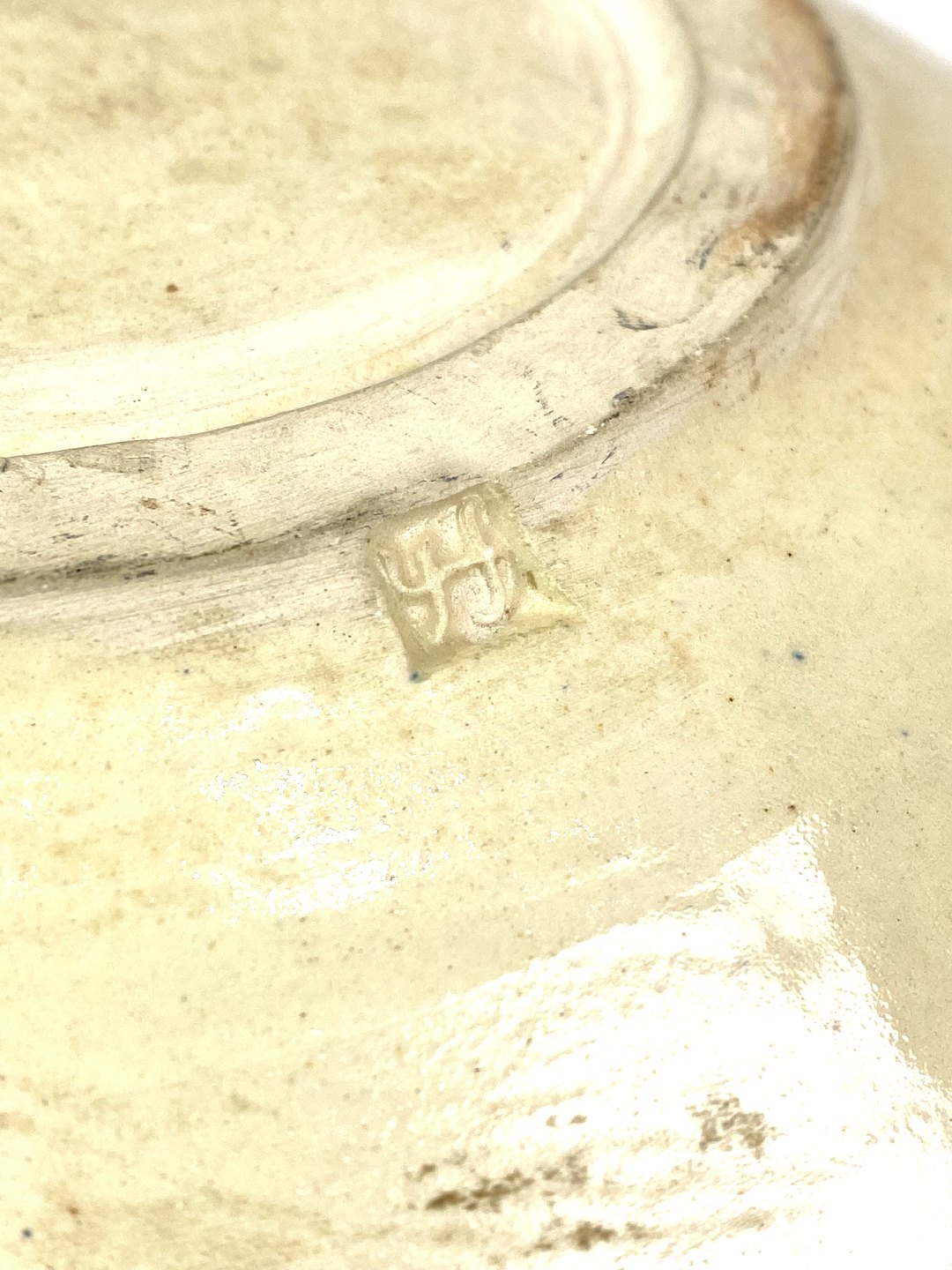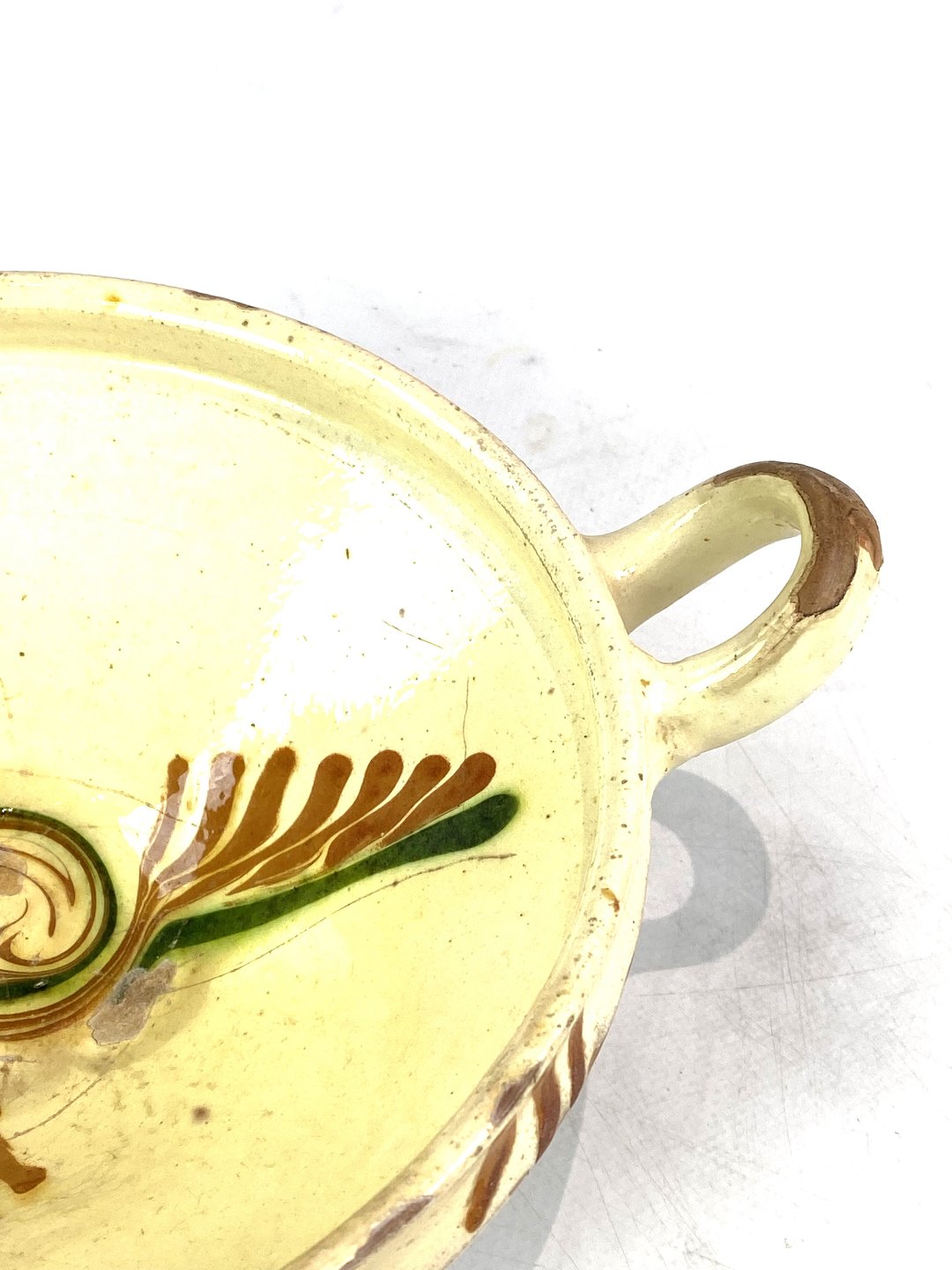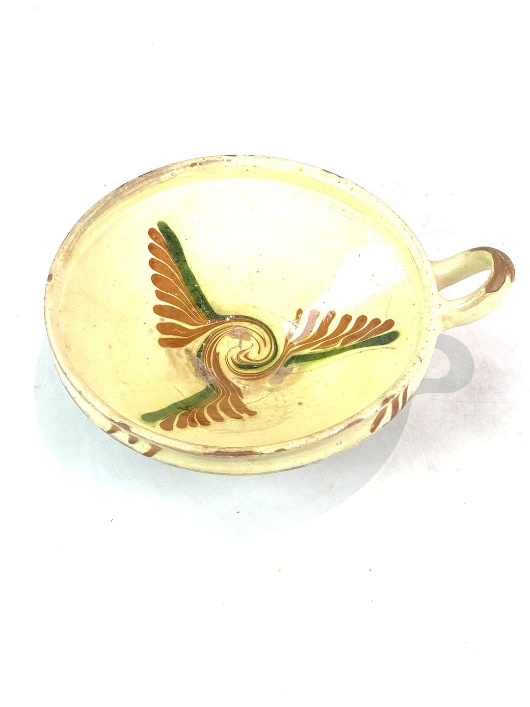Fad eller øreskål af ler med lys glasur dekoreret med mønster fra 1910erne. Fadet er i flot brugt stand.