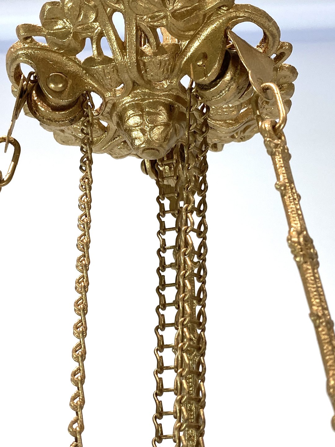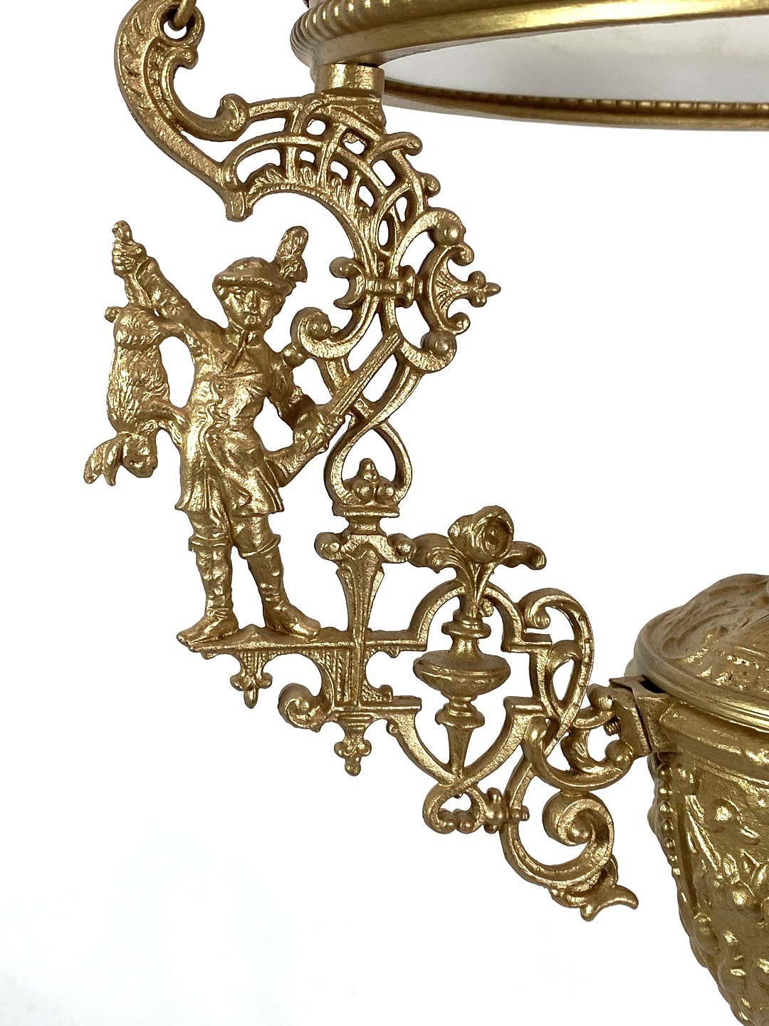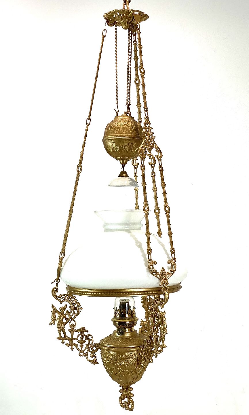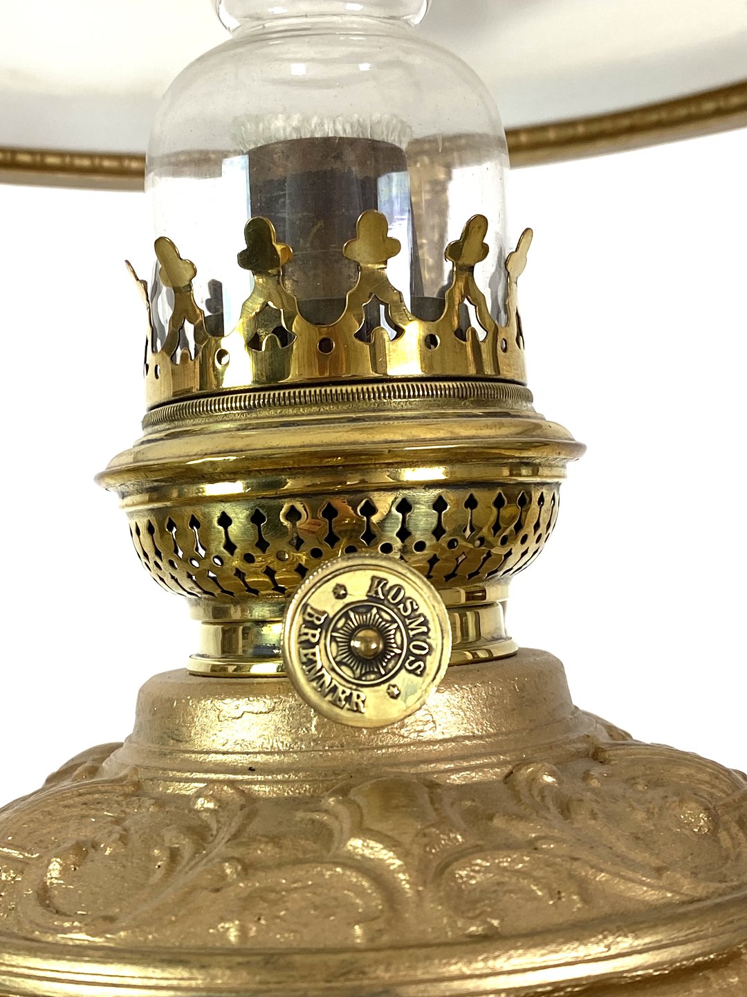 Stor petroleumslampe af patineret messing og skærm af hvid opal glass fra omkring 1880erne. Lampen er i flot antik stand.