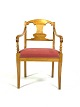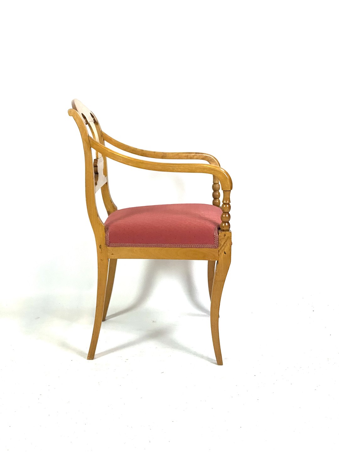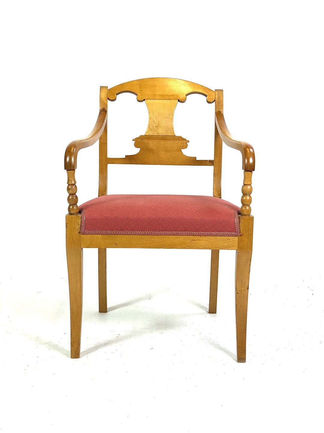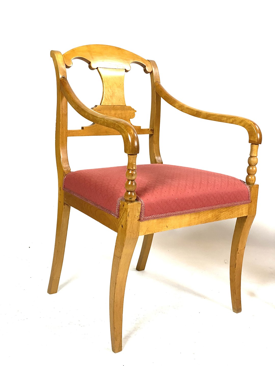 A pair of late empire armchairs in light wood, upholstered in red fabric and dating from around the 1840s, make a beautiful and period-typical addition to any interior with their classic look and historic charm.