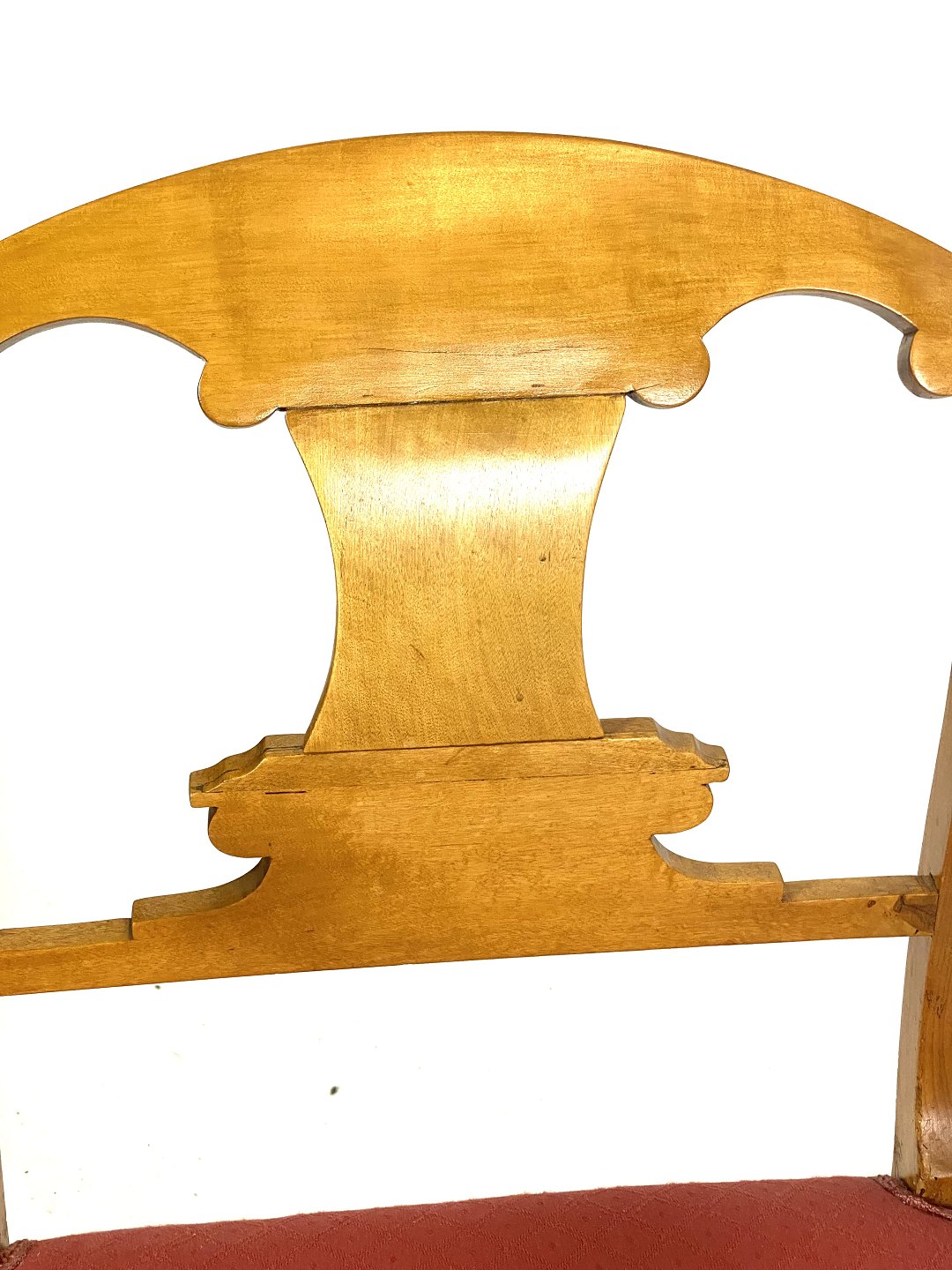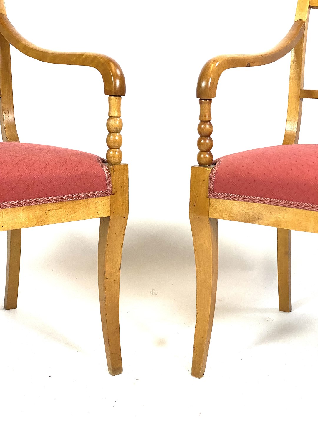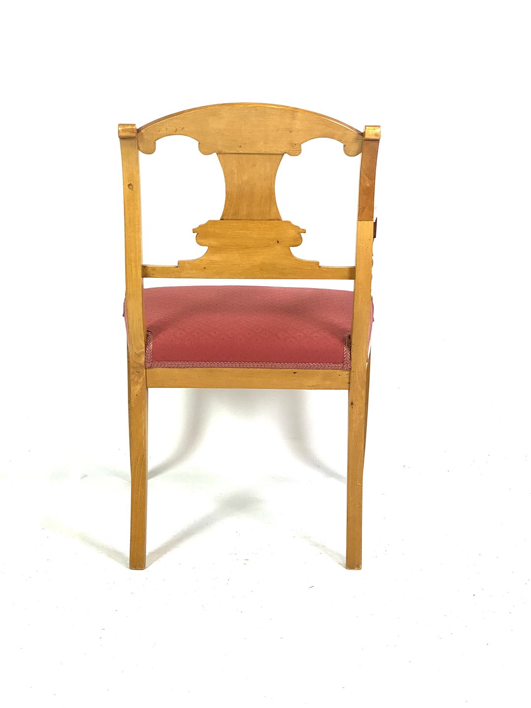 These chairs, created in the late empire style, are made of light wood, which gives them a light and elegant appearance. The red upholstery adds a warm and inviting contrast, while creating a luxurious feeling of comfort and style.