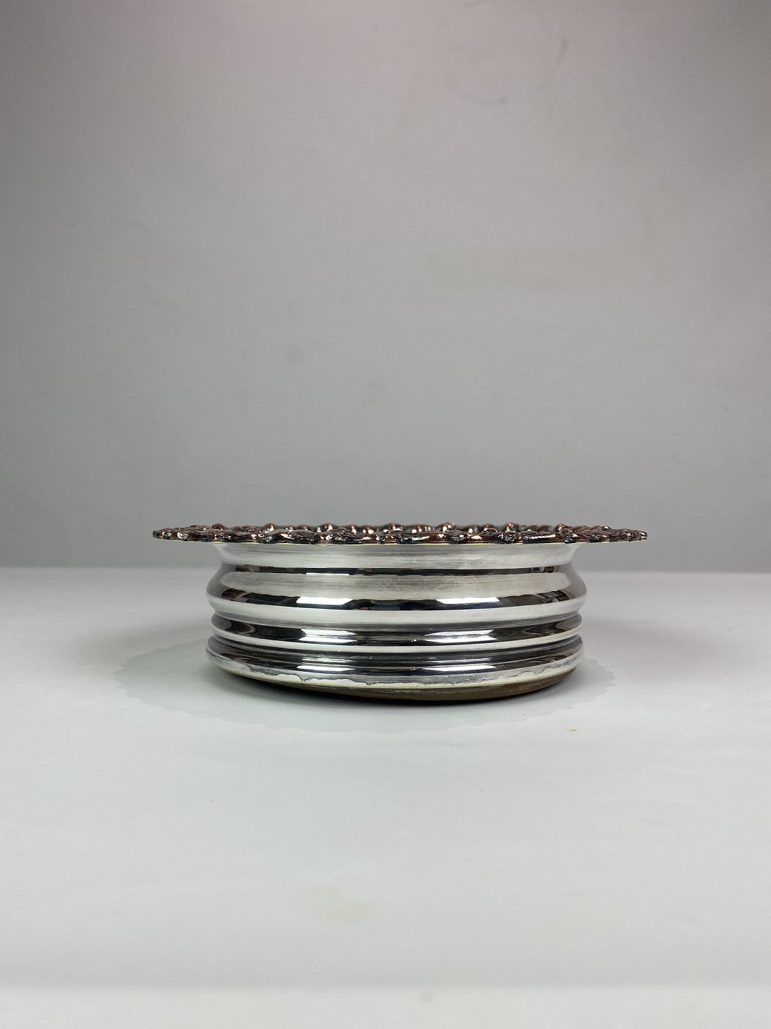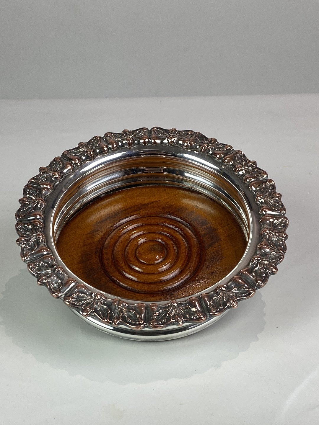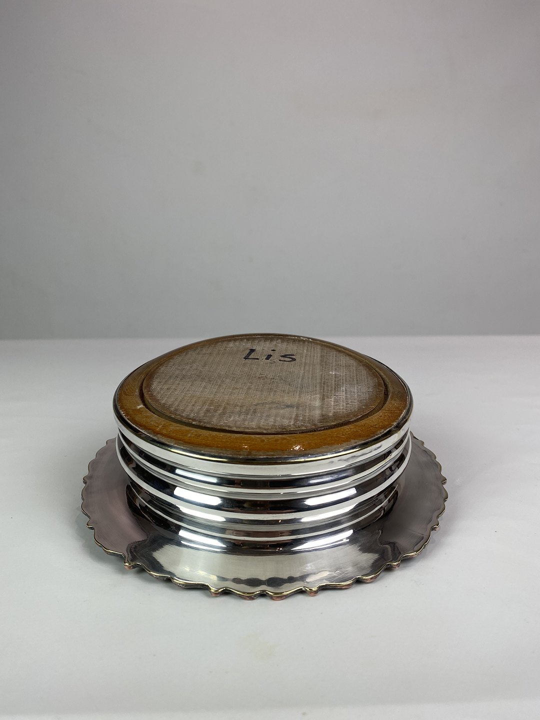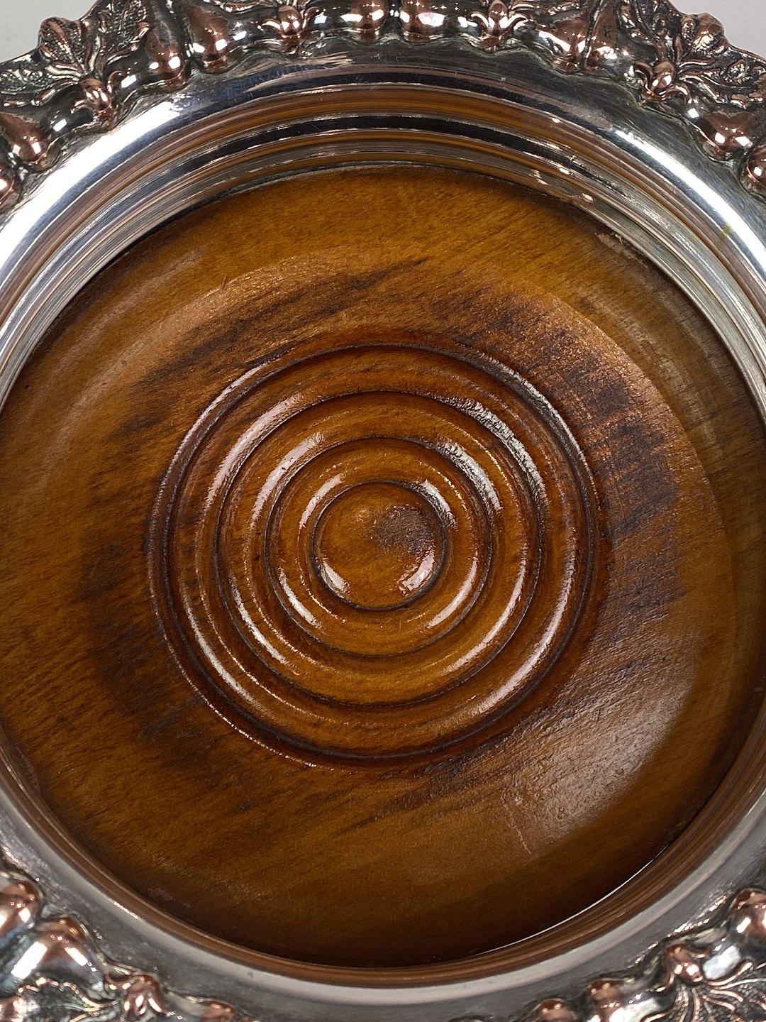 Forsølvet vinbakke med bund af træ, i flot antik stand.