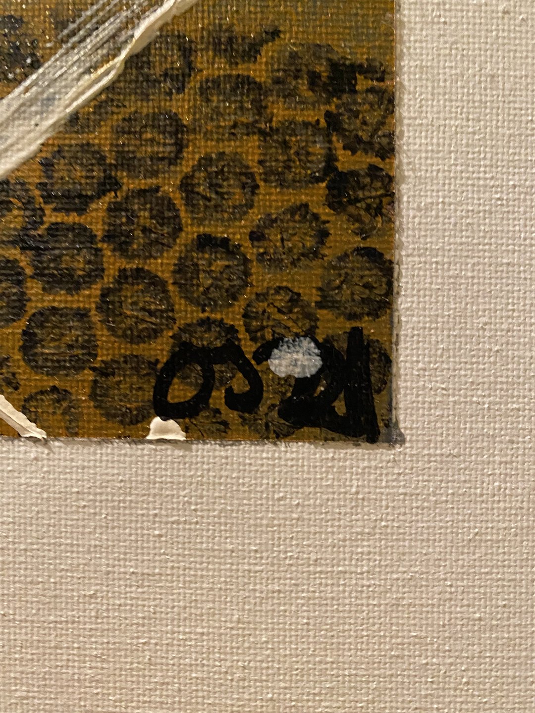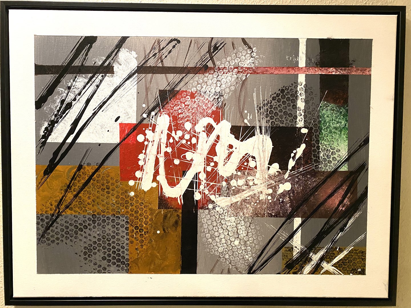 Moderne maleri på lærred med abstrakt motiv signeret O.J. 2021. Maleriet er med sort ramme.