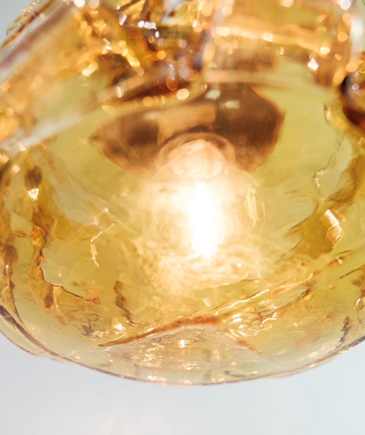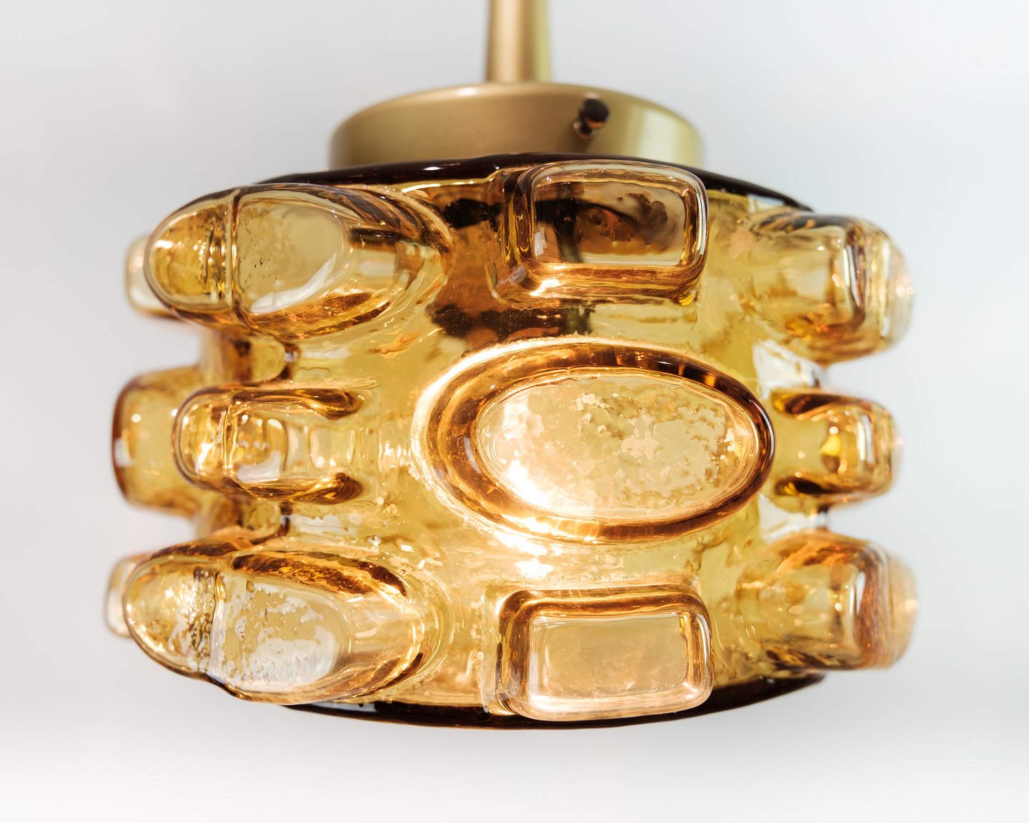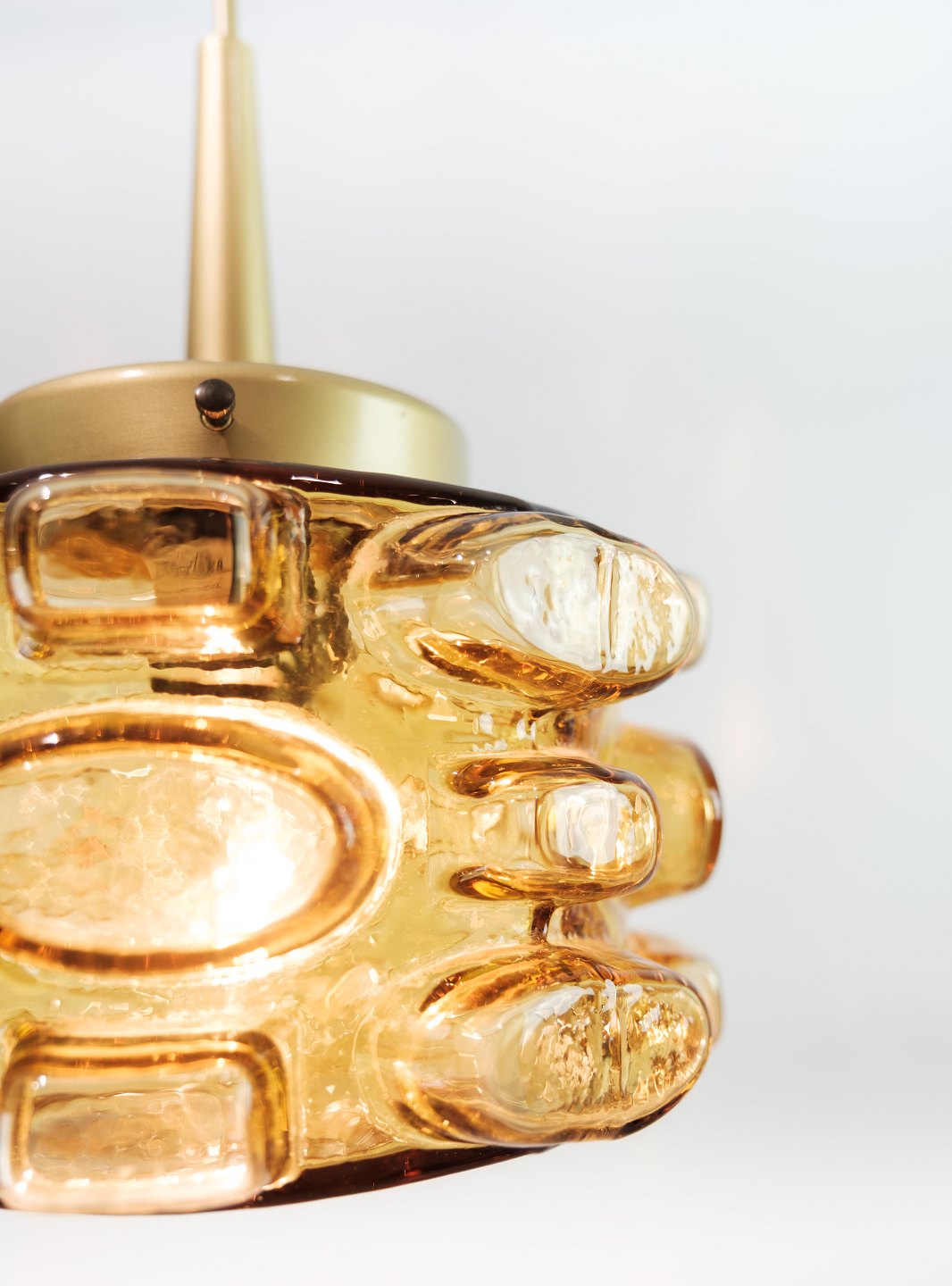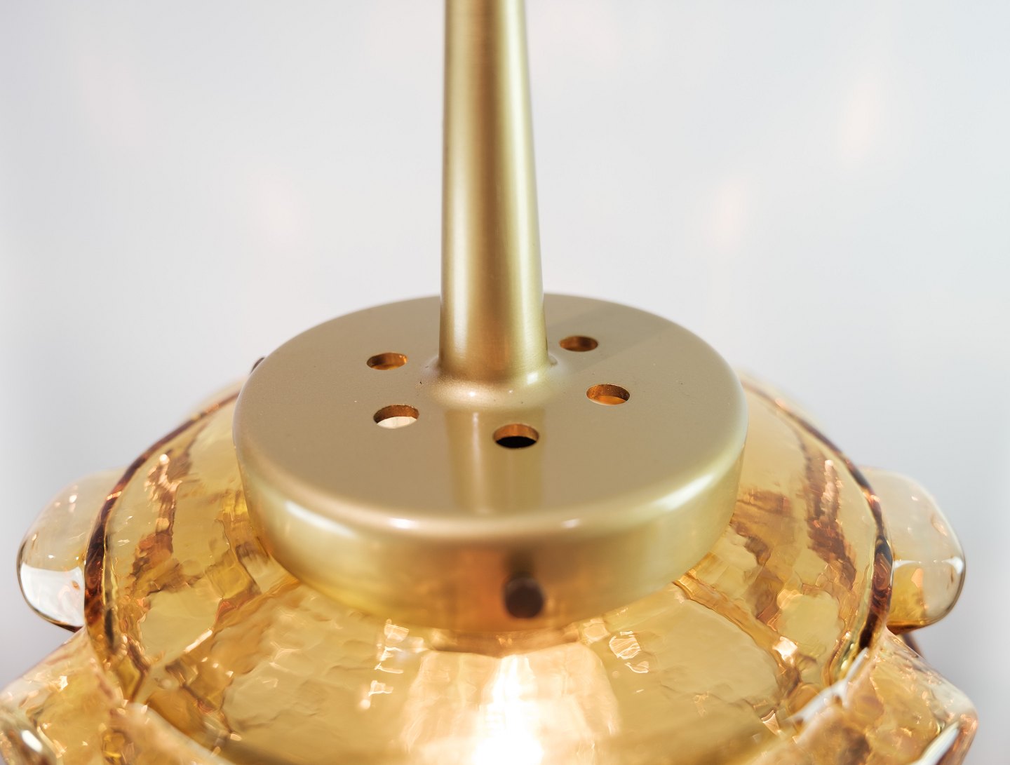 SolgtGlasloftslampe med messingelementer og honningfarvet glas fremstillet i Danmark i 1960'erne. Står i meget god vintage stand.
