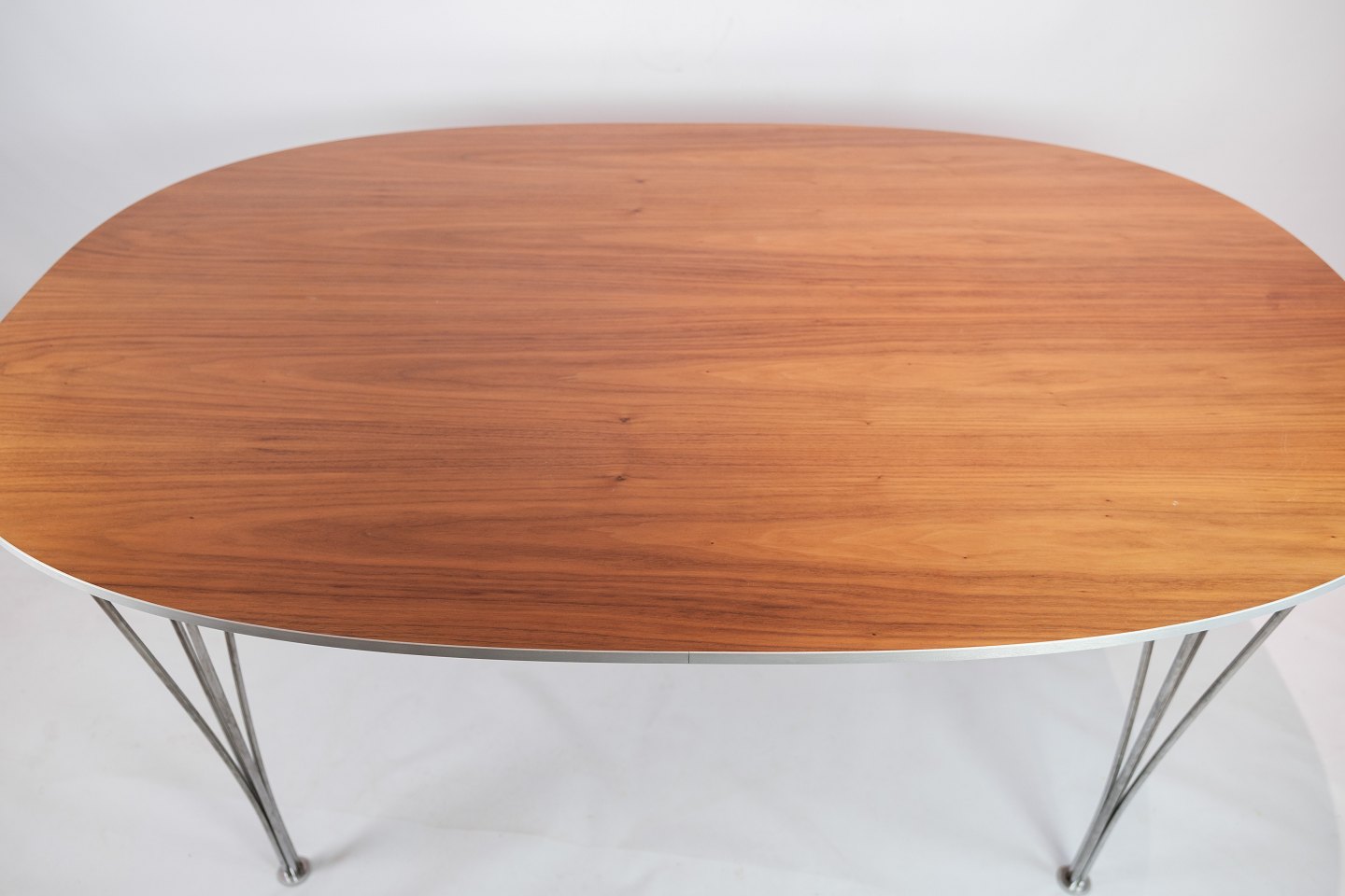 Piet Hein bord, model B612 med valnød overflade og stål ben. 5000m2 udstilling