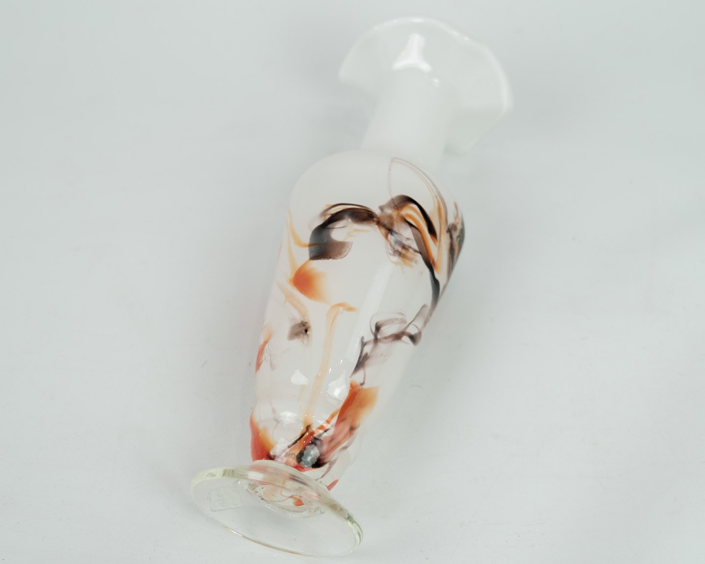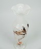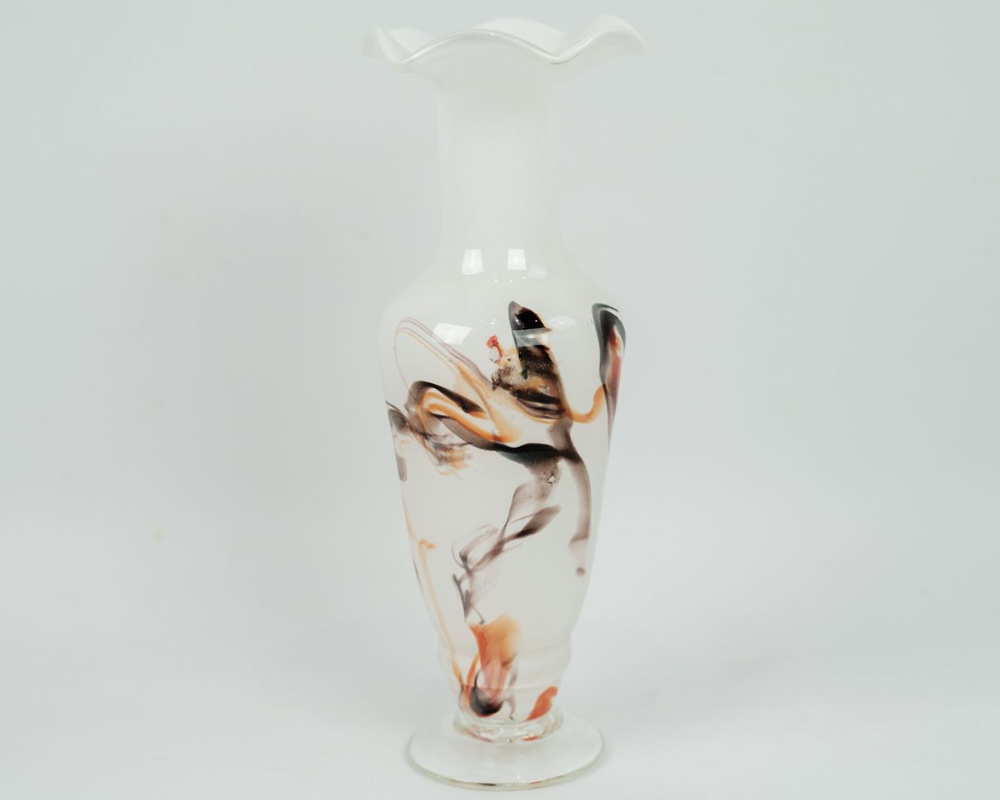 En mælkehvid vase med sammensætningen af gyldne farver fra omkring 1970'erne. Står i god stand uden skader.
