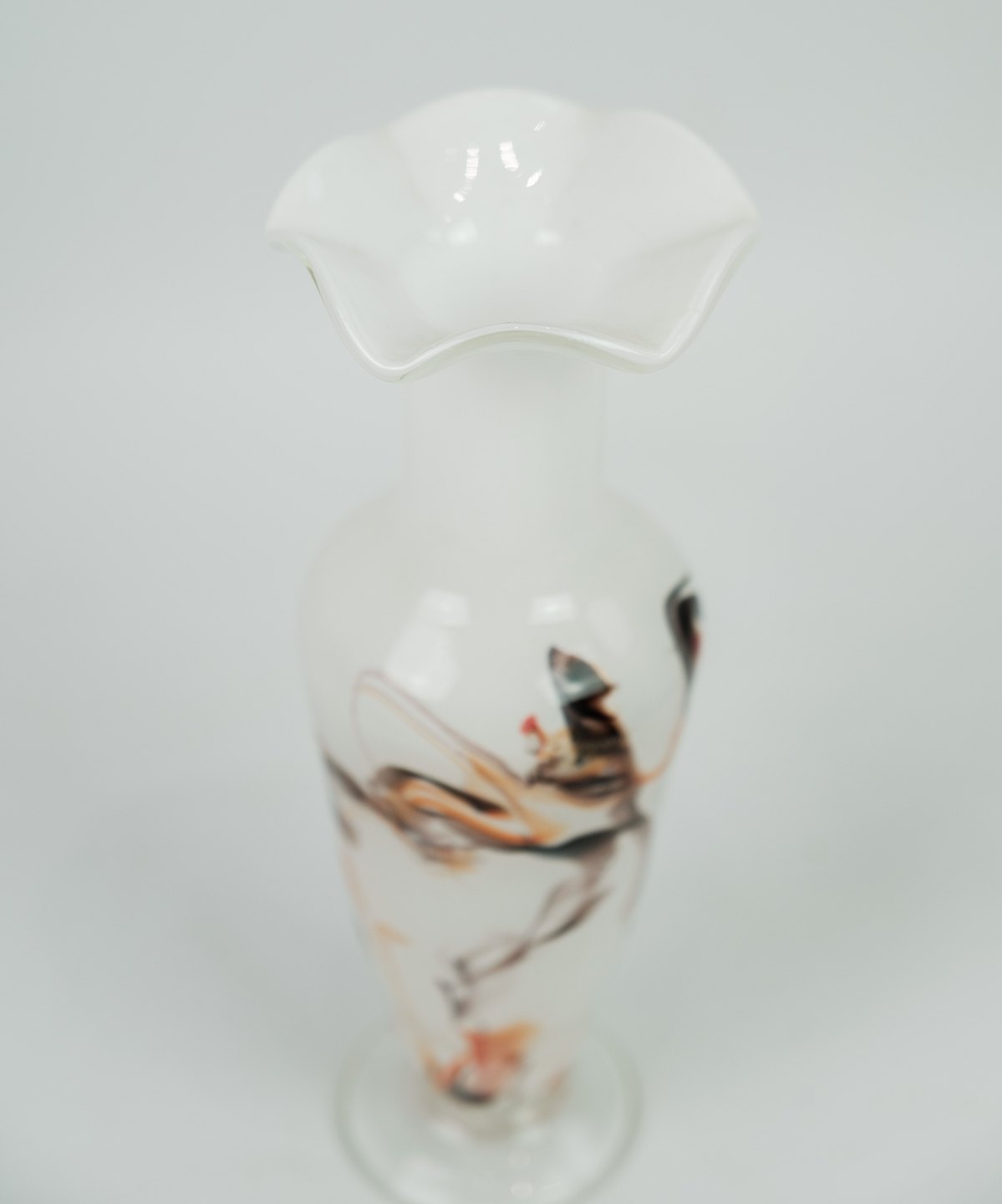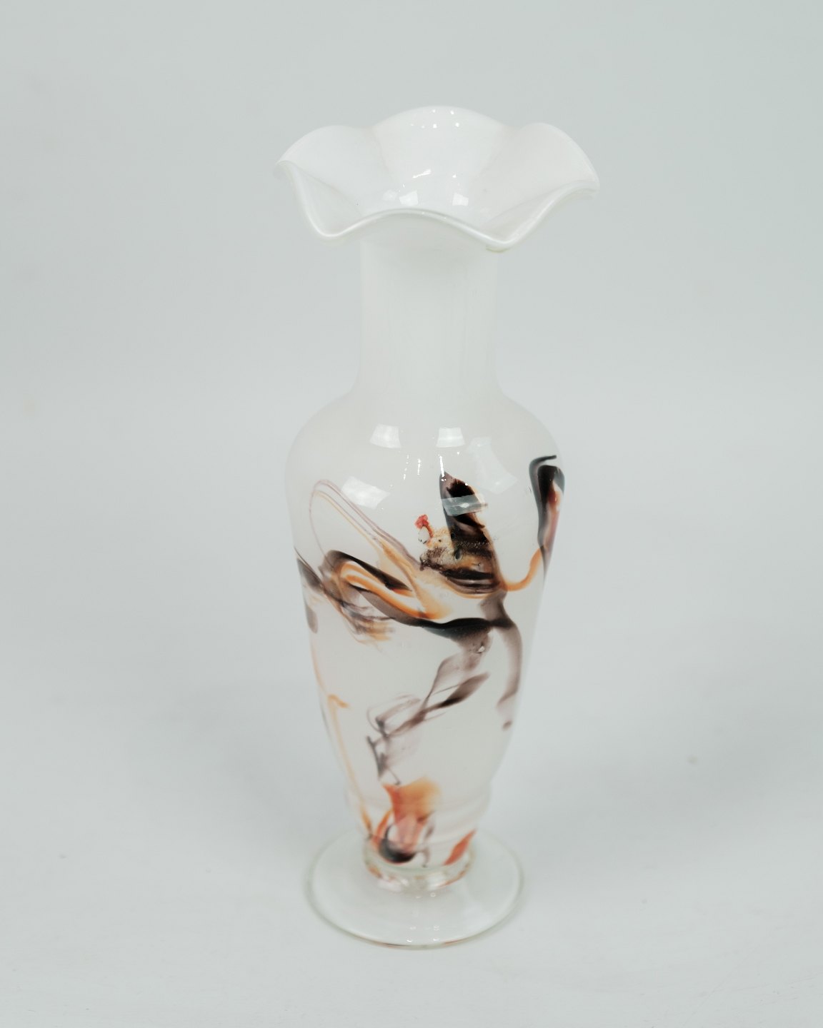 En mælke hvid vase med sammensætningen af gyldne farver fra omkring 1970'erne.
