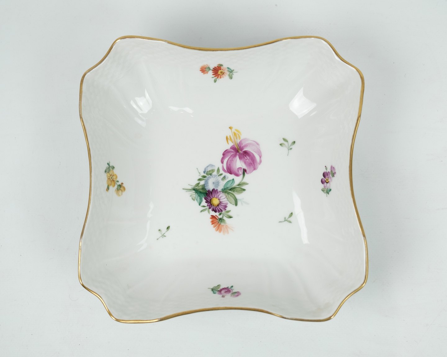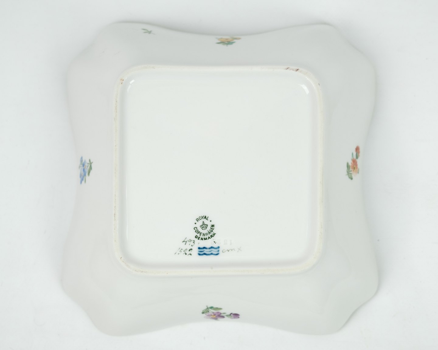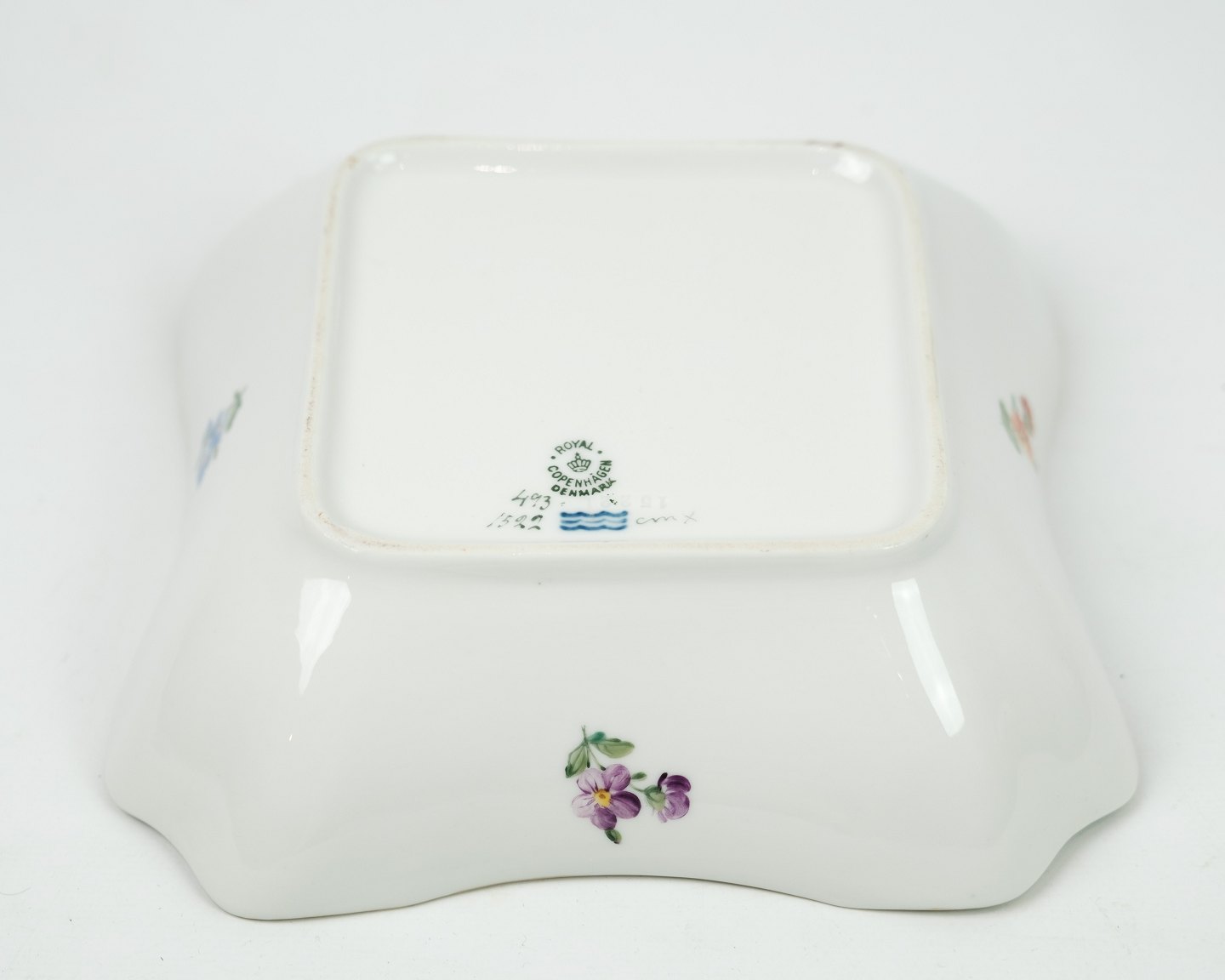 Kgl. firkantet skål oprindeligt brugt som kartoffel skål i mønstret saksisk blomst nr. 1522. Fremstår uden skader