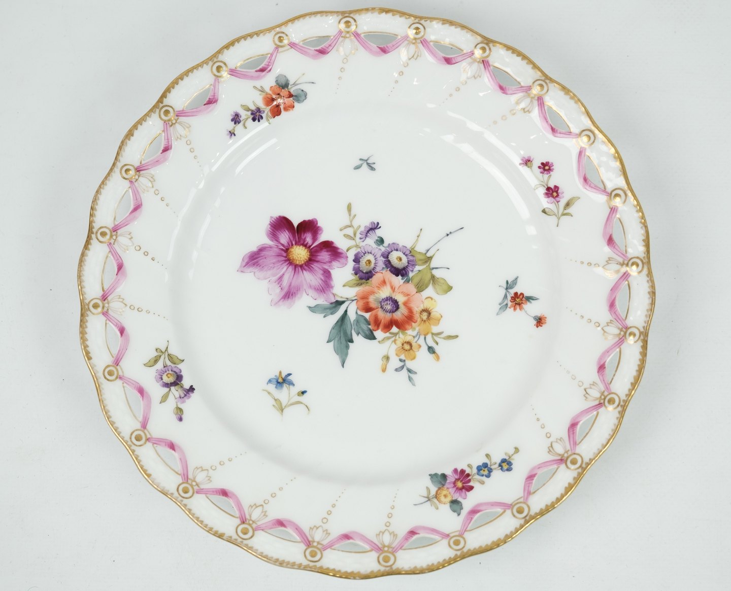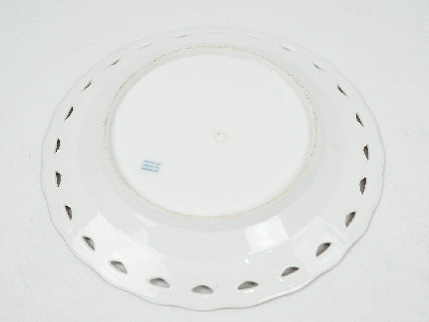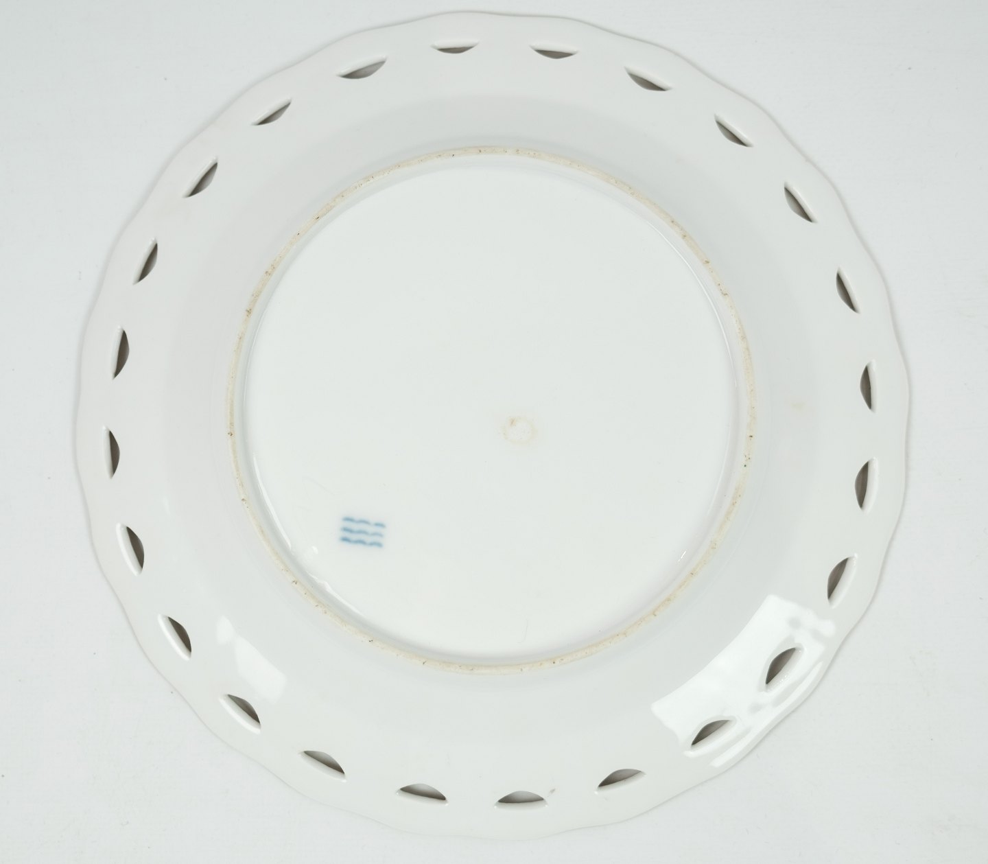 Antik kongelig tallerken gennembrudt i mønstret saksisk blomst med 3 bølger. De 3 bølger indikere at det er noget af de første den kongelige porcelænsfabrik lavede i dette mønster. Yderst sjælden fremstår hel og uden skader