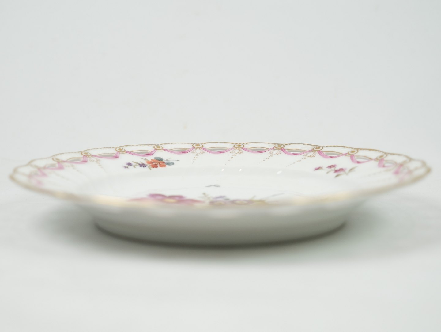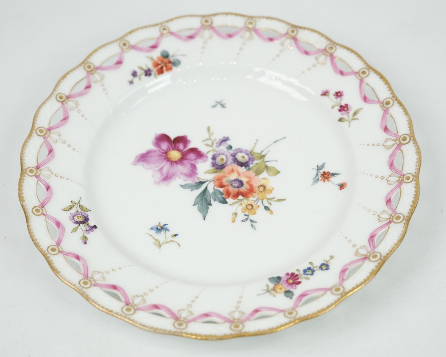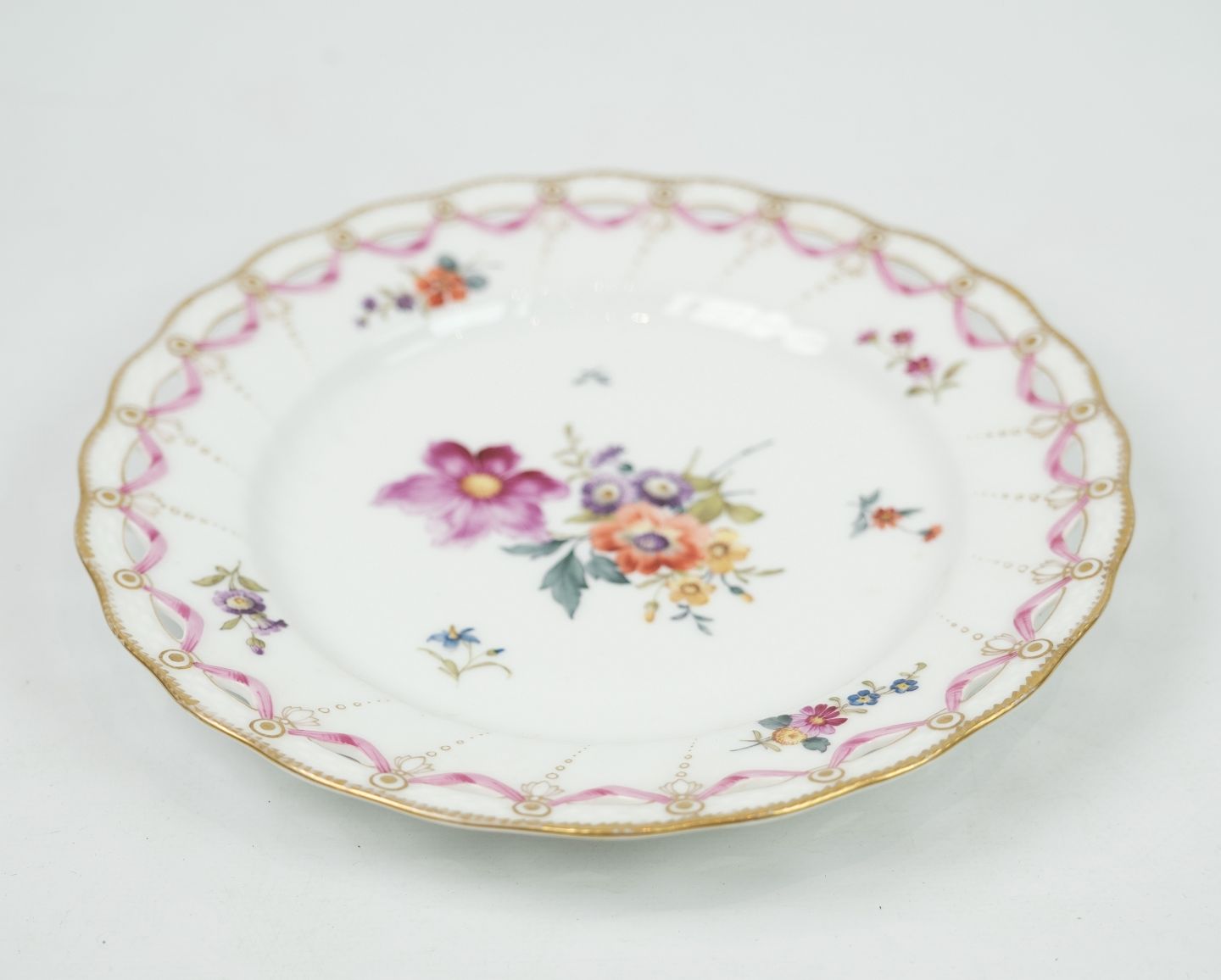 Antik kongelig tallerken gennembrudt i mønstret saksisk blomst med 3 bølger. De 3 bølger indikere at det er noget af de første den kongelige porcelænsfabrik lavede i dette mønster. Yderst sjælden fremstår hel og uden skader