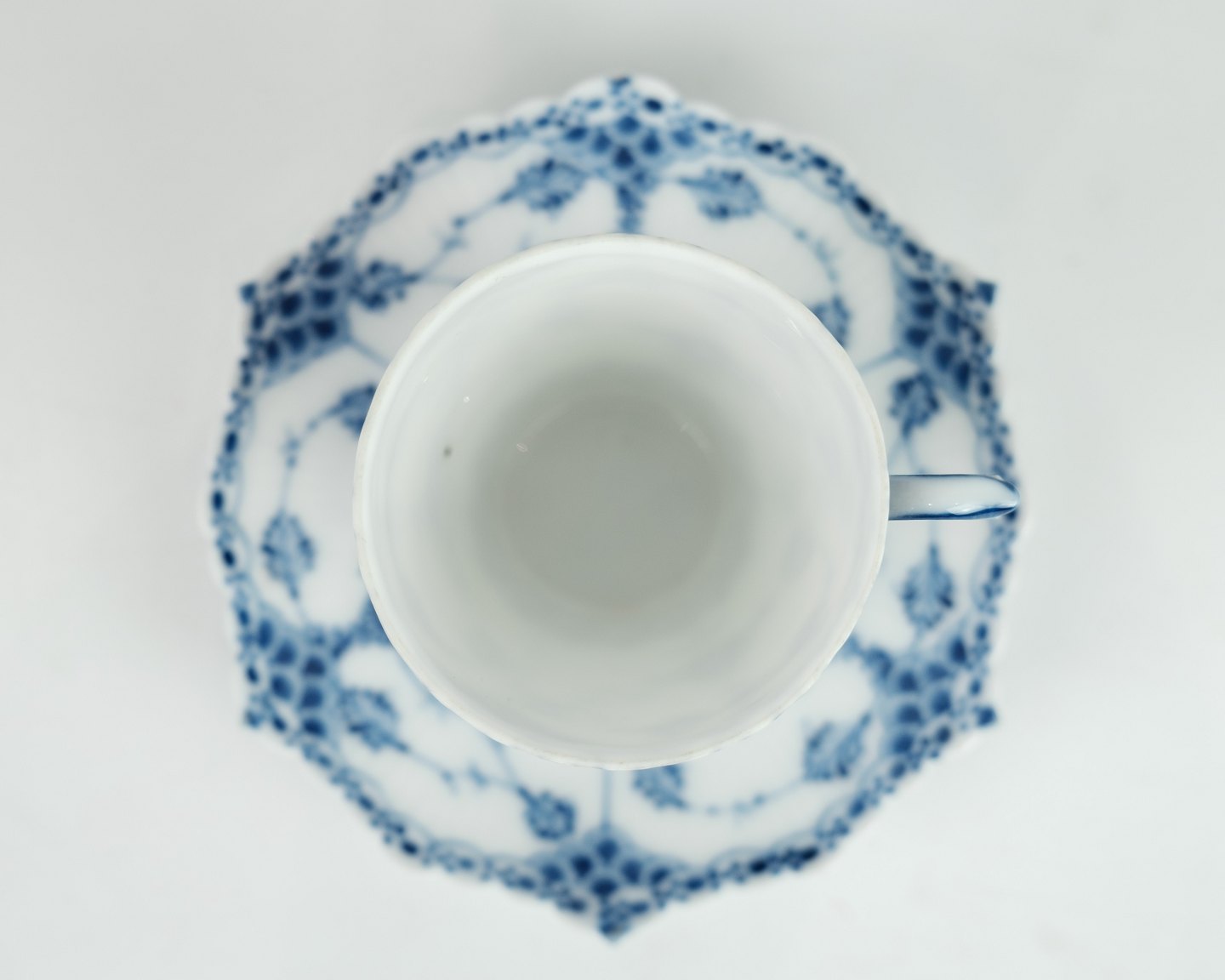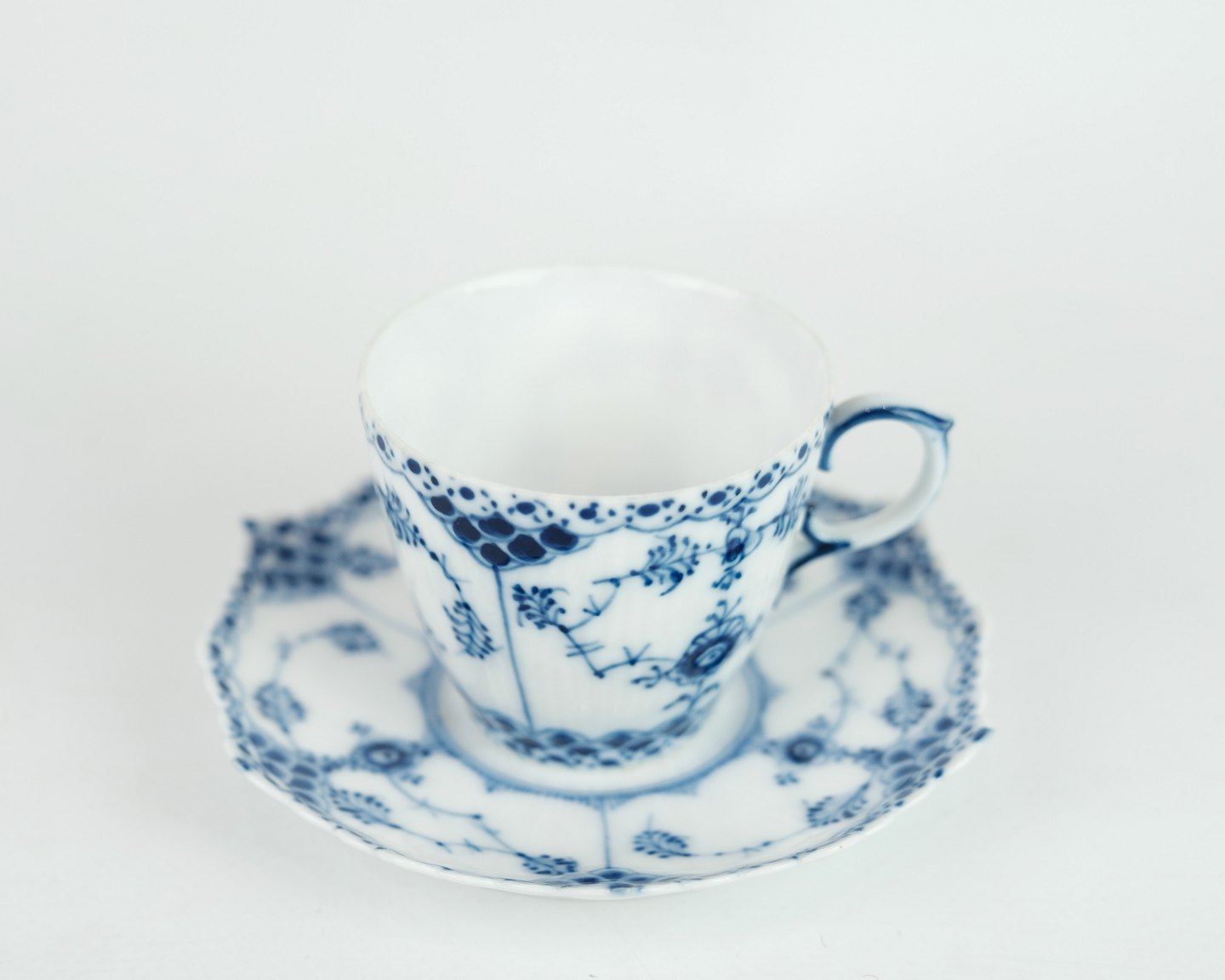 SoldRoyal Copenhagen Blue Fluted Full Lace, small espresso cup with accompanying saucer no. 1/1038. The item is in very fine used condition