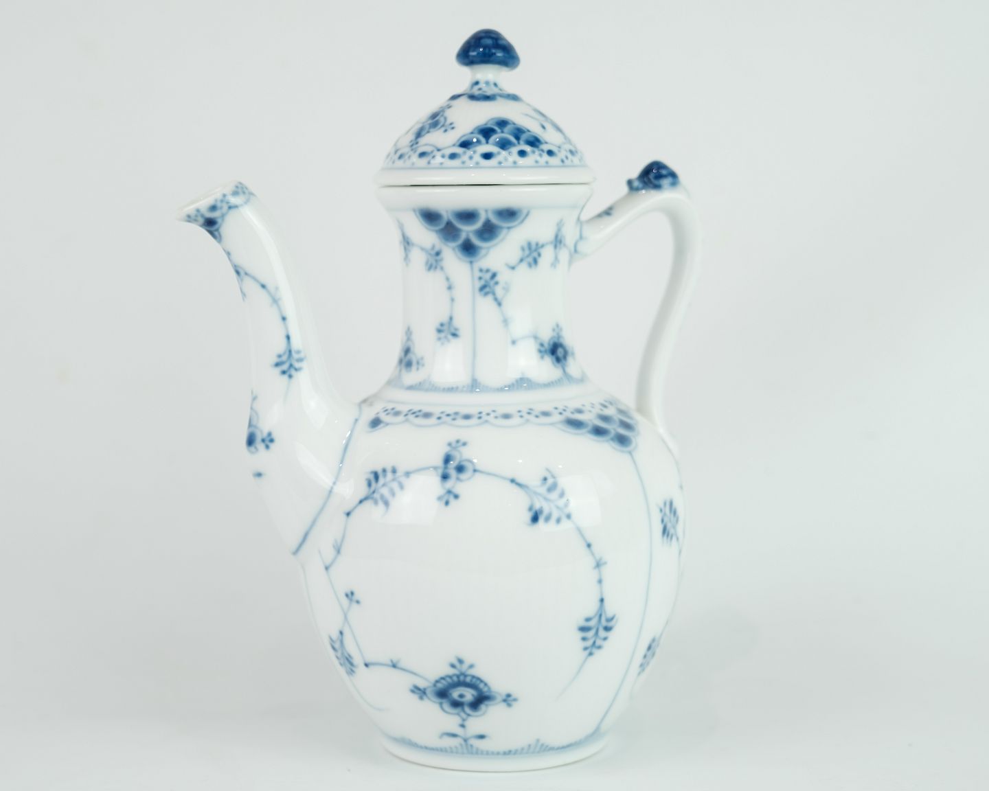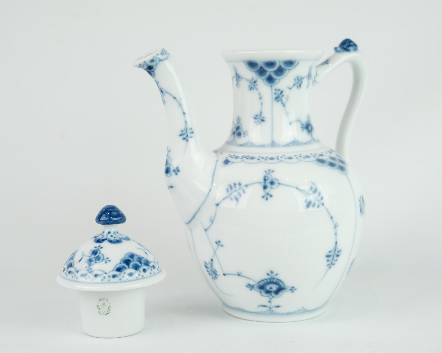 Royal Copenhagen kongelig musselmalet halvblonde kaffekande nr. 1/518. Står i meget fin brugt stand