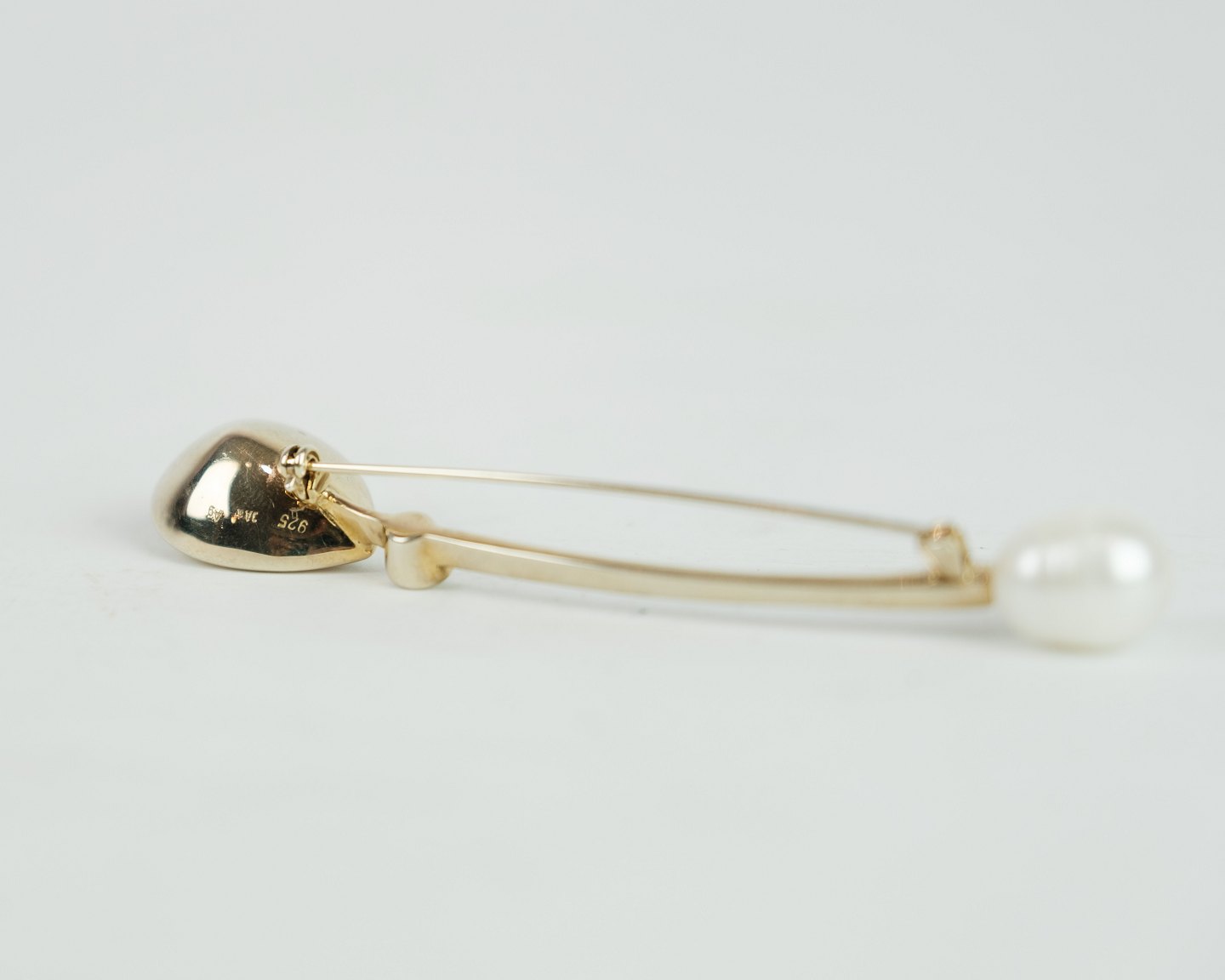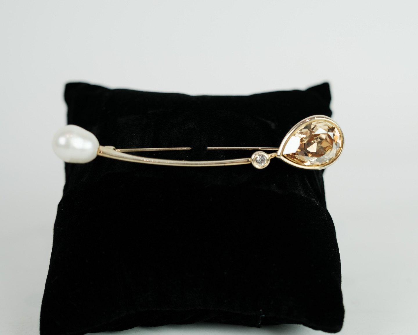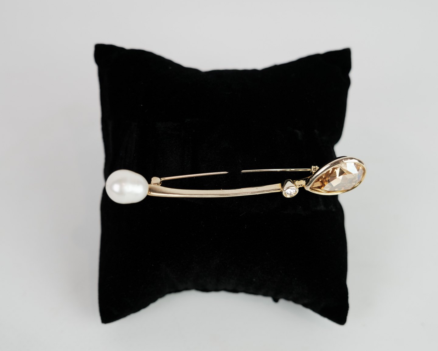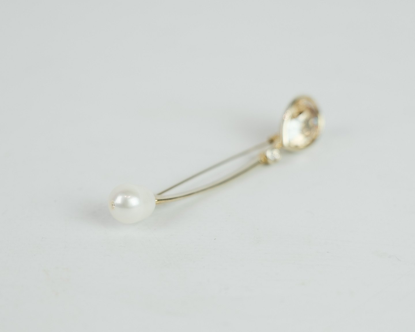 SolgtBroche sølv forskyldt prydet med stor flot citrin, samt stor natur perle og indfattet syntetisk diamant. Stemplet J.Aa (Jens Aagaard). 925 AG. Startede sin karriere i 1947.