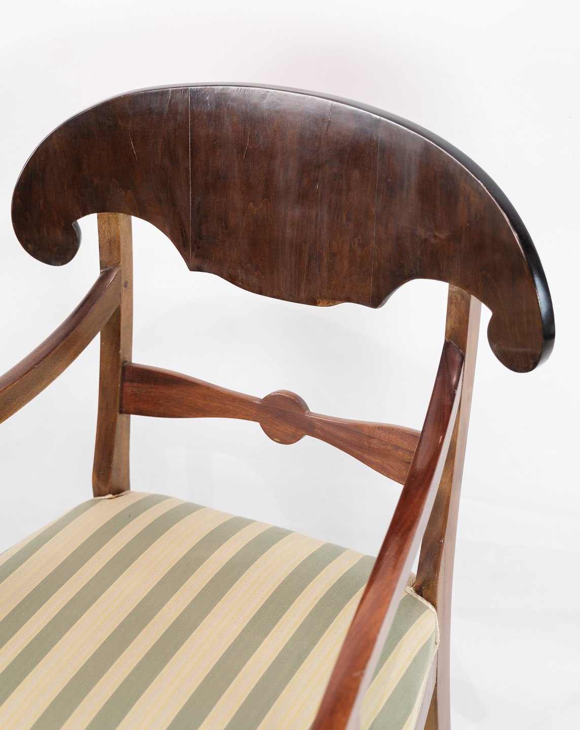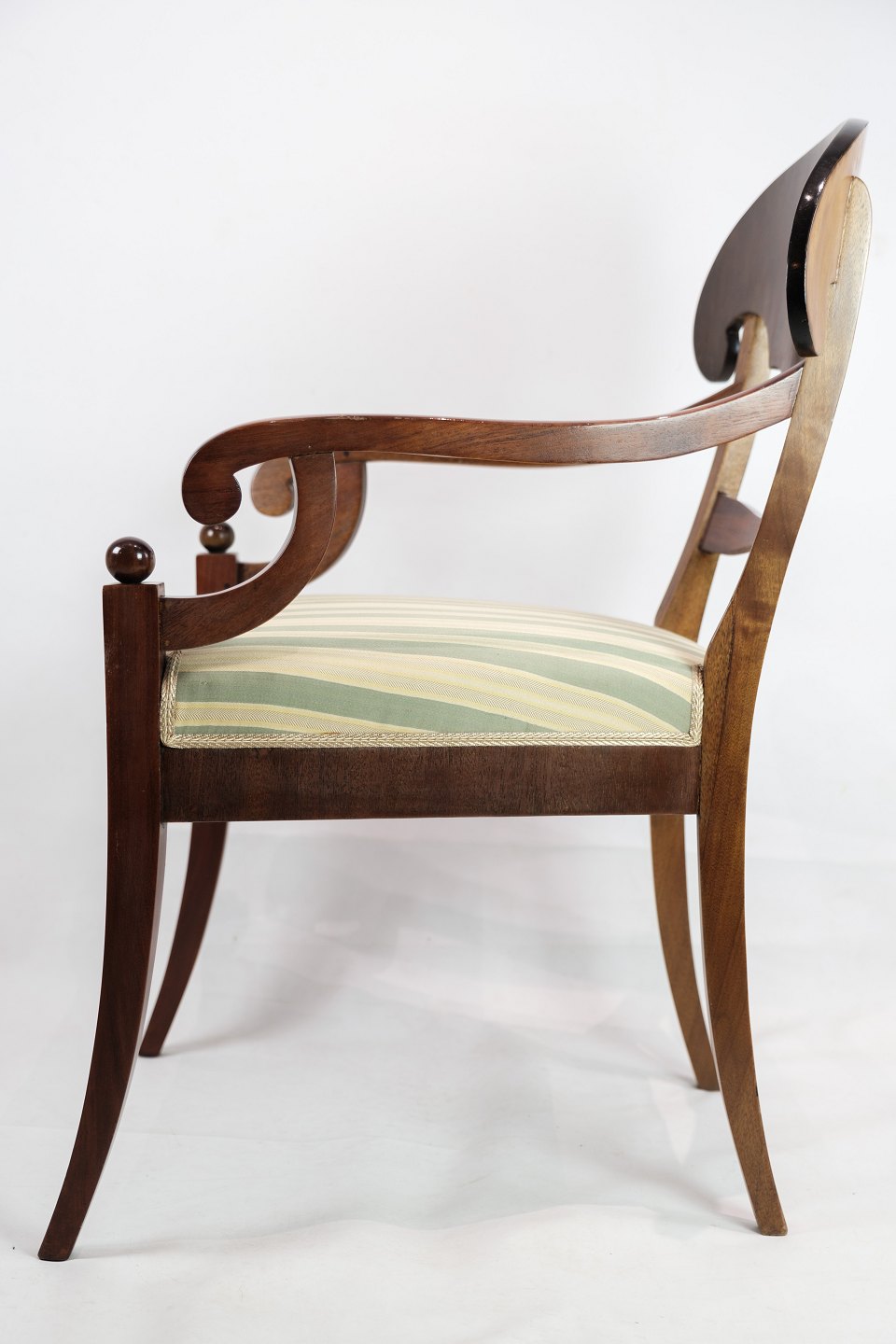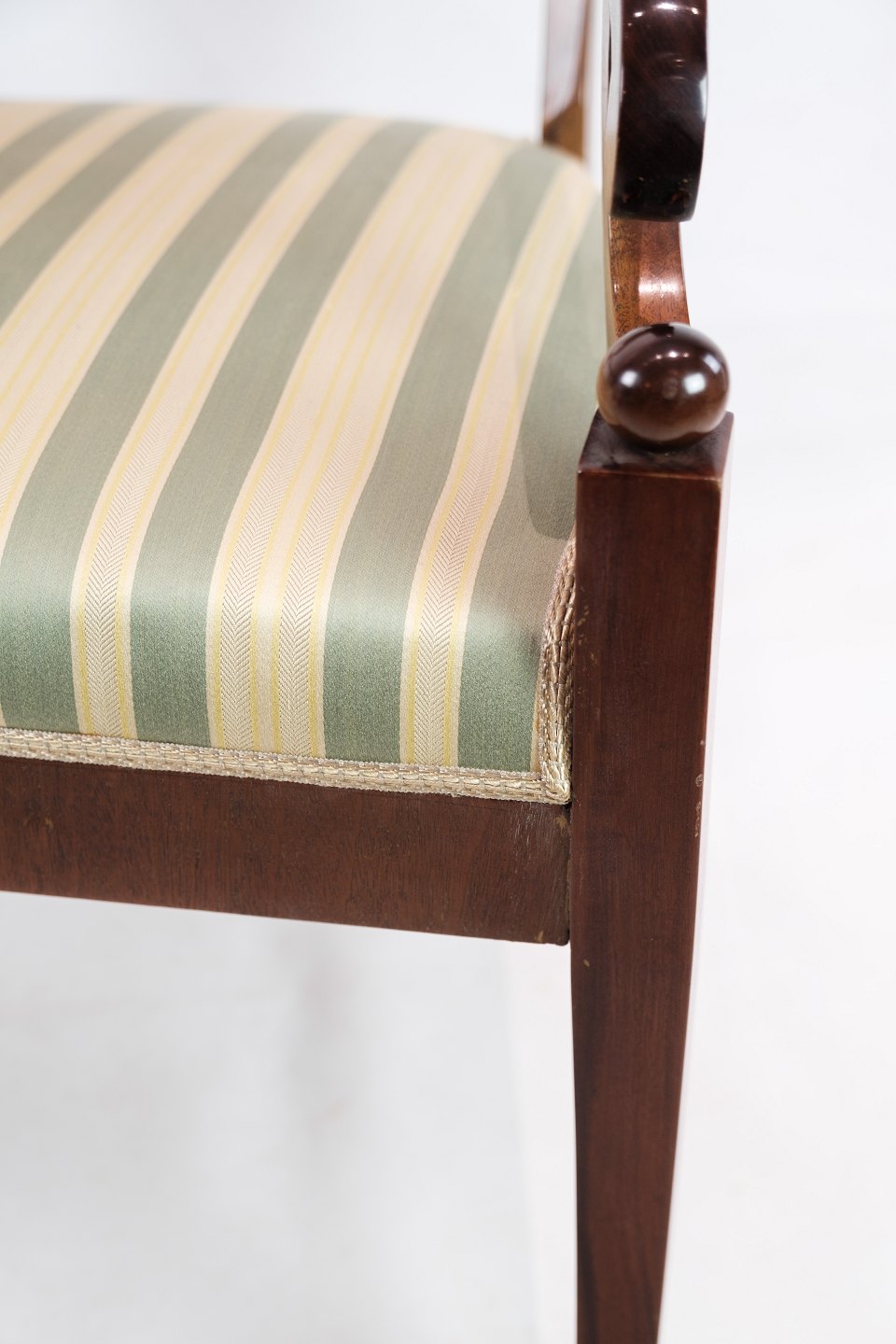 SolgtSen empire armstol i mahogni med lyst stribet stof fra omkring år 1840. Står i meget fin brugt stand.