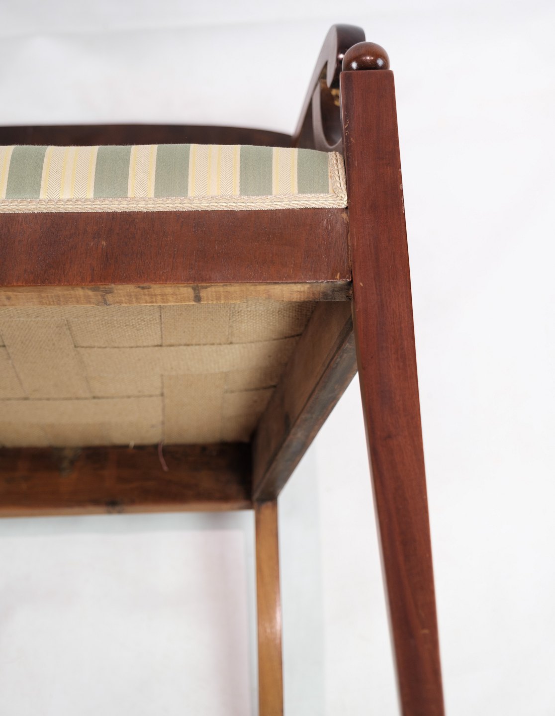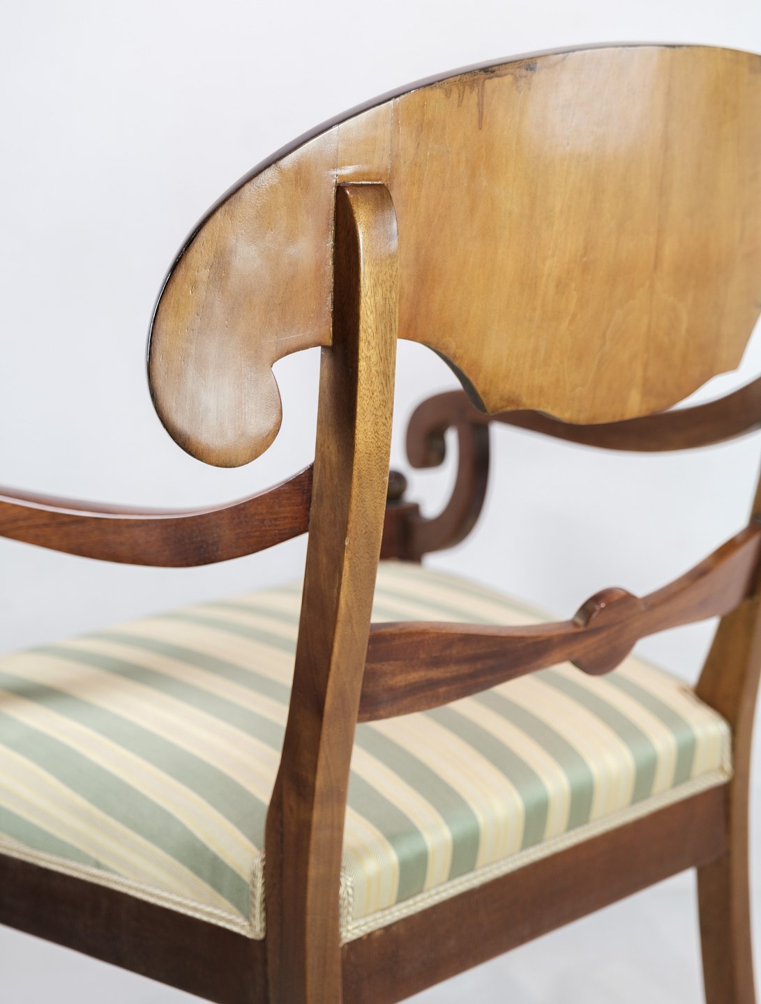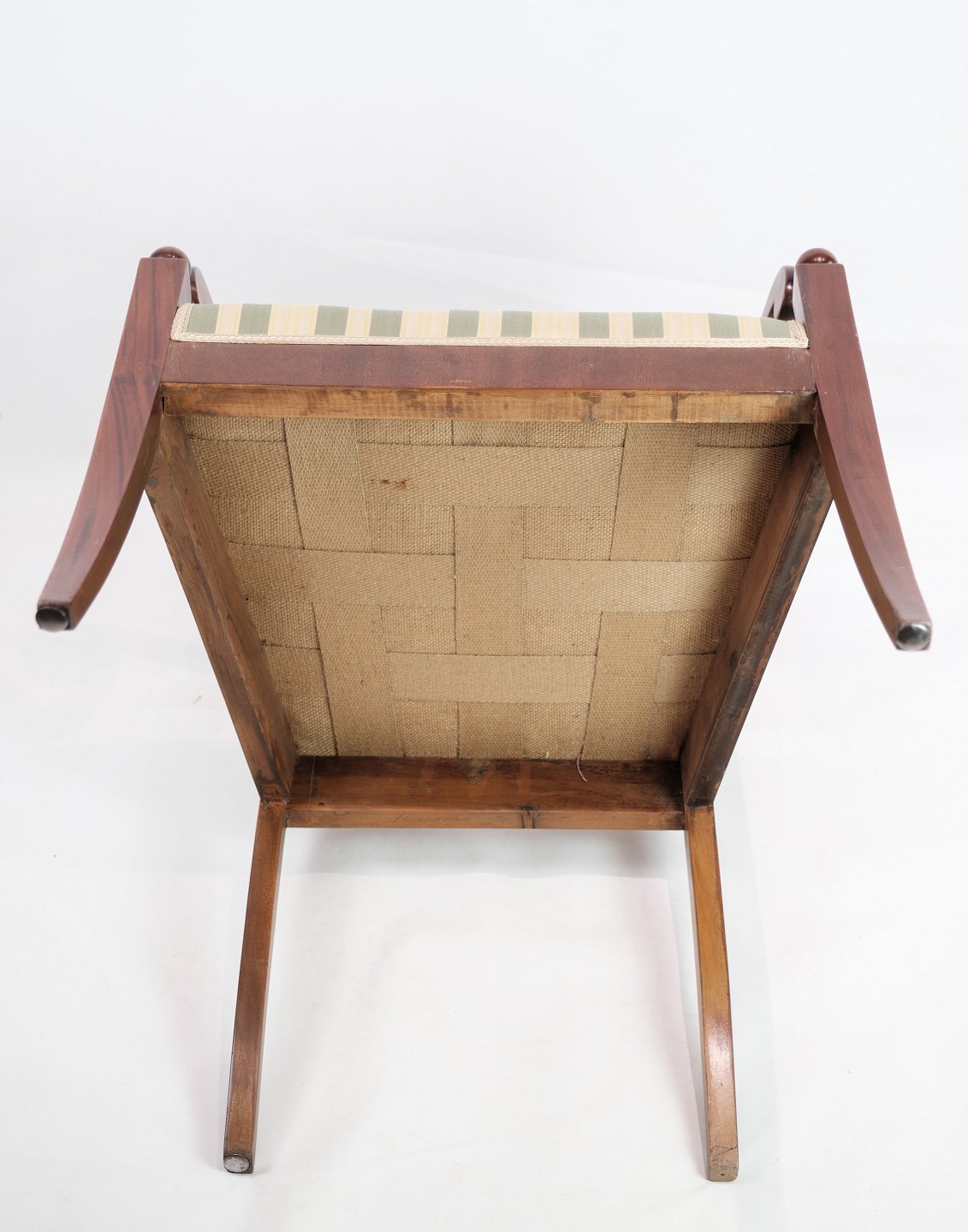 SolgtSen empire armstol i mahogni med lyst stribet stof fra omkring år 1840. Står i meget fin brugt stand.